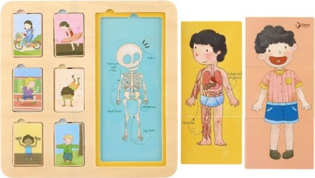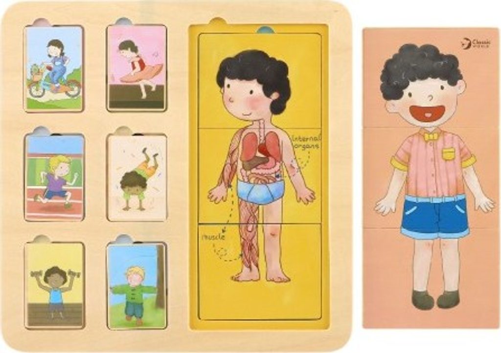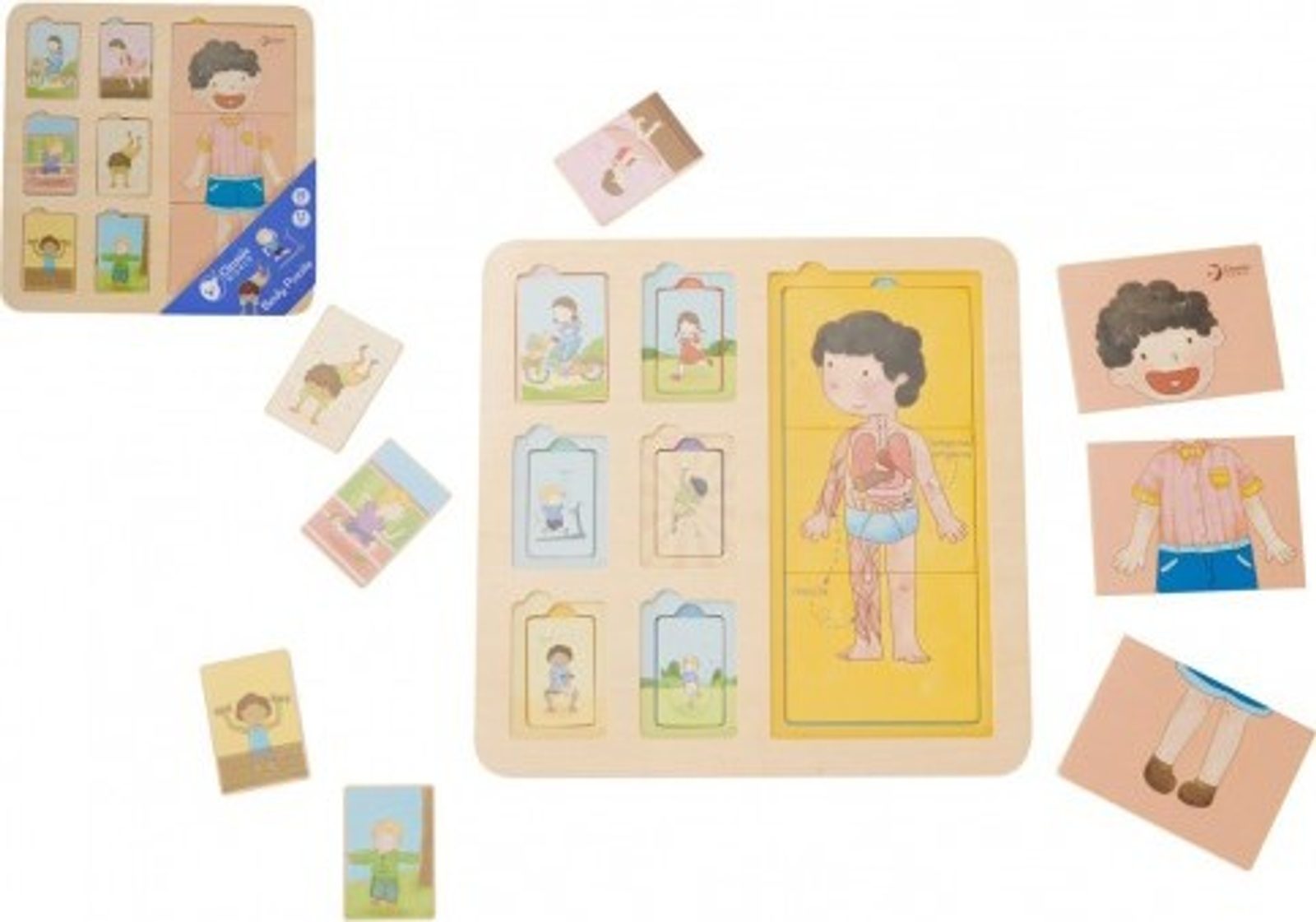 Puzzle lidské tělo má tři vrstvy. Zobrazuje strukturu těla ze svalů, orgánů a kostí. Děti mají možnost prozkoumat lidské tělo. Puzzle obsahuje 19 dřevěných dílů (včetně podložky). Rozměr podložky: 30 x 30 cm Vhodné pro děti od 12 měsíců