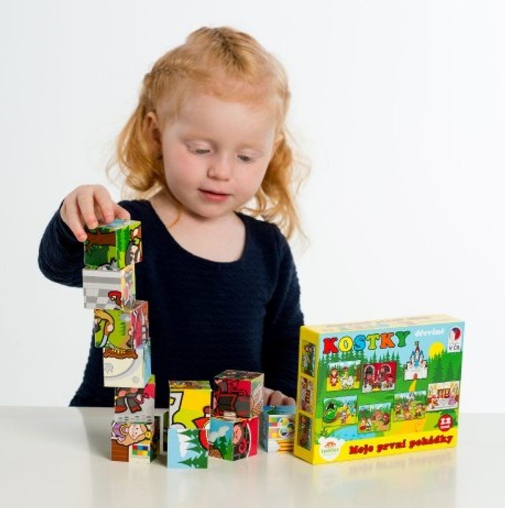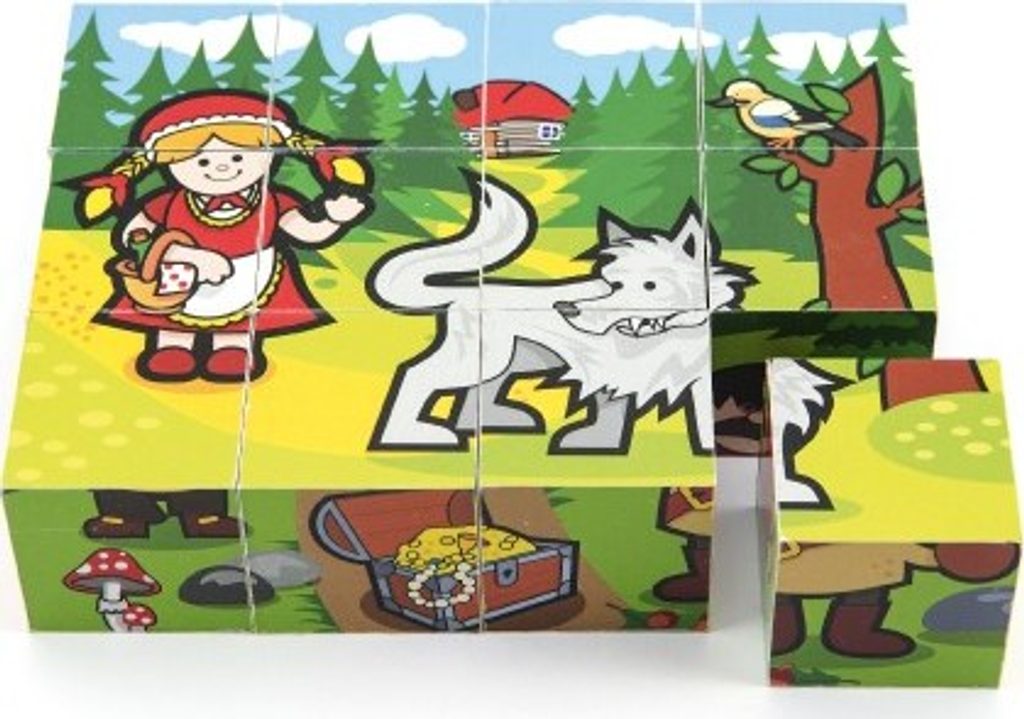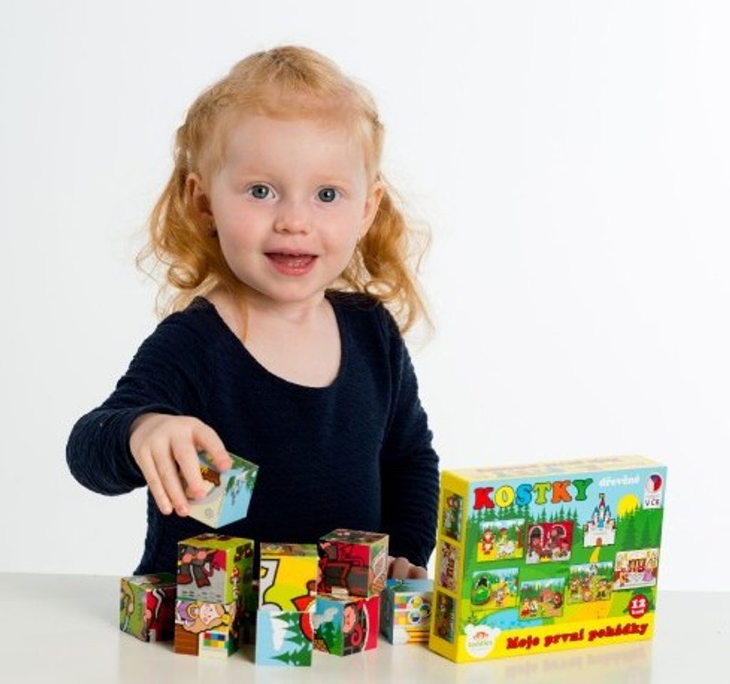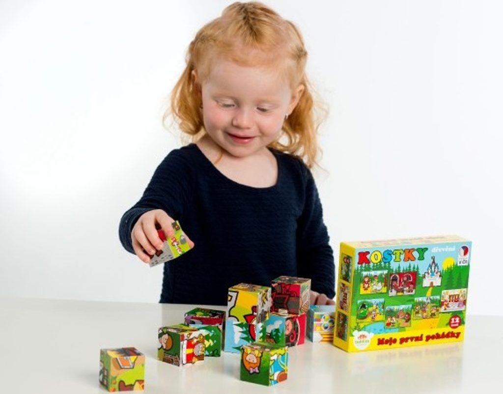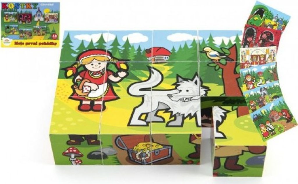 Dřevěné kostky s barevnými obrázky na motivy klasických pohádek jsou výbornou volbou pro nejmenší.
