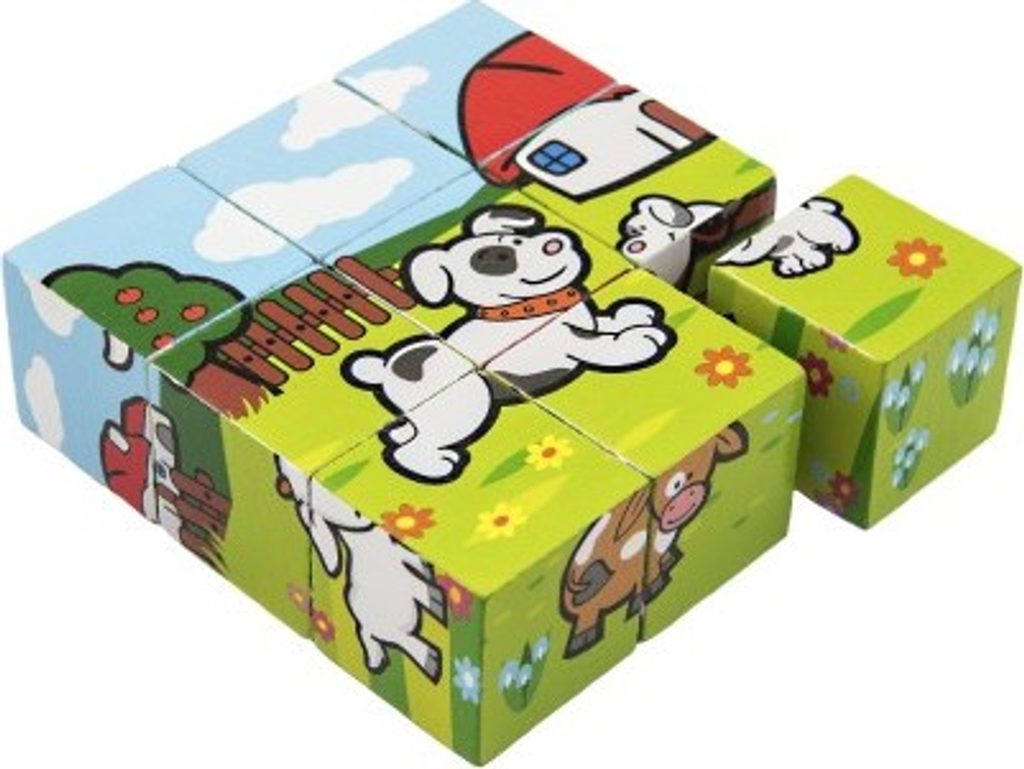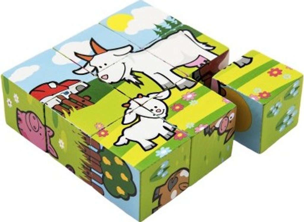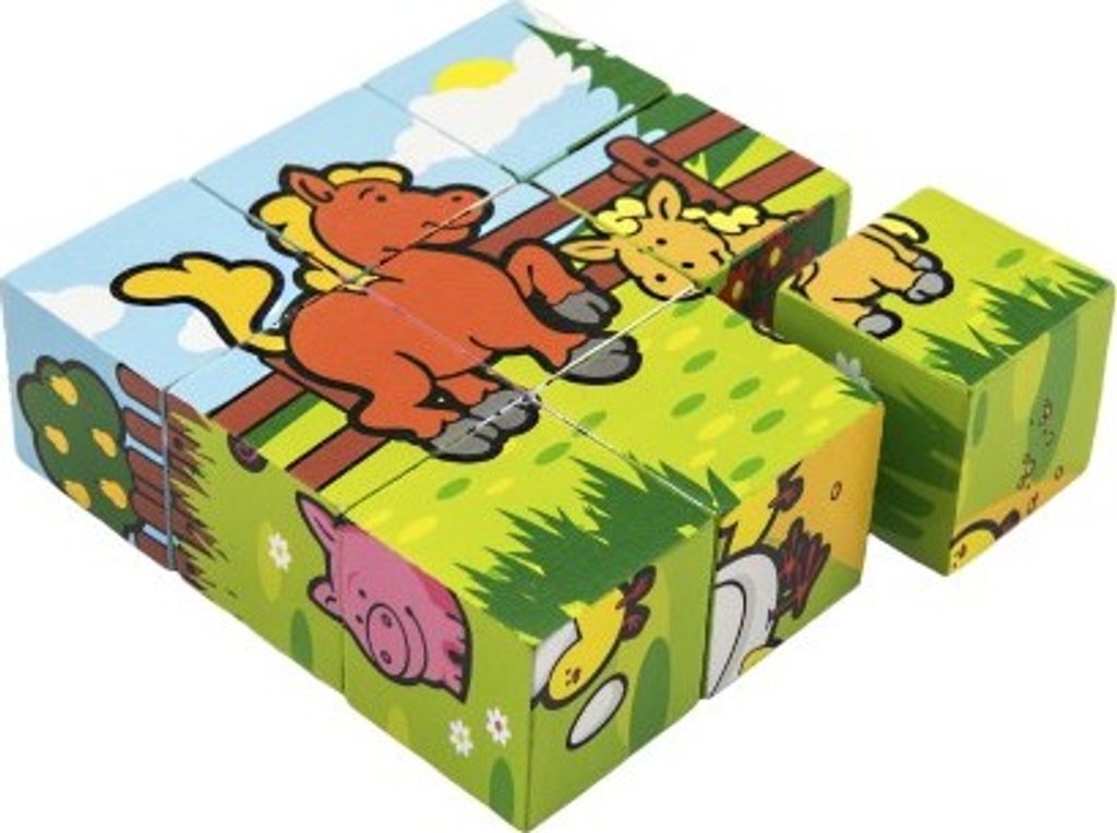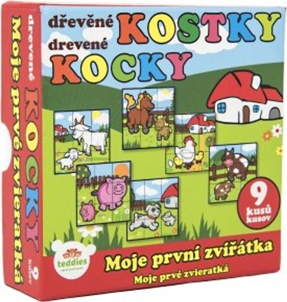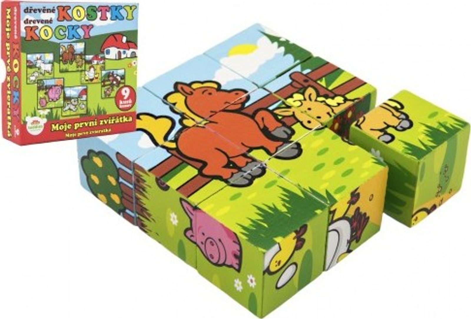 Dřevěné kostky s barevnými obrázky domácích zvířátek jsou výborná volba pro nejmenší.
