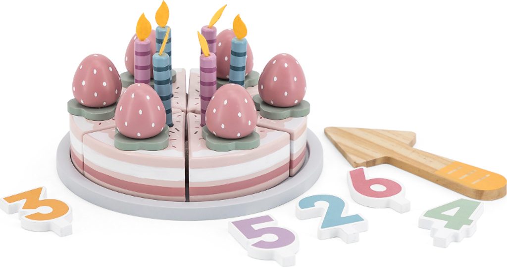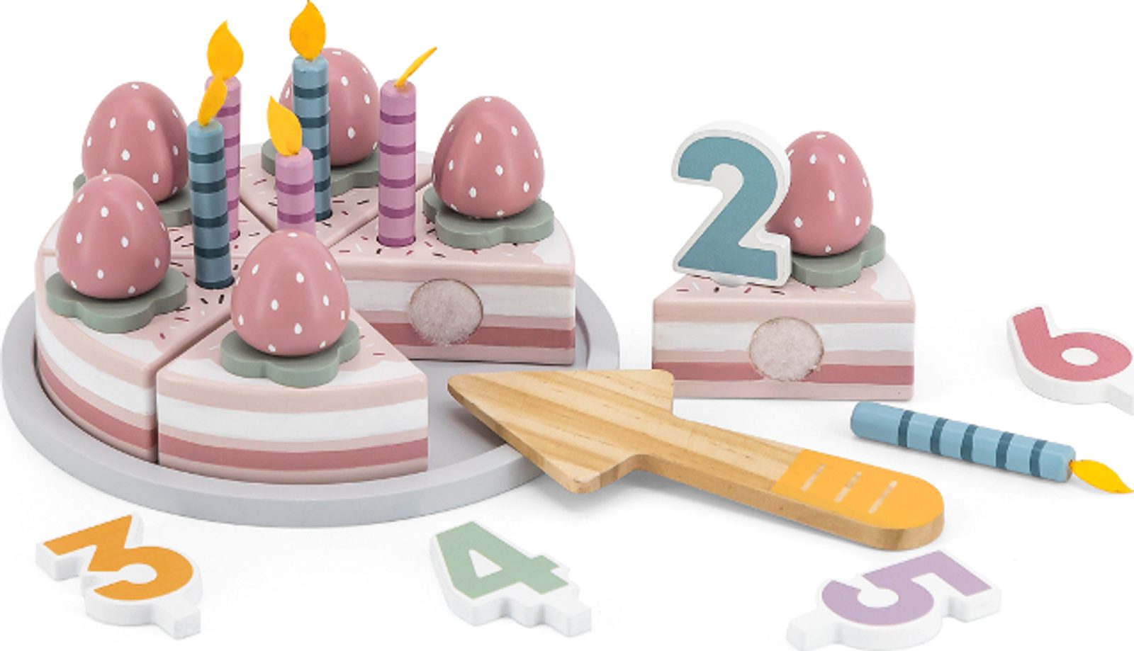 Dřevěný dort je hračka určená nejmenším dětem, které si rády hrají na oslavách a jako doplněk ke kuchyňským soupravám. Podporuje představivost a kreativitu, stejně jako sociální rozvoj a hraní rolí. Sada se skládá z 26 kostek představujících kousky dortu, jahodové ozdoby, svíčky, čísla, talíře a lopatky. Dopřejte si narozeninovou oslavu.