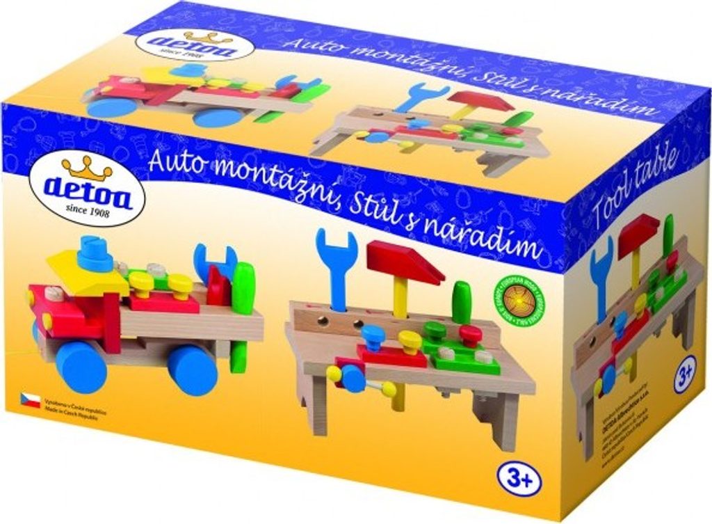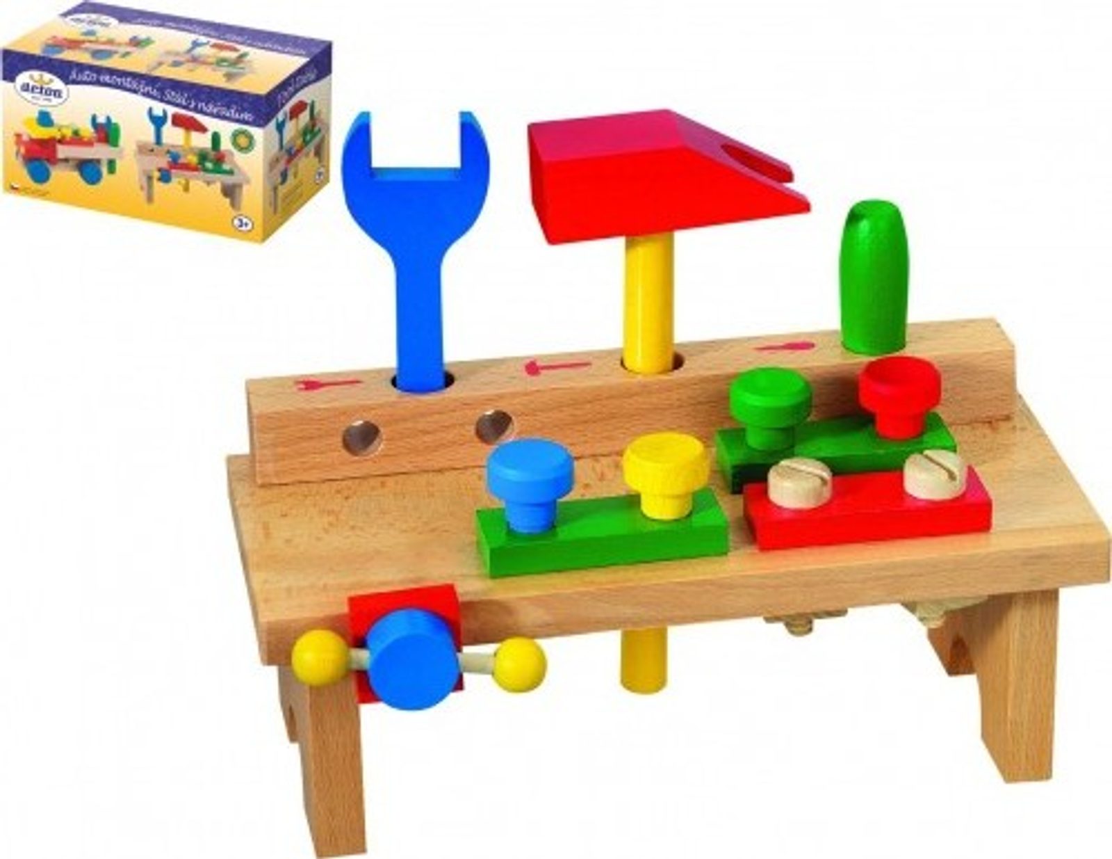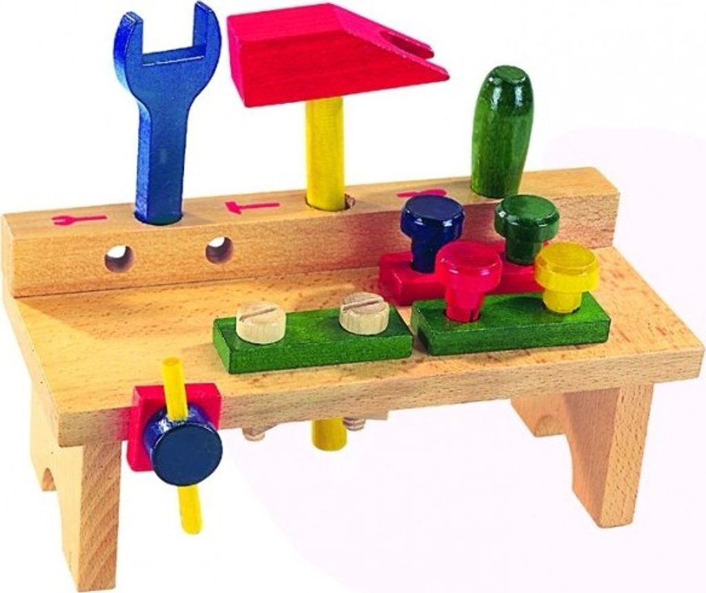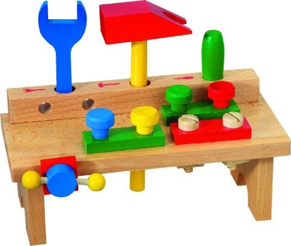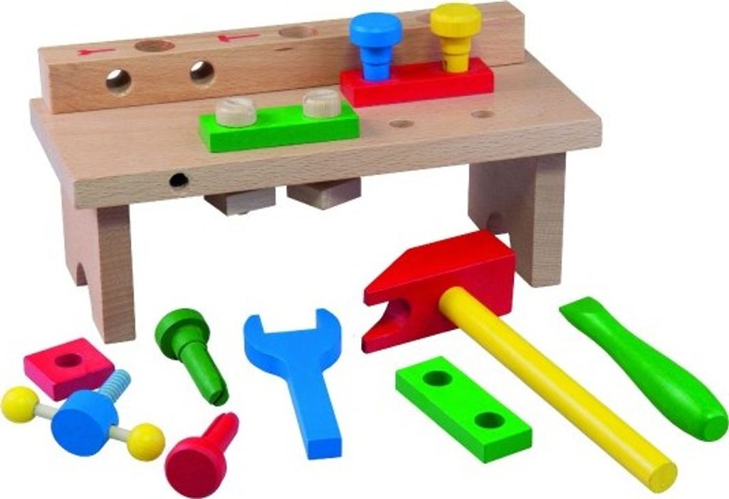 Dřevěný stůl s nářadím obsahuje šroubovák, kladívko, klíč, matice a šroubky. Hračka pomáhá rozvíjet technické chápání a jemnou motoriku rukou. Výrobek splňuje požadavky EU na bezpečnost hraček.