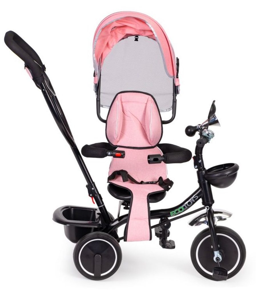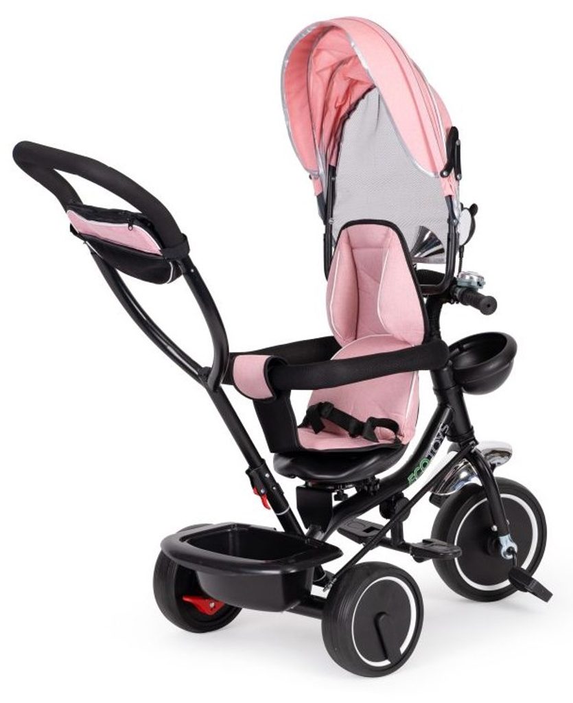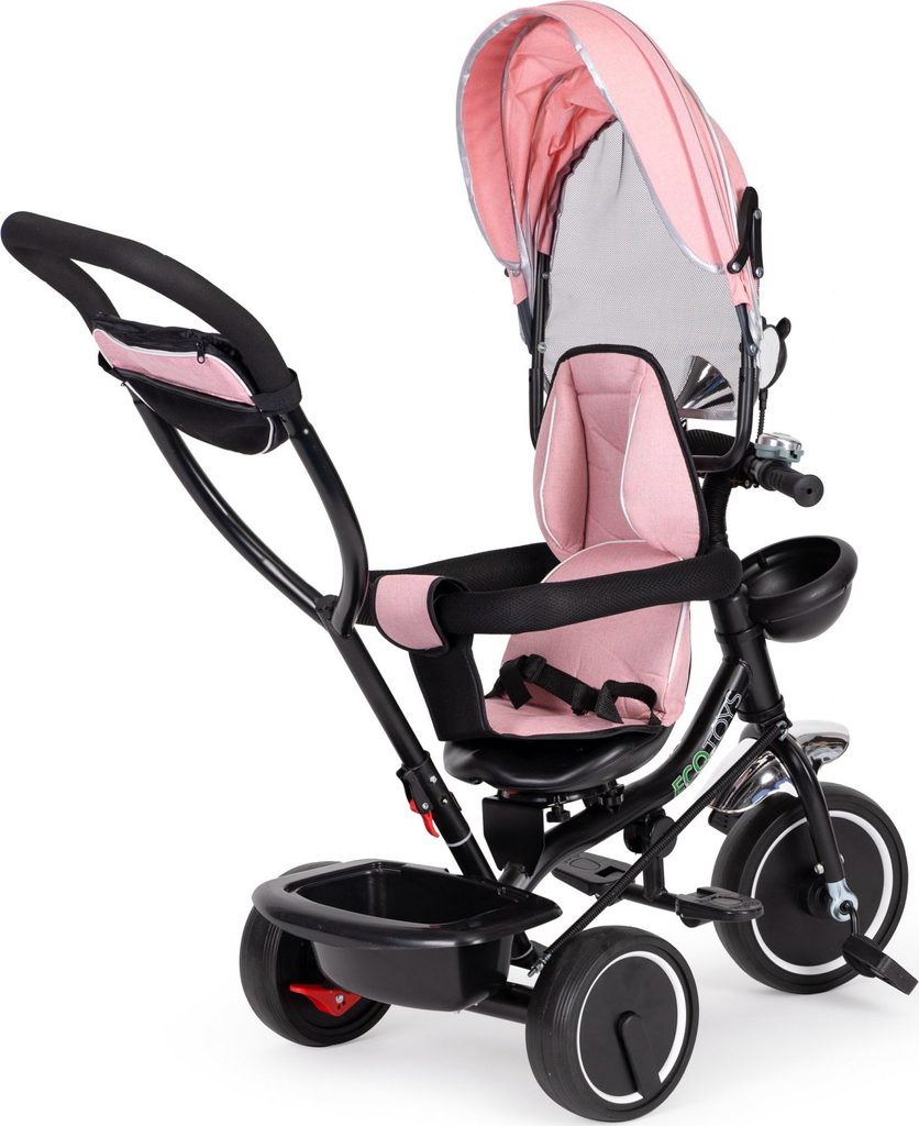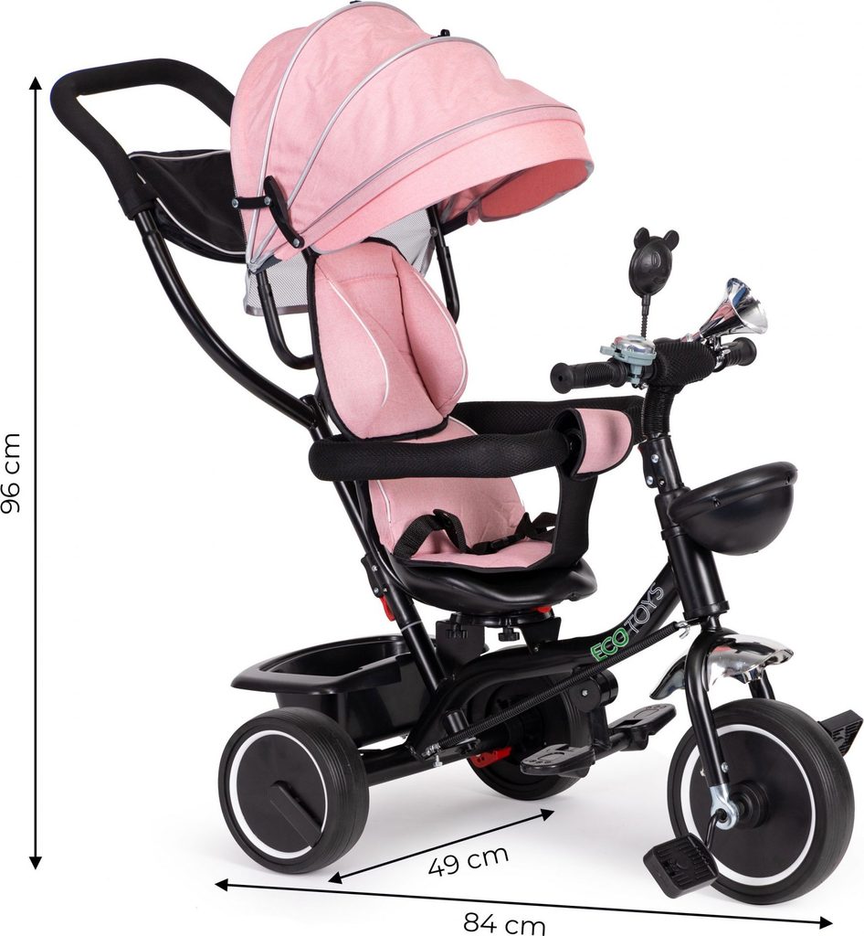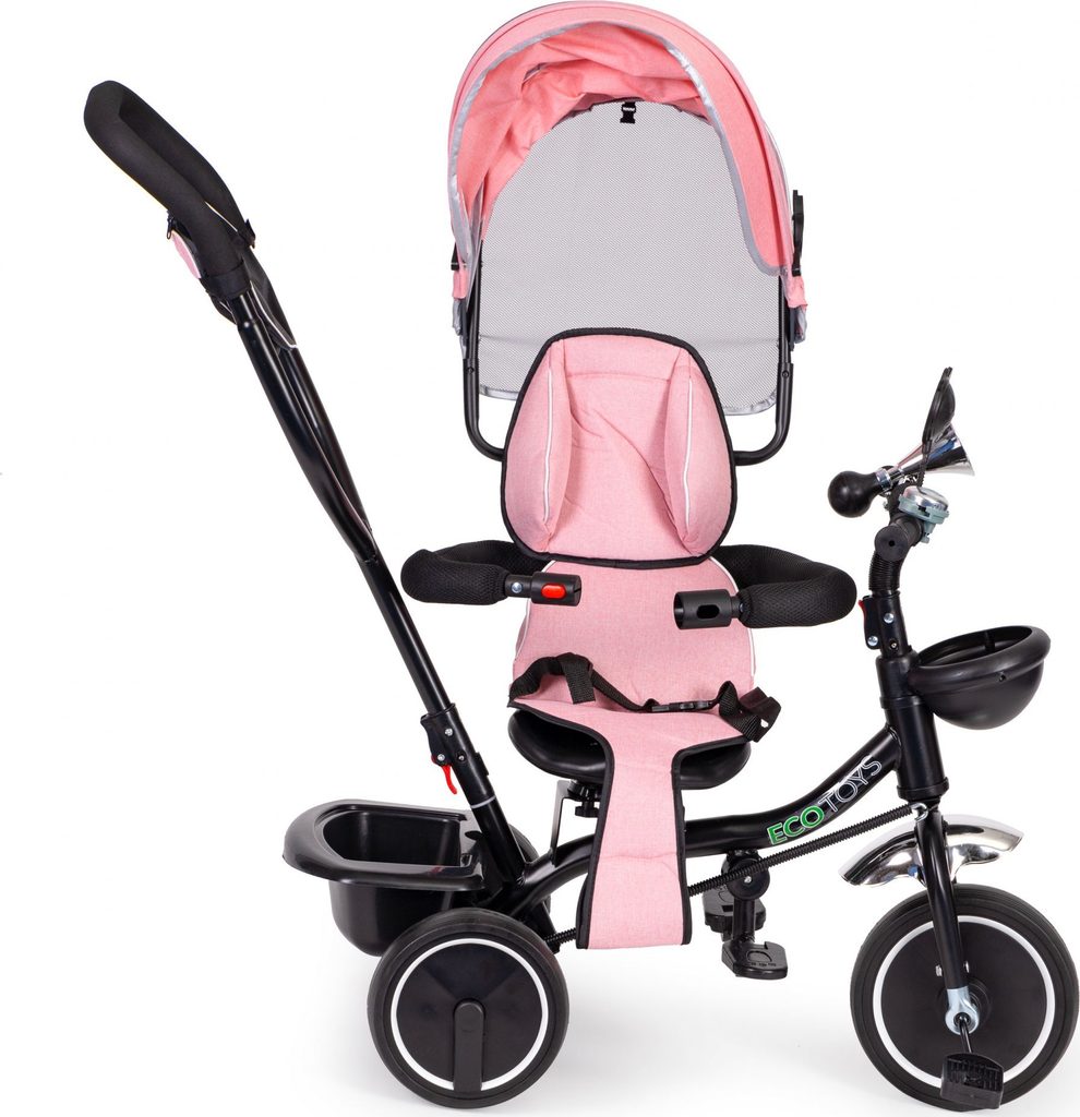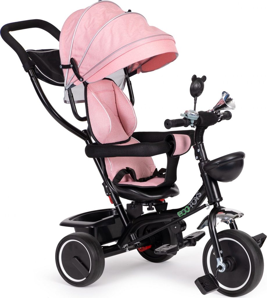 Dětská tříkolka Ecotoys 2v1 s otočným sedadlem. Je určena pro děti od 1 do 5 let. Vybavena praktickou odnímatelnou stříškou proti slunci a dešti. V zadní části je umístěn velký koš na hračky, v přední části potom menší košík. Tříkolka má pevnou ocelovou konstrukci a odolná kola usazená v pevných plastových ráfcích. Madlo a bezpečnostní pásy zabraňují vypadnutí dítěte z kočárku. Na řídítkách je zvoneček a veselé zrcátko. Pro větší bezpečnost mohou tříkolku řídit i rodiče a zadní kola mají 2 nezávislé brzdy. Sedadlo lze otočit o 360° a to ve směru jízdy nebo čelem k rodiči a navíc usnadní nastupování nejmladším dětem.