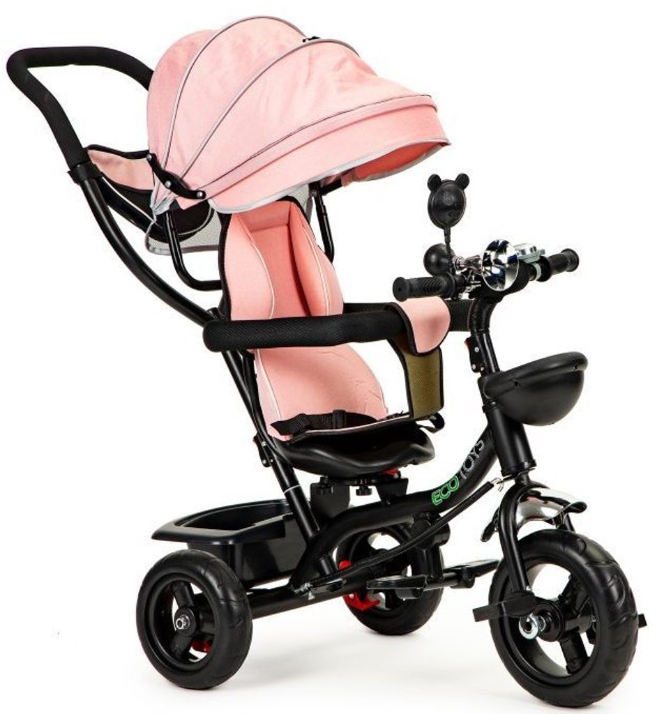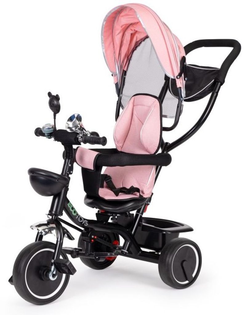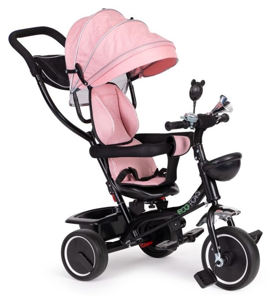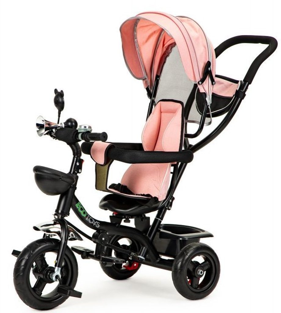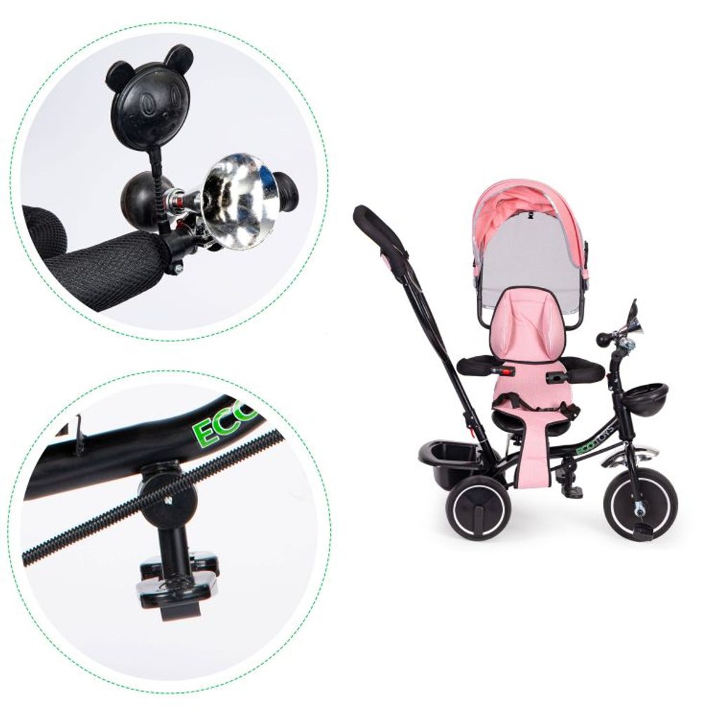Dětská tříkolka Ecotoys 2v1 s otočným sedadlem. Je určena pro děti od 1 do 5 let. Vybavena praktickou odnímatelnou stříškou proti slunci a dešti. V zadní části je umístěn velký koš na hračky, v přední části potom menší košík. Tříkolka má pevnou ocelovou konstrukci a odolná kola usazená v pevných plastových ráfcích. Madlo a bezpečnostní pásy zabraňují vypadnutí dítěte z kočárku. Na řídítkách je zvoneček a veselé zrcátko. Pro větší bezpečnost mohou tříkolku řídit i rodiče a zadní kola mají 2 nezávislé brzdy. Sedadlo lze otočit o 360° a to ve směru jízdy nebo čelem k rodiči a navíc usnadní nastupování nejmladším dětem.