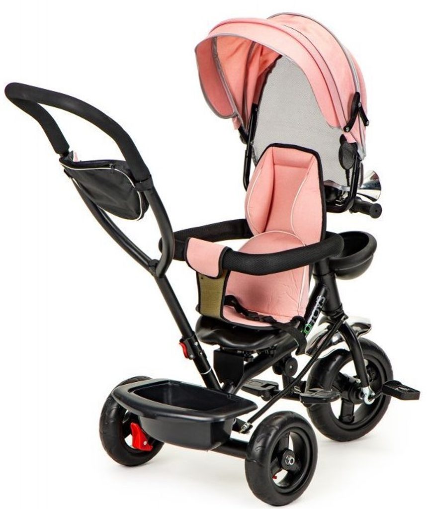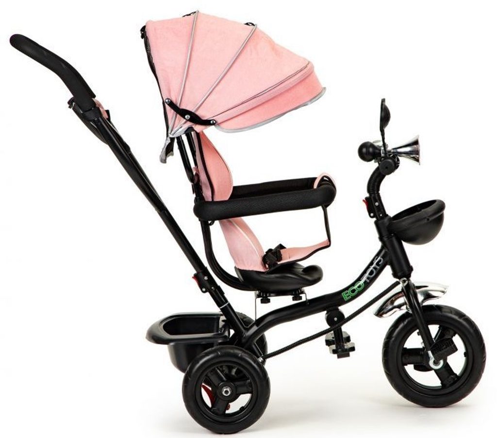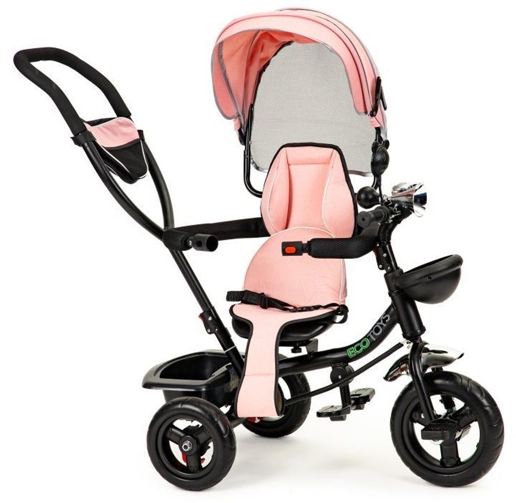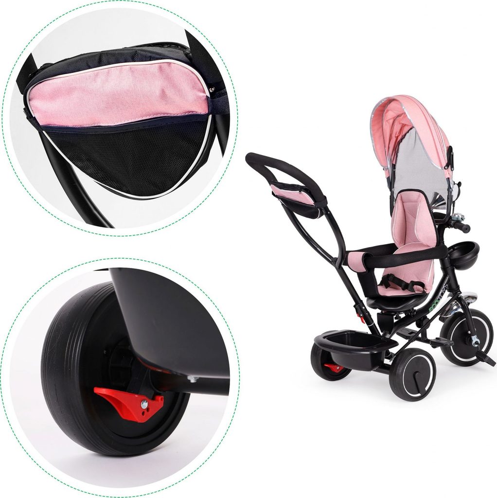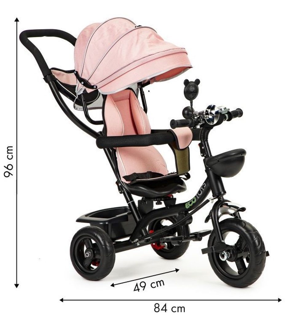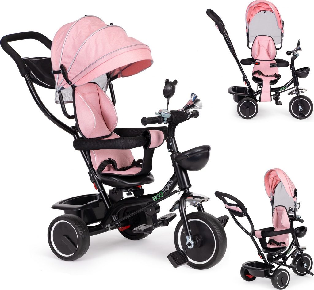 Dětská tříkolka Ecotoys 2v1 s otočným sedadlem. Je určena pro děti od 1 do 5 let. Vybavena praktickou odnímatelnou stříškou proti slunci a dešti. V zadní části je umístěn velký koš na hračky, v přední části potom menší košík. Tříkolka má pevnou ocelovou konstrukci a odolná kola usazená v pevných plastových ráfcích. Madlo a bezpečnostní pásy zabraňují vypadnutí dítěte z kočárku. Na řídítkách je zvoneček a veselé zrcátko. Pro větší bezpečnost mohou tříkolku řídit i rodiče a zadní kola mají 2 nezávislé brzdy. Sedadlo lze otočit o 360° a to ve směru jízdy nebo čelem k rodiči a navíc usnadní nastupování nejmladším dětem.