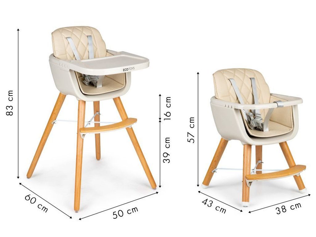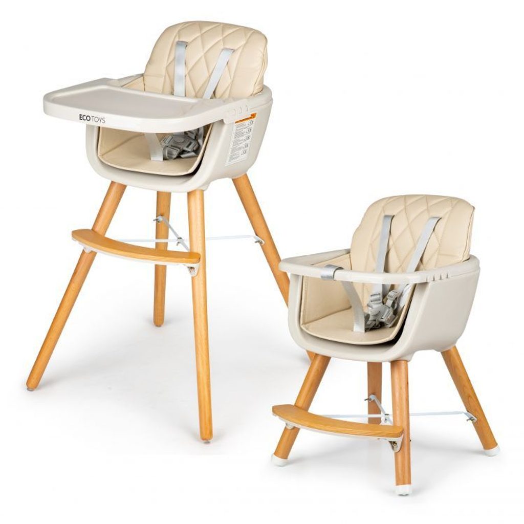 Jídelní židlička se stolečkem Ecotoys 2v1. Jednoduchým způsobem ji lze měnit buď ve vysokou nebo nízkou jídelní židličku. Pro větší pohodlí dítě je zde dřevěná podnožka. Jídelní tác má zvýšené okraje, lze ho odejmout a nastavit ve čtyřech polohách. Praktické polstrování je vyrobeno s nesavého materiálu, lze ho snadno udržovat, čistit a prát v pračce. Na ochranu dítěte před vypadnutím je židlička vybavena 5 bodovými bezpečnostními pásy. Na koncích dřevěných noh jsou koncovky s protiskluzovou úpravou.
