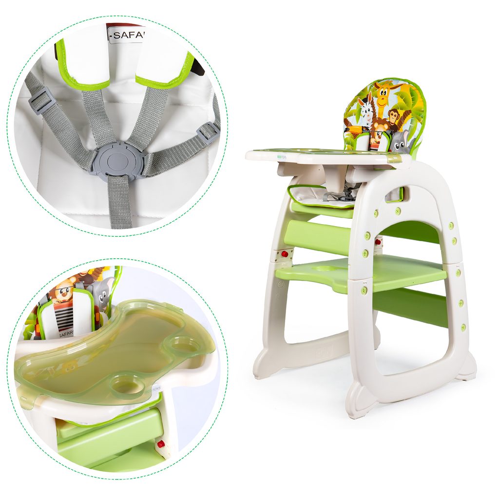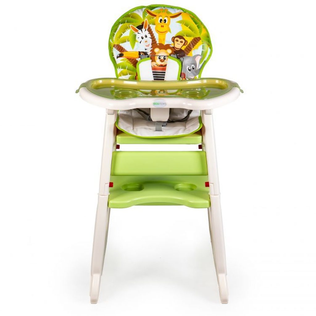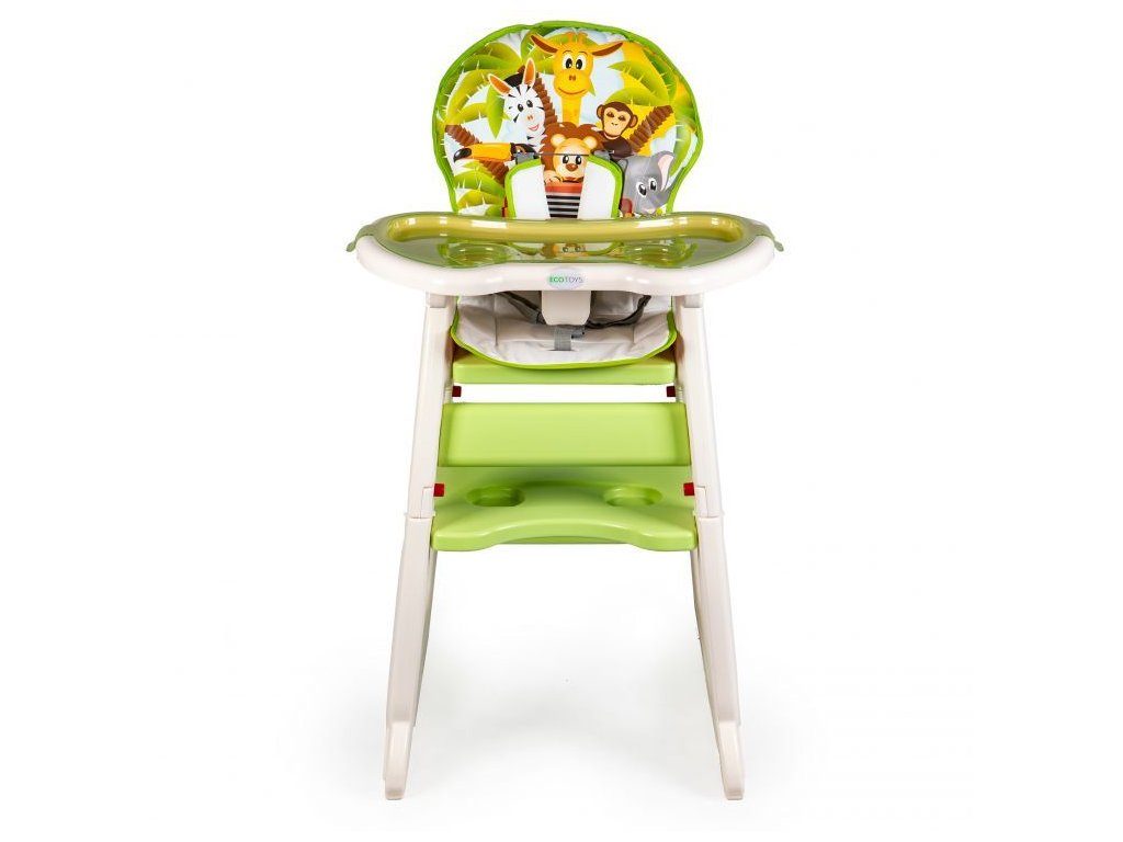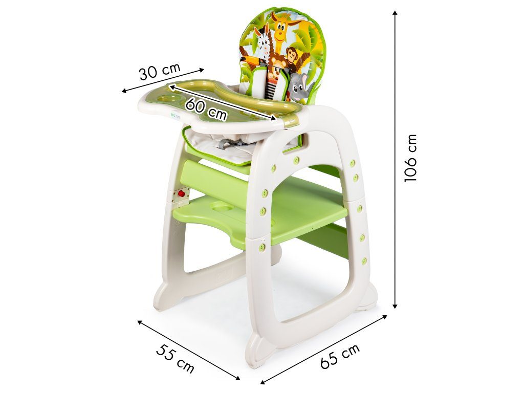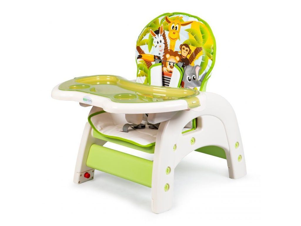 Multifunkční jídelní židlička Ecotoys 2v1 Jungle. Můžete ji využít jako vysokou jídelní židličku nebo ji rozložit na židličku a stoleček. Nohy jsou opatřeny protiskluzovou vrstvou. Opěradlo lze nastavit ve třech polohách. Jídelní tác je dvojitý, odnímatelný a lze ho mýt v myčce. Praktický barevný potah s obrázky zvířátek lze prát v pračce. Na ochranu dítěte před vypadnutím je židlička vybavena 5 bodovými bezpečnostními pásy.