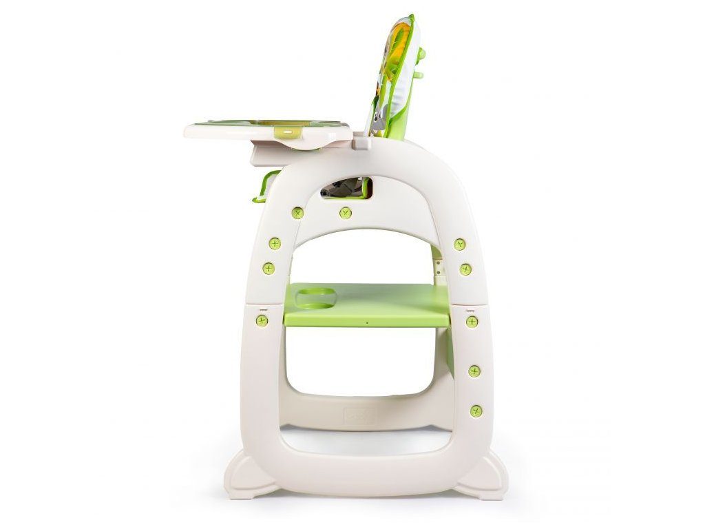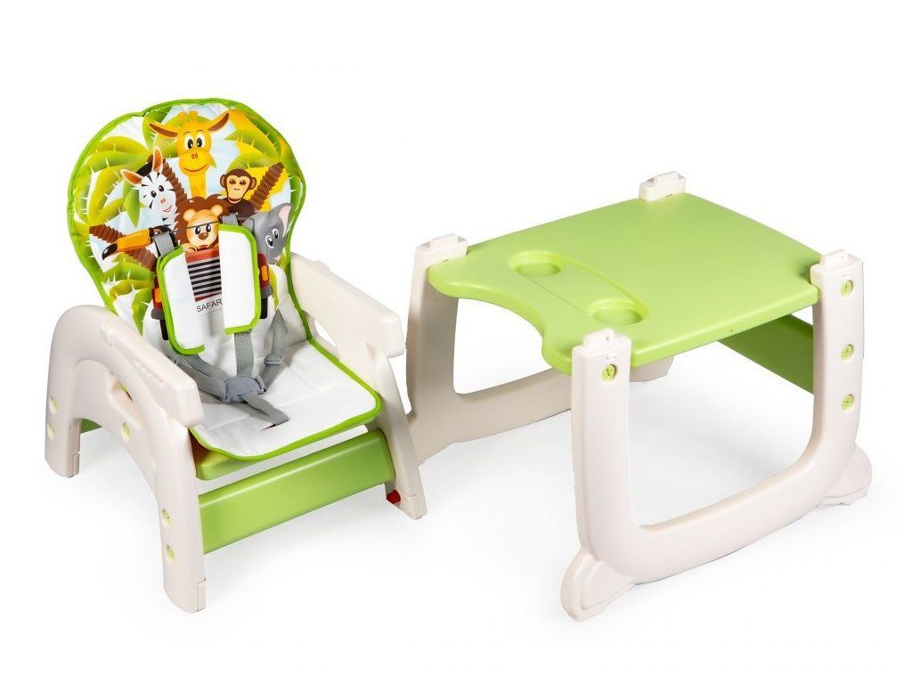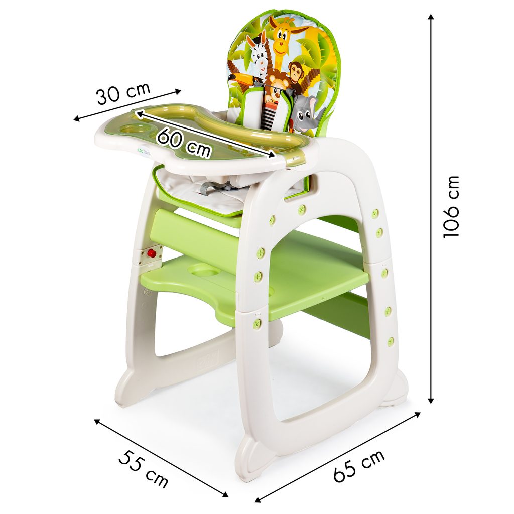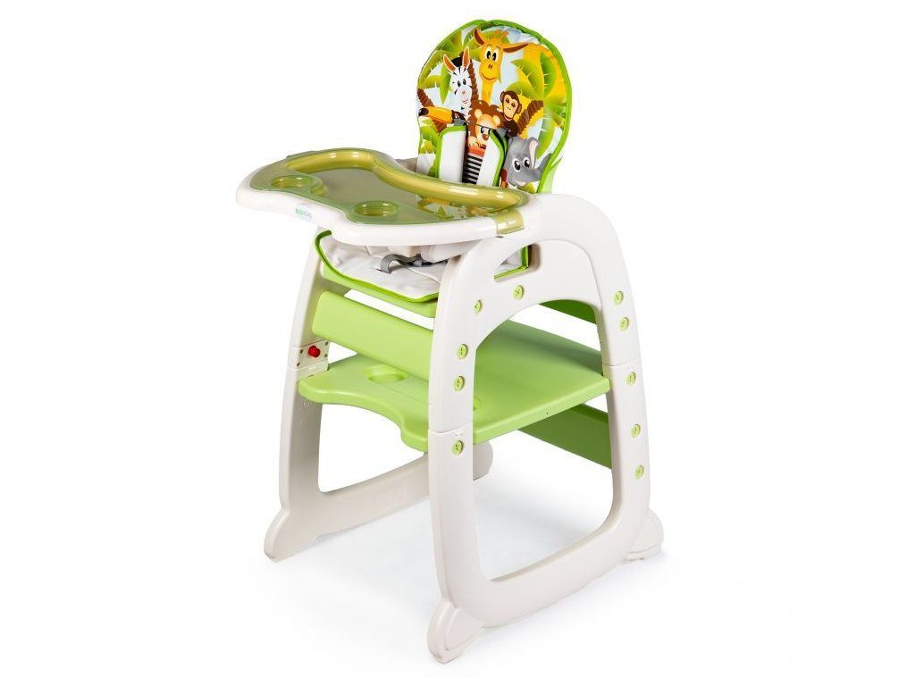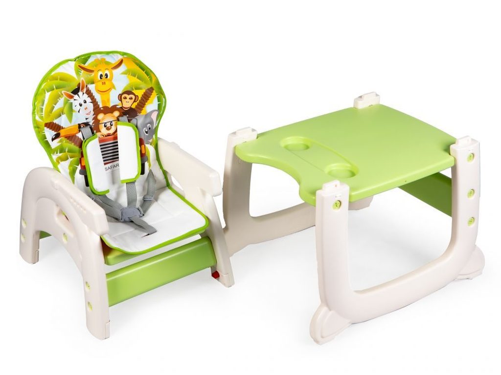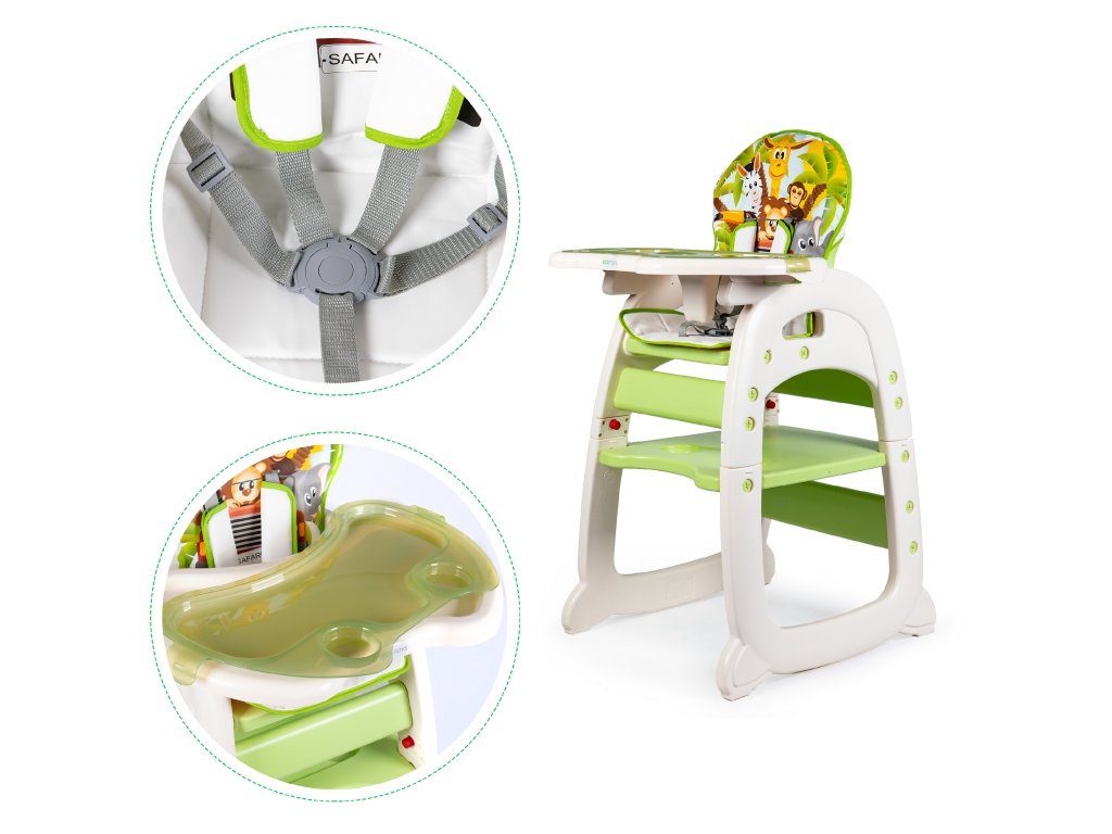 Multifunkční jídelní židlička Ecotoys 2v1 Jungle. Můžete ji využít jako vysokou jídelní židličku nebo ji rozložit na židličku a stoleček. Nohy jsou opatřeny protiskluzovou vrstvou. Opěradlo lze nastavit ve třech polohách. Jídelní tác je dvojitý, odnímatelný a lze ho mýt v myčce. Praktický barevný potah s obrázky zvířátek lze prát v pračce. Na ochranu dítěte před vypadnutím je židlička vybavena 5 bodovými bezpečnostními pásy.