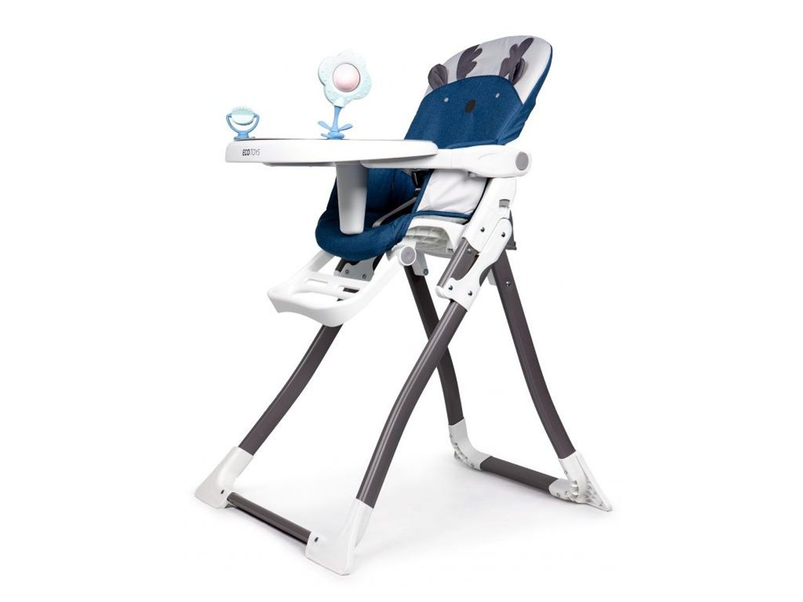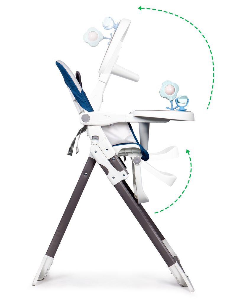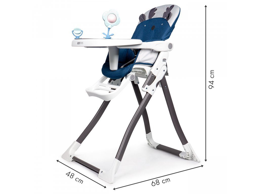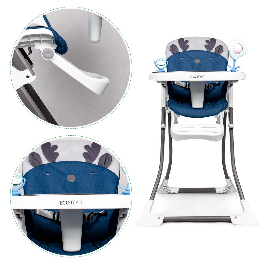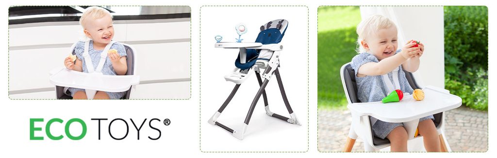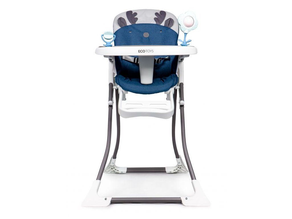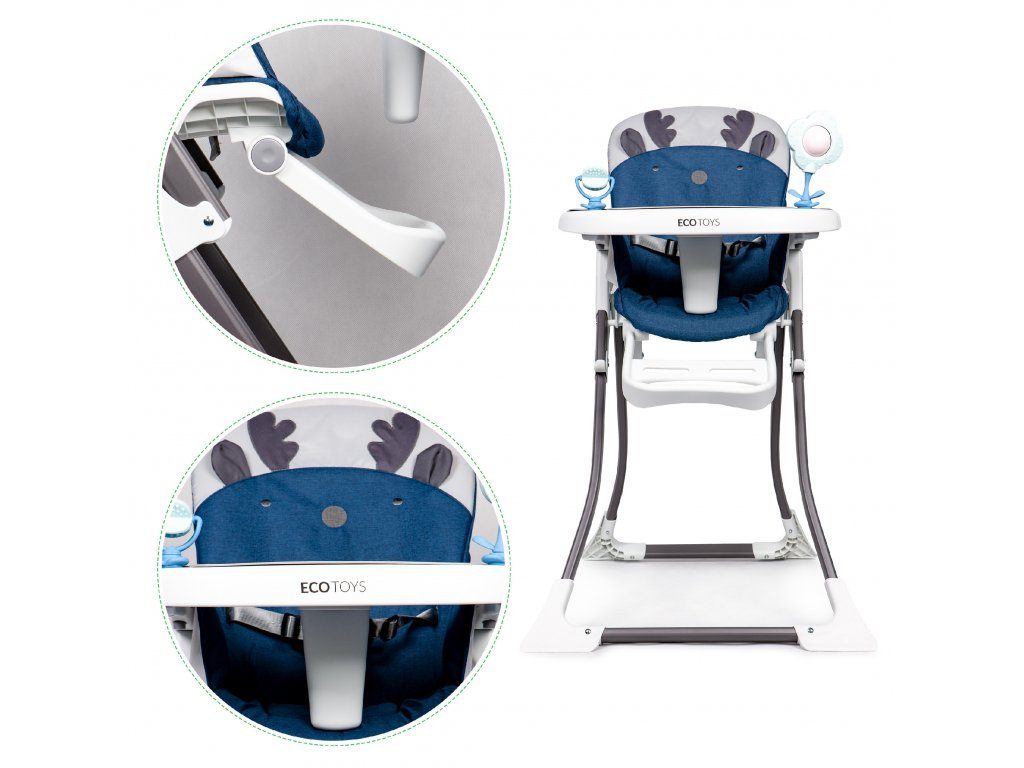 Jídelní židlička Ecotoys se stolečkem 2v1 a zabudovanými hračkami. Pomocí jednoho tlačítka ji lze velmi jednoduše složit a rozložit, což oceníte zejména při cestách. Jídelní tác má zvýšené okraje, lze ho odejmout a nastavit ve třech polohách dle věku dítěte. Je rozdělený na 2 části, kdy jedna slouží pro zábavu a druhá pro stravování. Praktické polstrování je vyrobeno s nesavého materiálu, lze ho snadno udržovat, čistit a prát v pračce. Na ochranu dítěte před vypadnutím je židlička vybavena 3 bodovými bezpečnostními pásy a pod jídelním tácem je umístěna blokace proti sesunutí dítěte. Na koncích noh jsou koncovky s protiskluzovou úpravou.