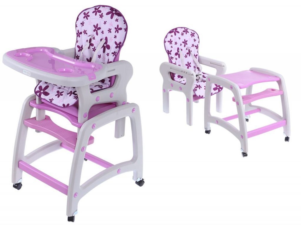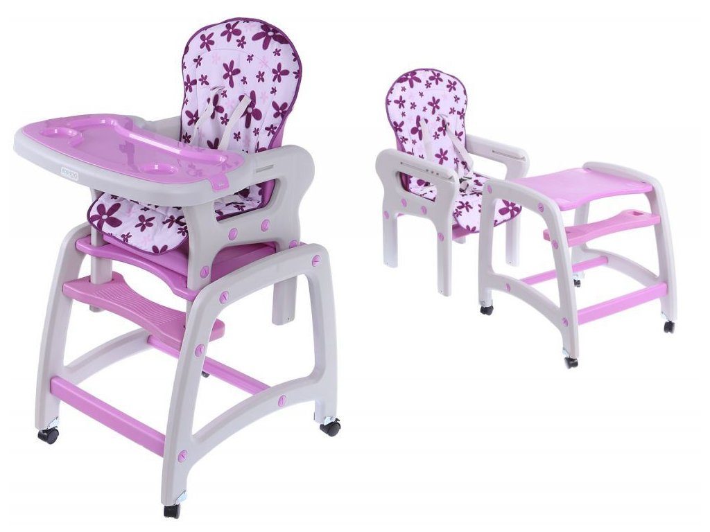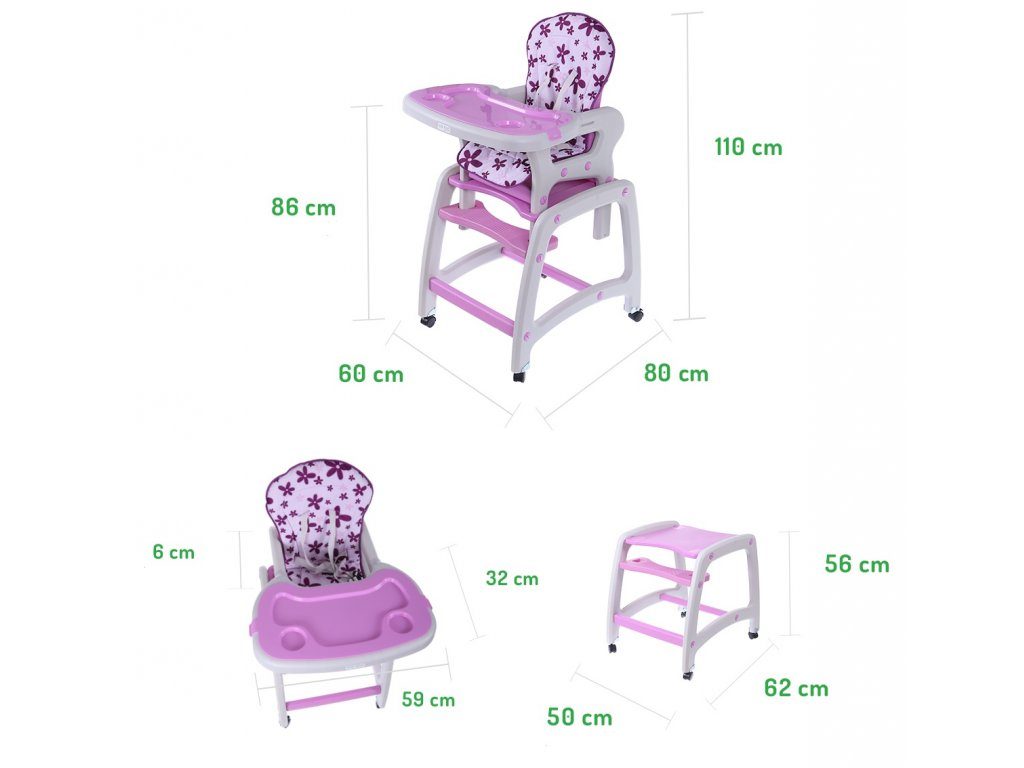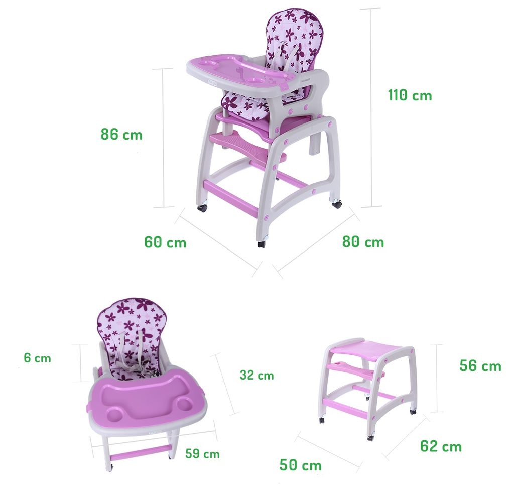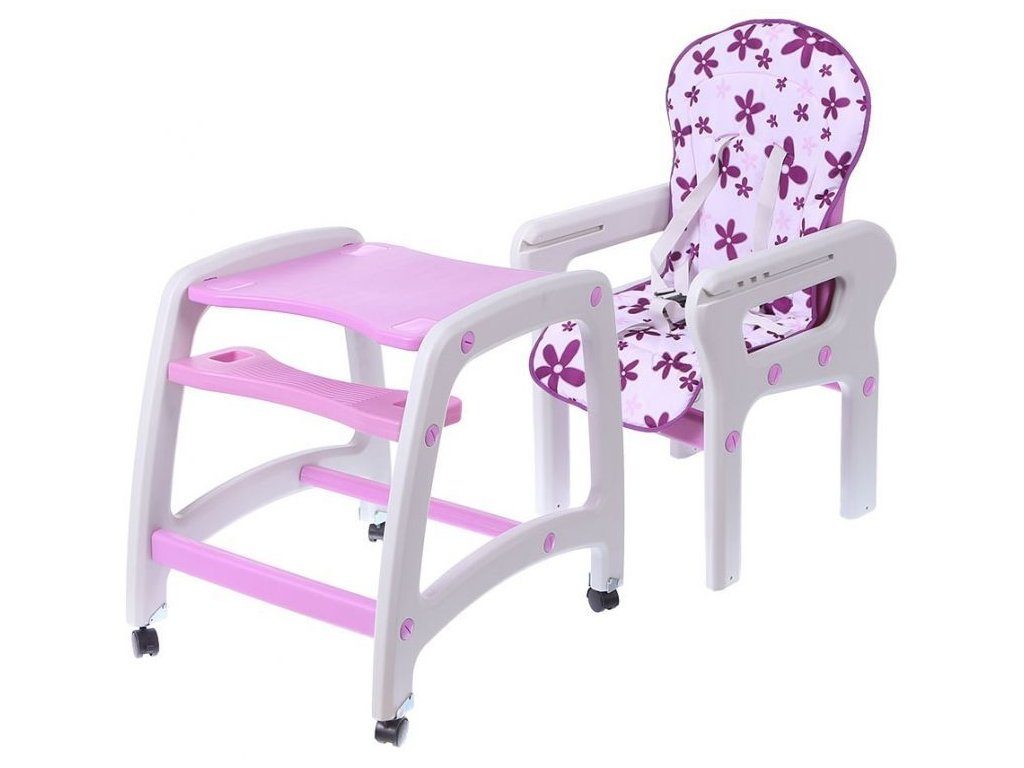 Multifunkční jídelní židlička Ecotoys 3v1. Můžete ji využít jako vysokou jídelní židličku, rozložit ji na židličku a stoleček nebo můžete využít samostatnou malou židličku. Zadní nohy jsou vybaveny brzdičkou takže můžete se židličkou snadno pohybovat. Jídelní tác je nastavitelný ve třech polohách a lze ho mýt v myčce. Praktický barevný potah lze prát v pračce. Na ochranu dítěte před vypadnutím je židlička vybavena 5 bodovými bezpečnostními pásy.