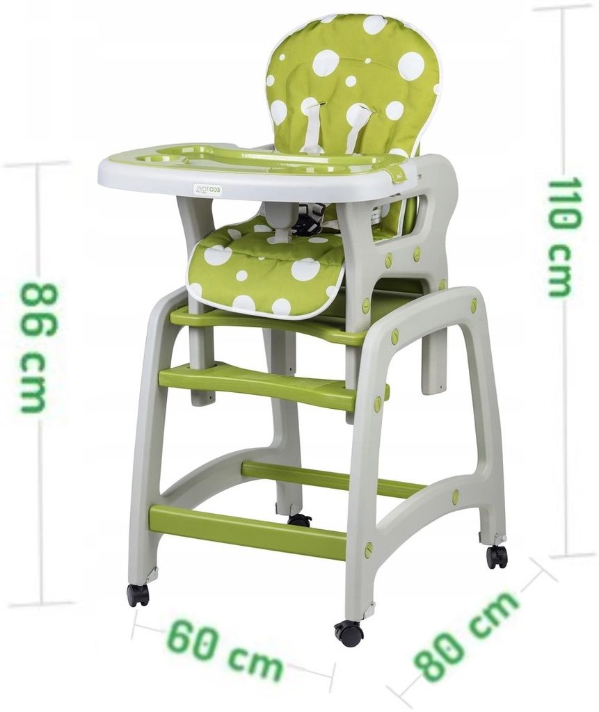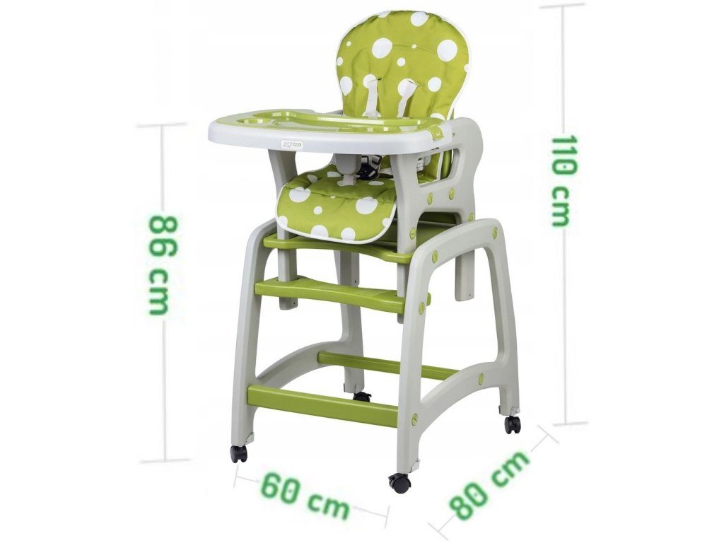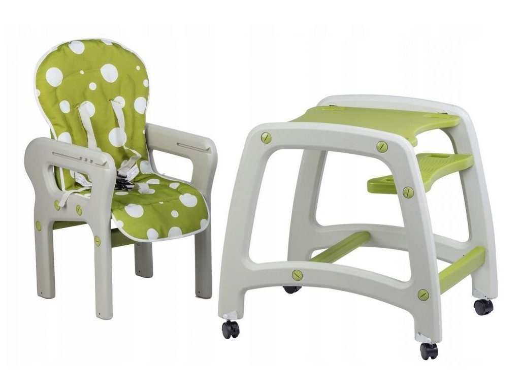 Multifunkční jídelní židlička Ecotoys 3v1. Můžete ji využít jako vysokou jídelní židličku, rozložit ji na židličku a stoleček nebo můžete využít samostatnou malou židličku. Zadní nohy jsou vybaveny brzdičkou takže můžete se židličkou snadno pohybovat. Jídelní tác je nastavitelný ve třech polohách a lze ho mýt v myčce. Praktický barevný potah lze prát v pračce. Na ochranu dítěte před vypadnutím je židlička vybavena 5 bodovými bezpečnostními pásy.