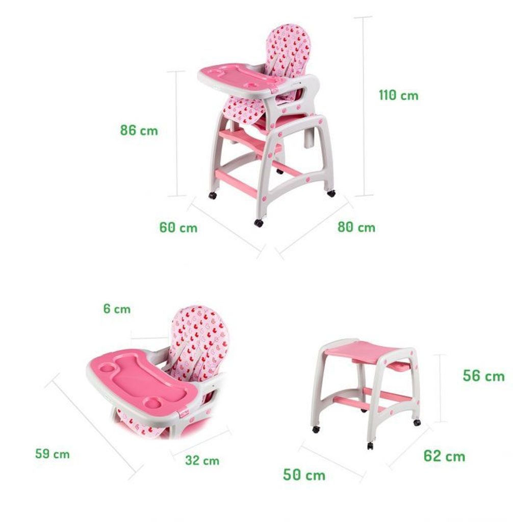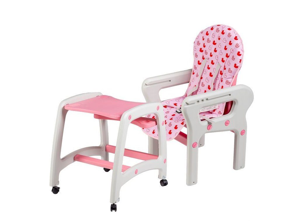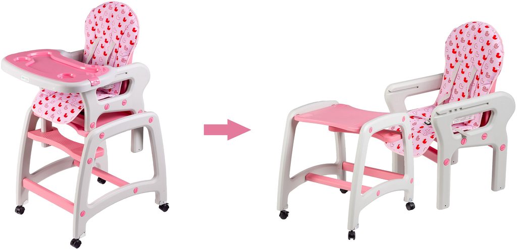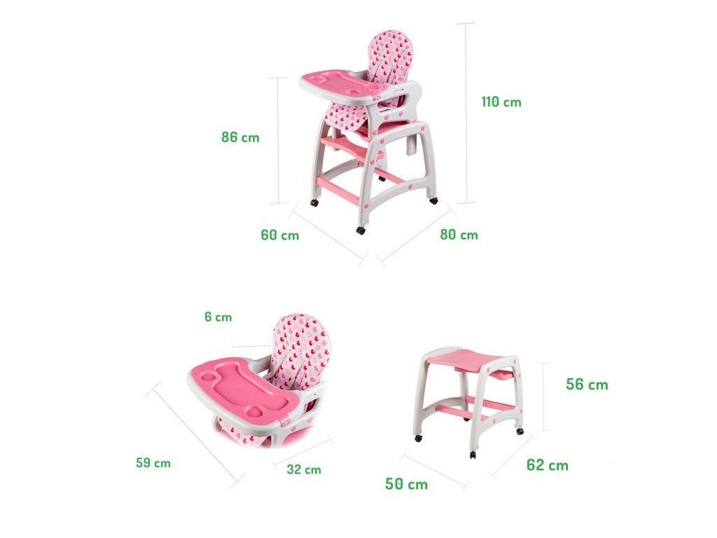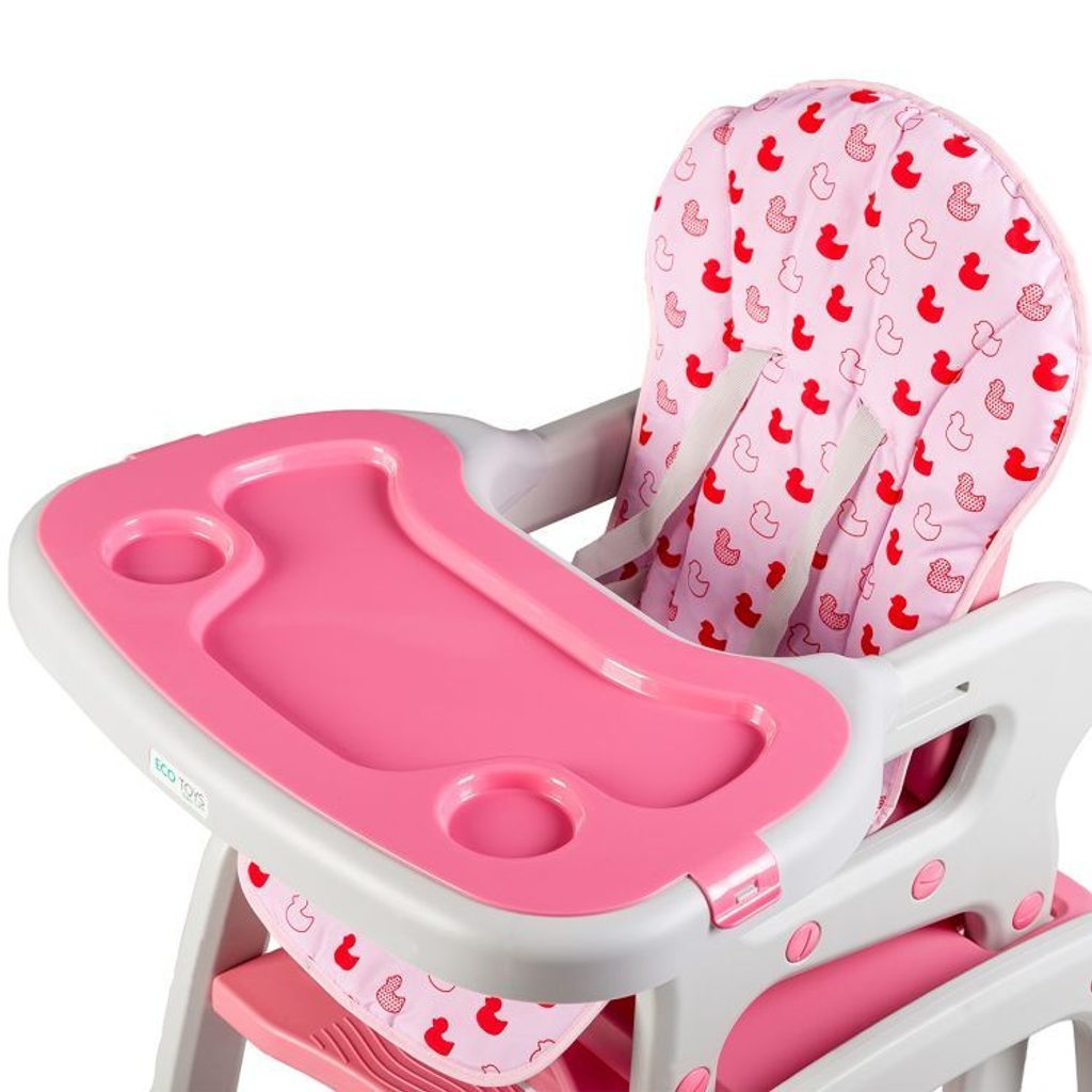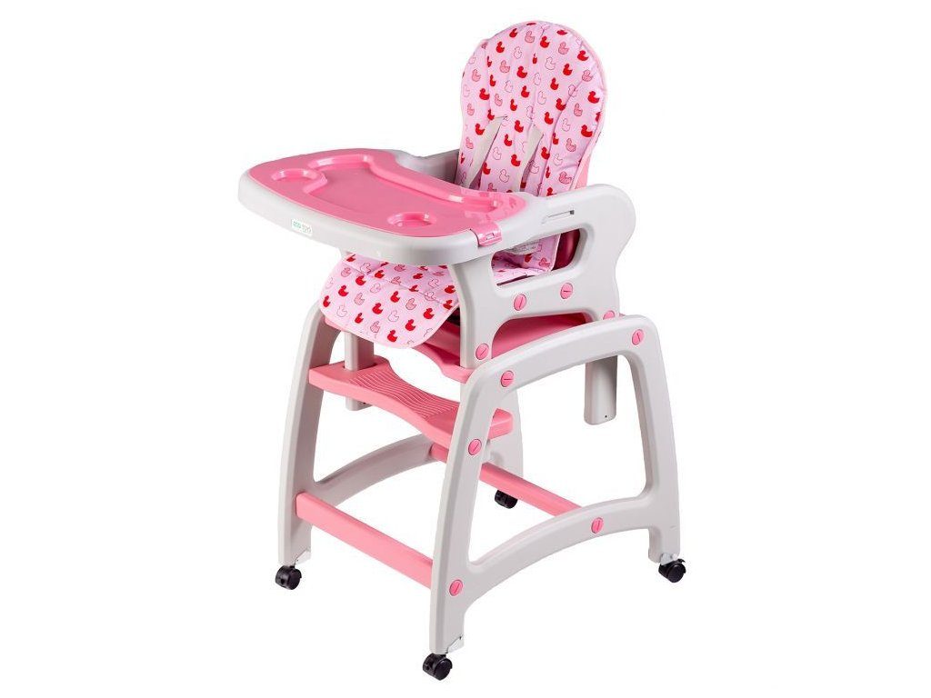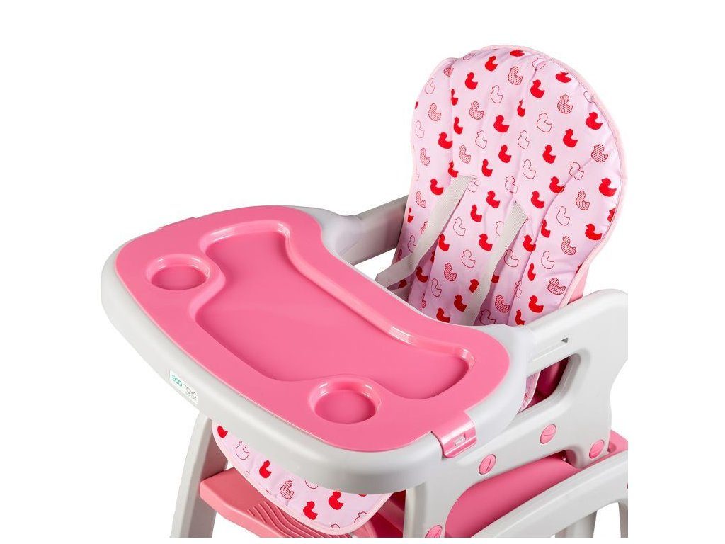 Multifunkční jídelní židlička Ecotoys 3v1. Můžete ji využít jako jídelní židličku, rozložit na židličku a stoleček nebo můžete využít samostatnou malou stoličku. Zadní nohy jsou vybaveny brzdičkou takže můžete se židličkou snadno pohybovat. Jídelní tác je nastavitelný ve třech polohách a lze ho mýt v myčce. Praktický barevný potah lze prát v pračce. Na ochranu dítěte před vypadnutím je židlička vybavena 5 bodovými bezpečnostními pásy.