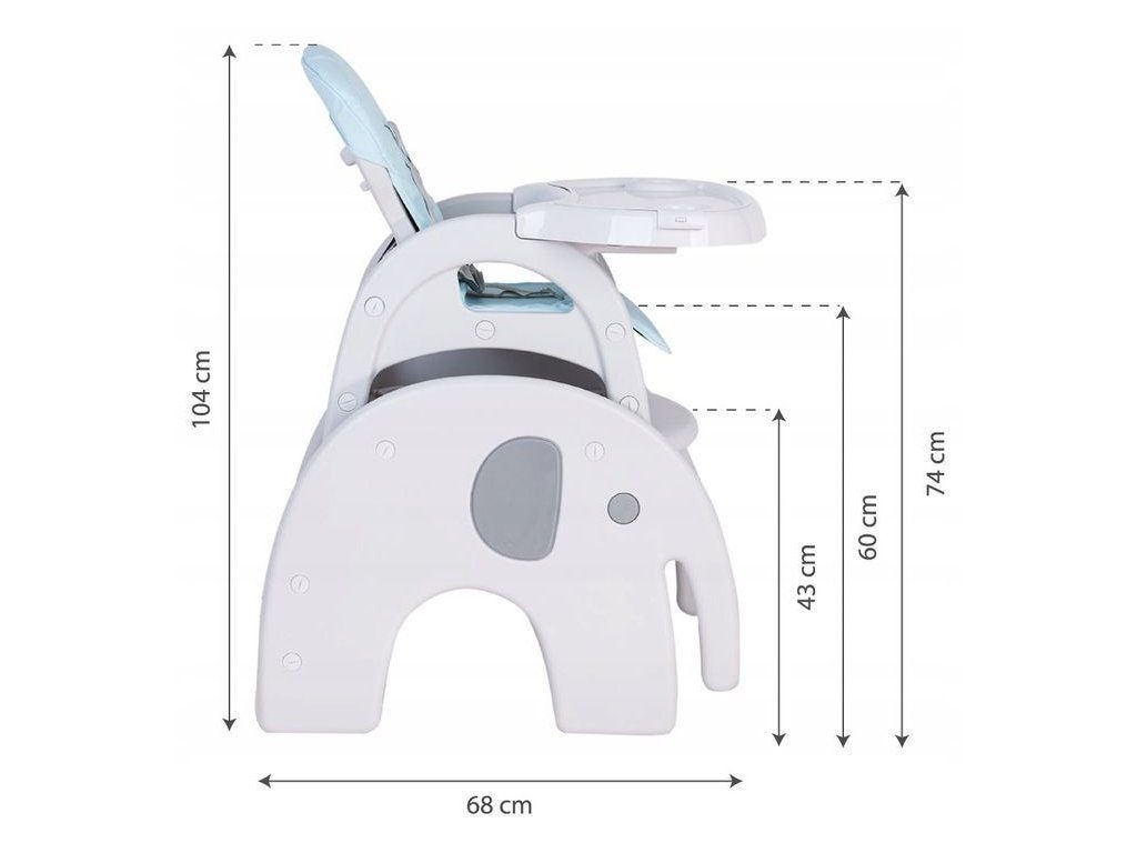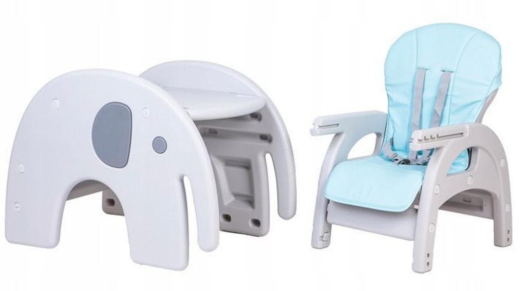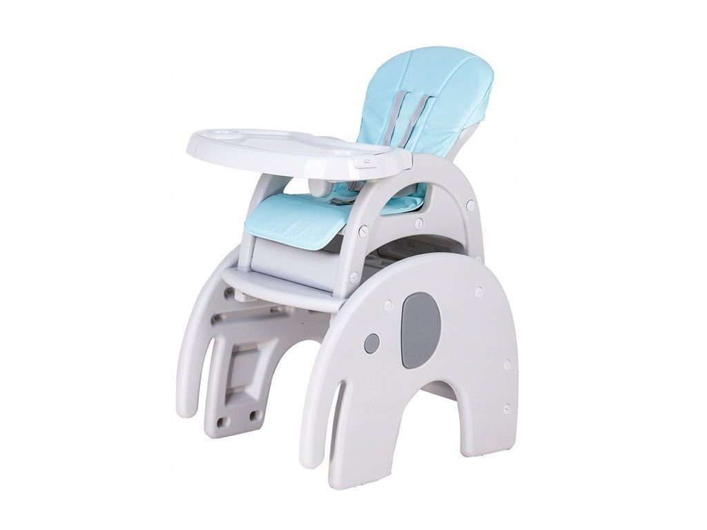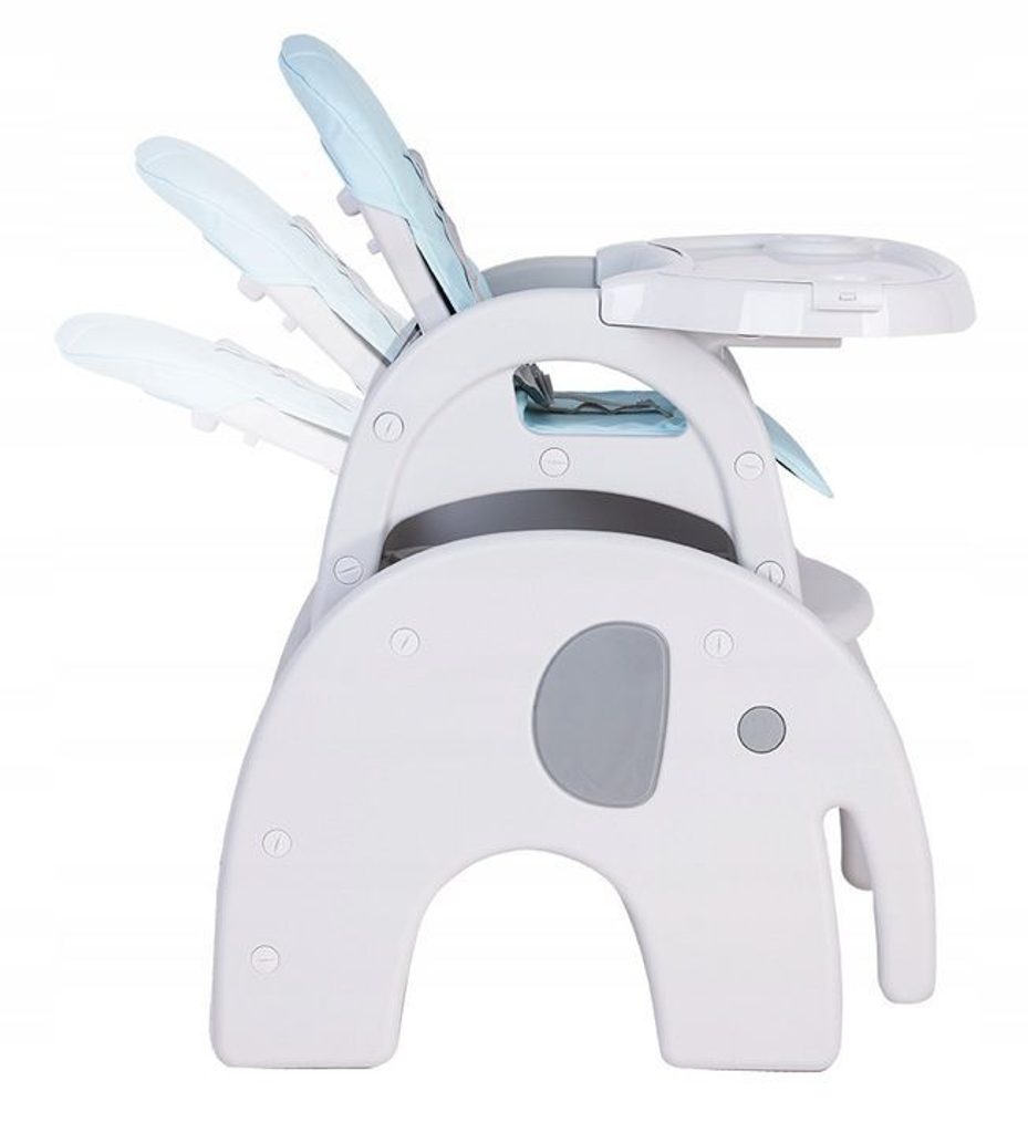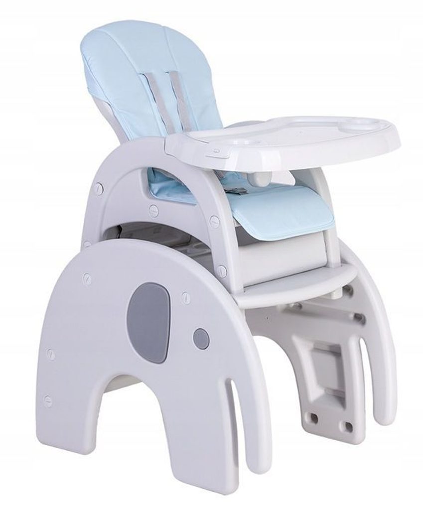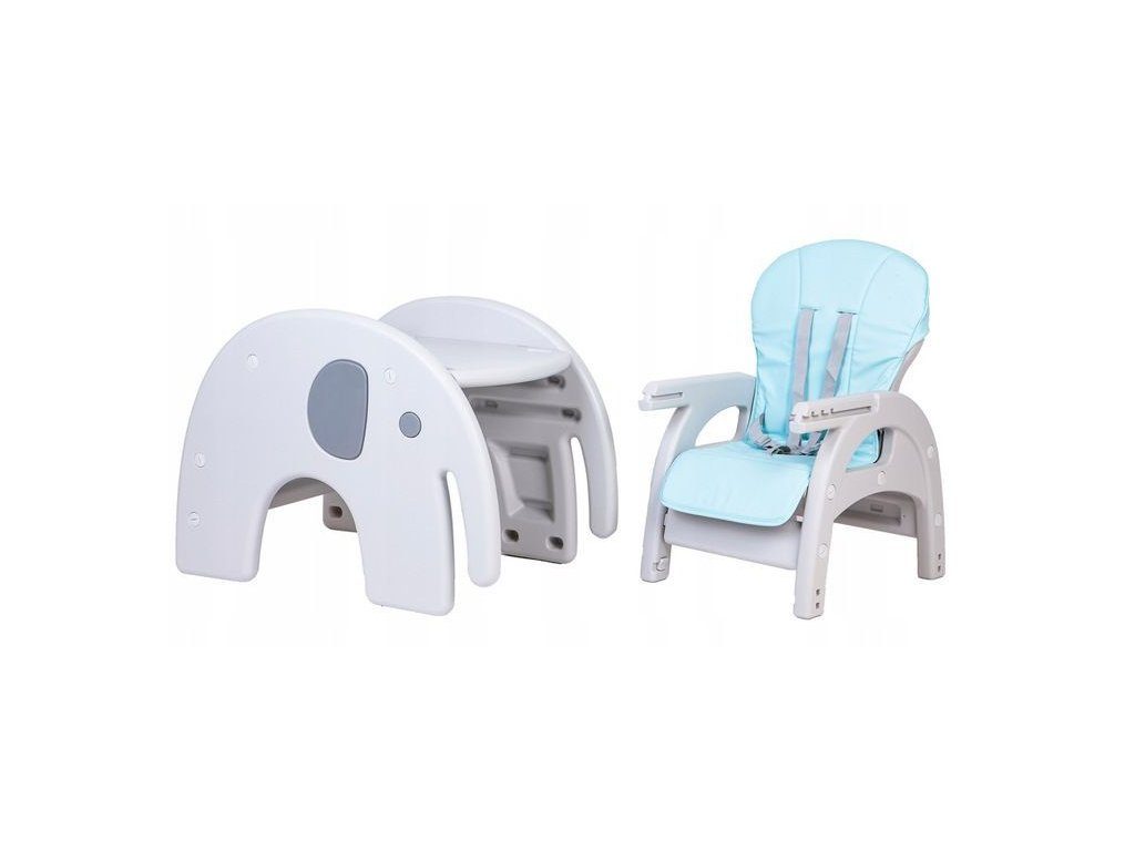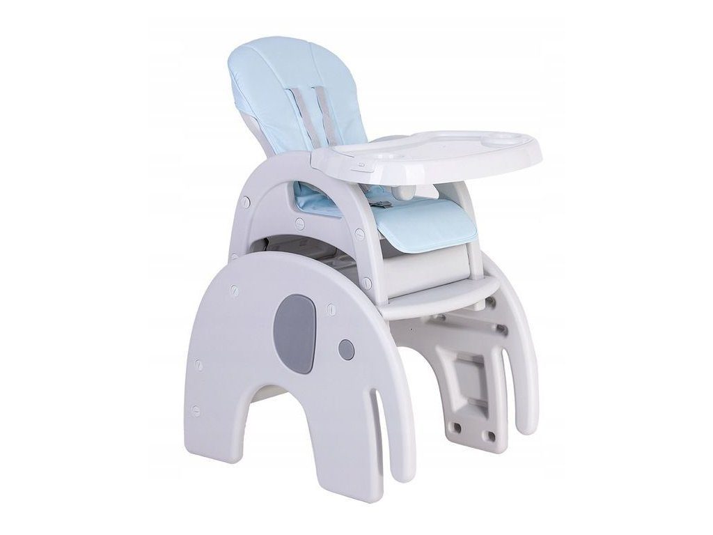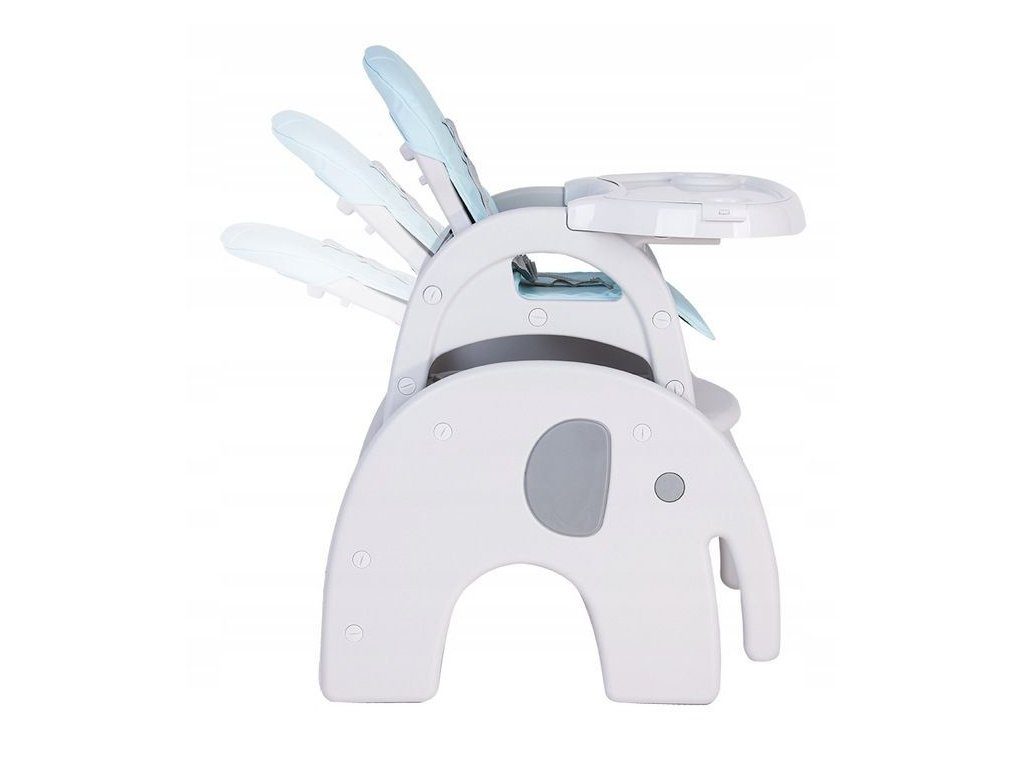 Multifunkční jídelní židlička Ecotoys 3v1 Slon. Můžete ji využít jako jídelní židličku, rozložit ji na židličku a stoleček nebo můžete použít samostatnou malou stoličku. Jídelní tác je dvojitý, lze ho odejmout a má úchyt pro hrneček. Praktický potah lze prát v pračce. Na ochranu dítěte před vypadnutím je židlička vybavena 5 bodovými bezpečnostními pásy.