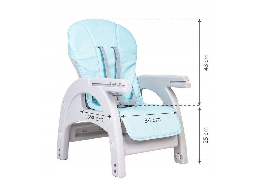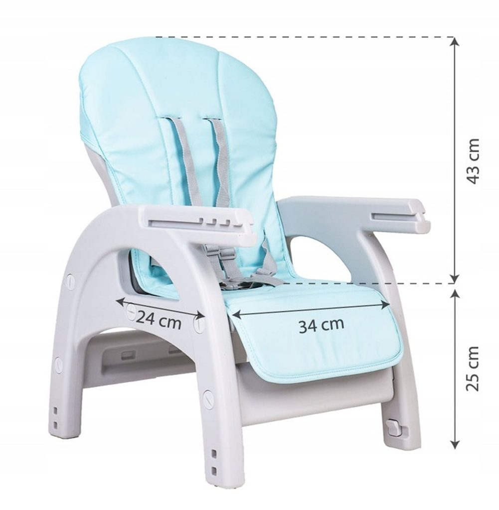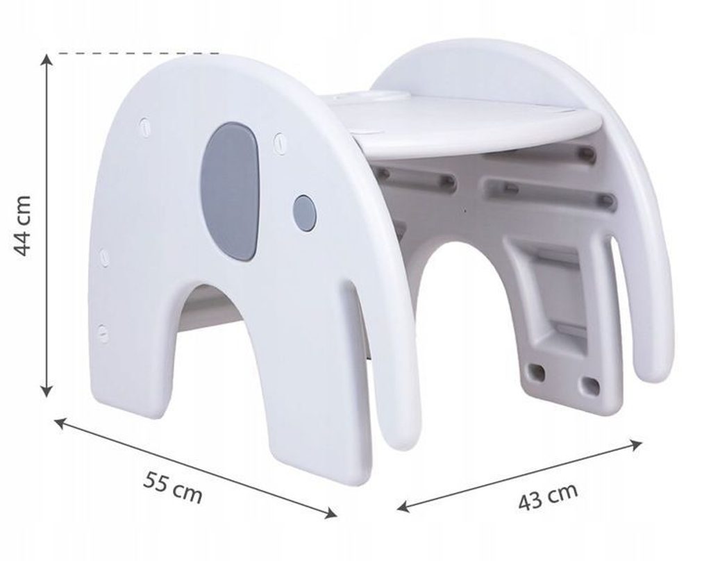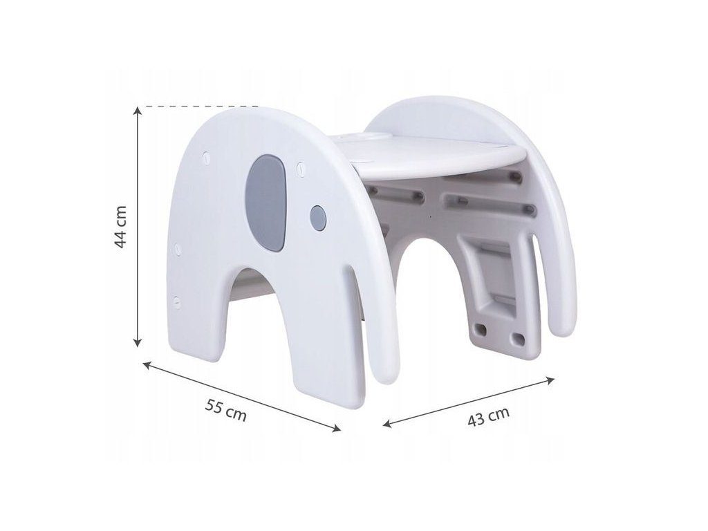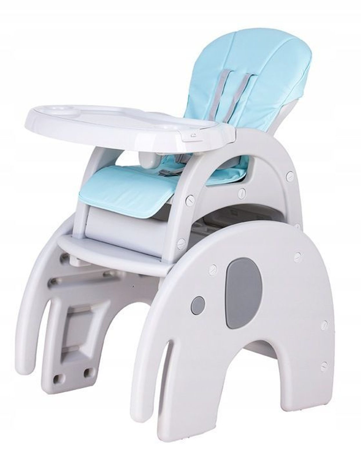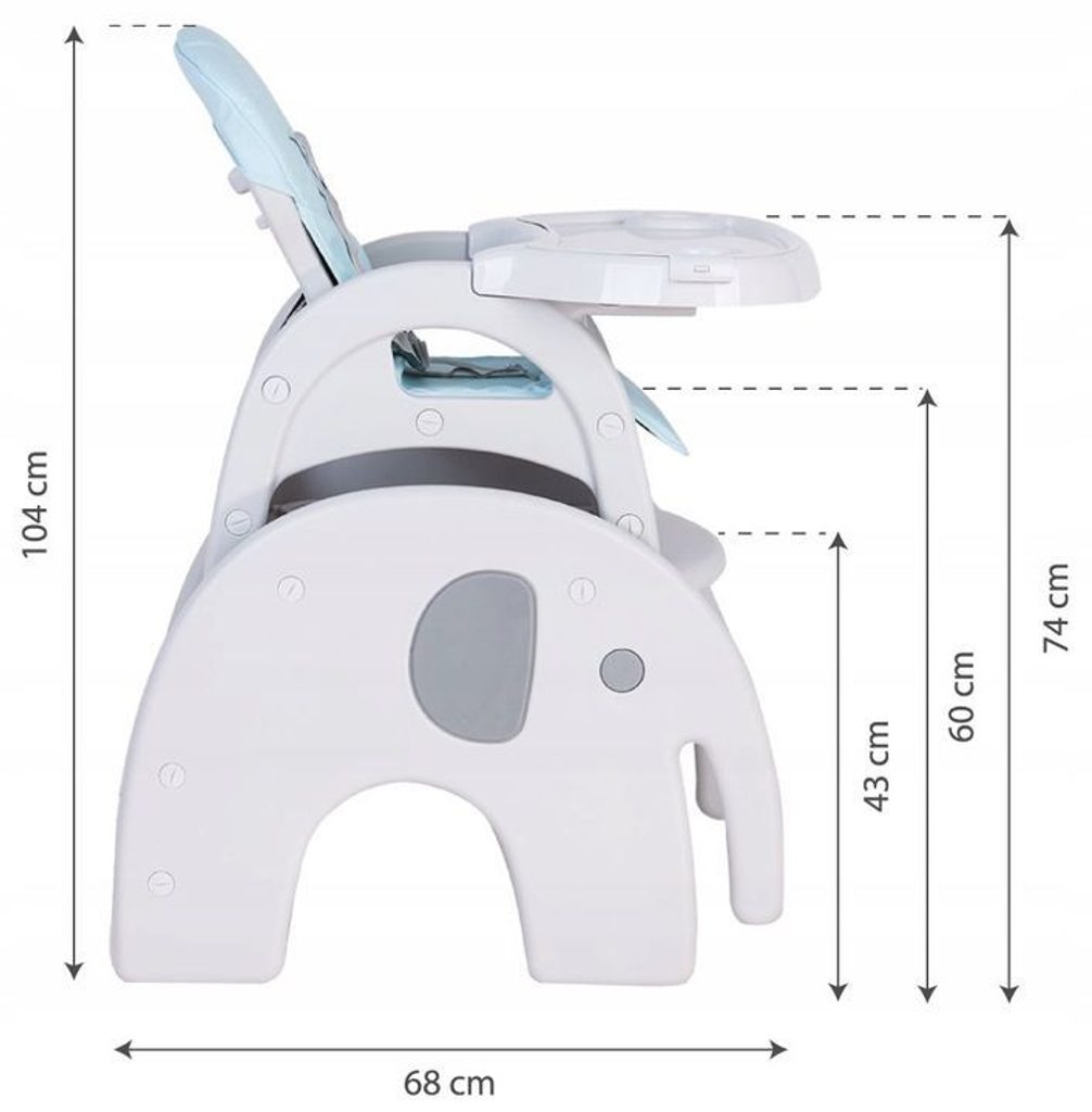 Multifunkční jídelní židlička Ecotoys 3v1 Slon. Můžete ji využít jako jídelní židličku, rozložit ji na židličku a stoleček nebo můžete použít samostatnou malou stoličku. Jídelní tác je dvojitý, lze ho odejmout a má úchyt pro hrneček. Praktický potah lze prát v pračce. Na ochranu dítěte před vypadnutím je židlička vybavena 5 bodovými bezpečnostními pásy.