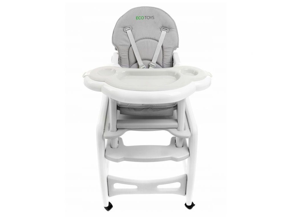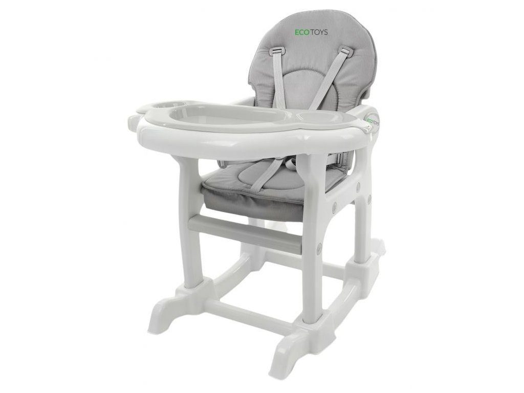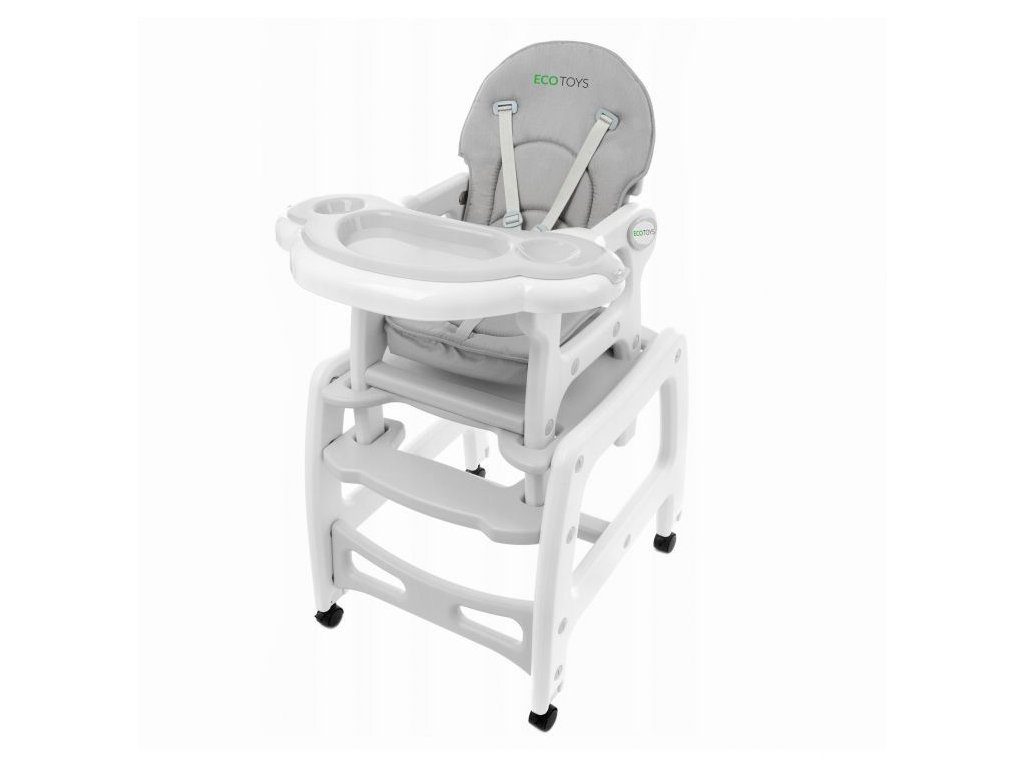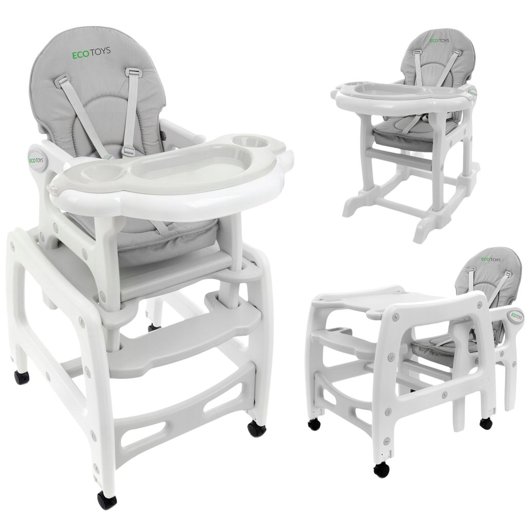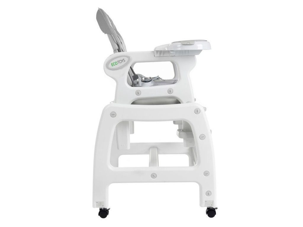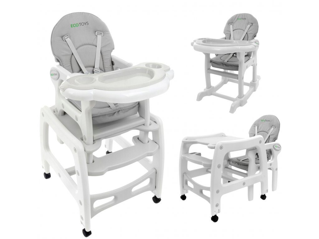 Multifunkční jídelní židlička Ecotoys 3v1. Můžete ji využít jako vysokou jídelní židličku, rozložit ji na židličku a stoleček nebo jako houpací křesílko. Kolečka jsou vybaveny brzdičkou takže můžete se židličkou snadno pohybovat. Dvojitý jídelní tác je nastavitelný a lze ho mýt v myčce. Praktický potah lze prát v pračce. Na ochranu dítěte před vypadnutím je židlička vybavena 5 bodovými bezpečnostními pásy. Židlička je určena ppro děti od 6 měsíců věku.