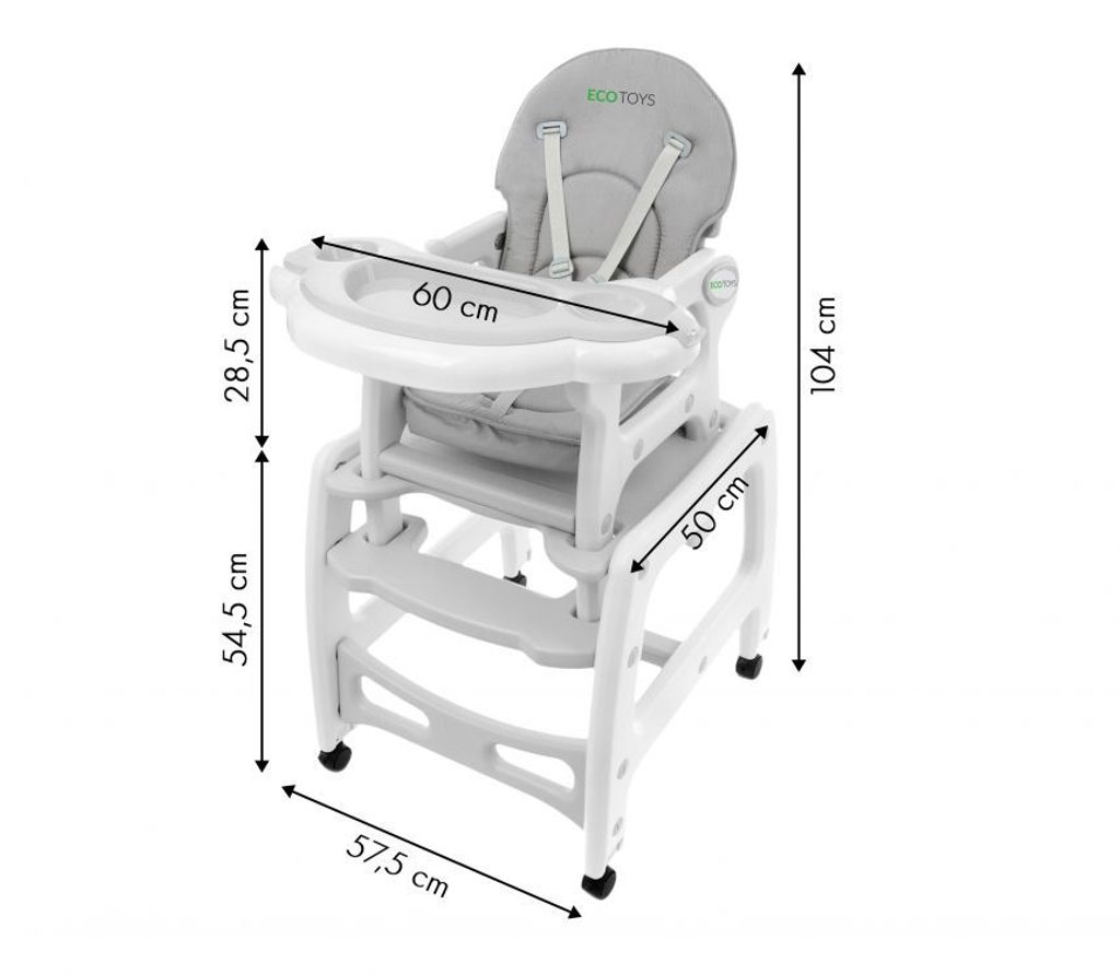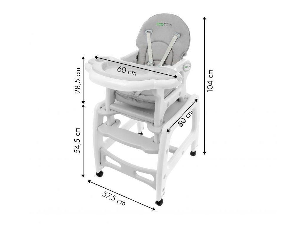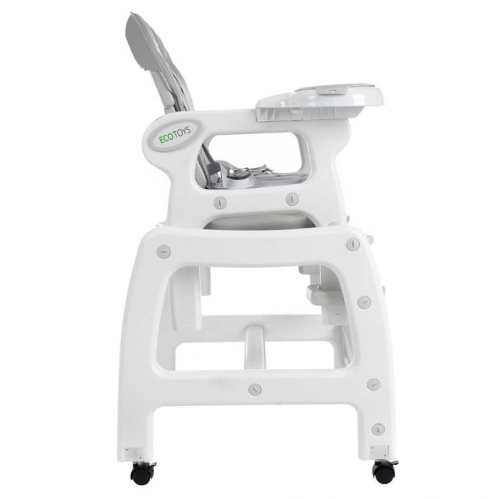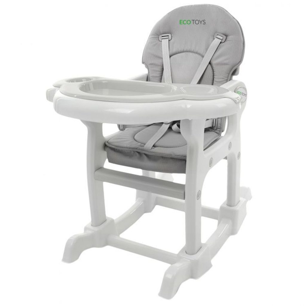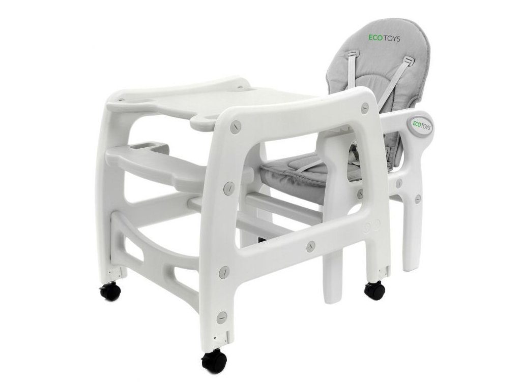 Multifunkční jídelní židlička Ecotoys 3v1. Můžete ji využít jako vysokou jídelní židličku, rozložit ji na židličku a stoleček nebo jako houpací křesílko. Kolečka jsou vybaveny brzdičkou takže můžete se židličkou snadno pohybovat. Dvojitý jídelní tác je nastavitelný a lze ho mýt v myčce. Praktický potah lze prát v pračce. Na ochranu dítěte před vypadnutím je židlička vybavena 5 bodovými bezpečnostními pásy. Židlička je určena ppro děti od 6 měsíců věku.