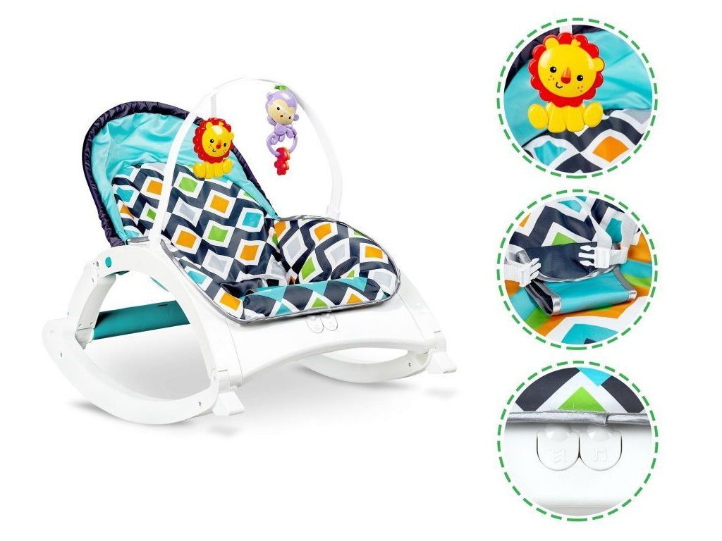 Ecotoys Animal 8 kojenecké lehátko 3v1. Dítě v něm může bezpečně odpočívat, spát a hrát si od prvních měsíců života. Potah je z měkkého a na dotek příjemného materiálu který lze prát v pračce. Díky elektronickému modulu lehátko vibruje a zklidňuje Vaše dítě. Nastavitelné tříbodové bezpečnostní pásy zaručují pohodlí a udržují dítě ve správné poloze. Pohon je velmi tichý proto nebude dítě vyrušovat ve spánku. Hradička se 2 zavěšenými hračkami a modul, který vydává 8 různých melodií. Lehátko je vybaveno nastavitelnými bezpečnostními pásy a systémem proti převrácení.