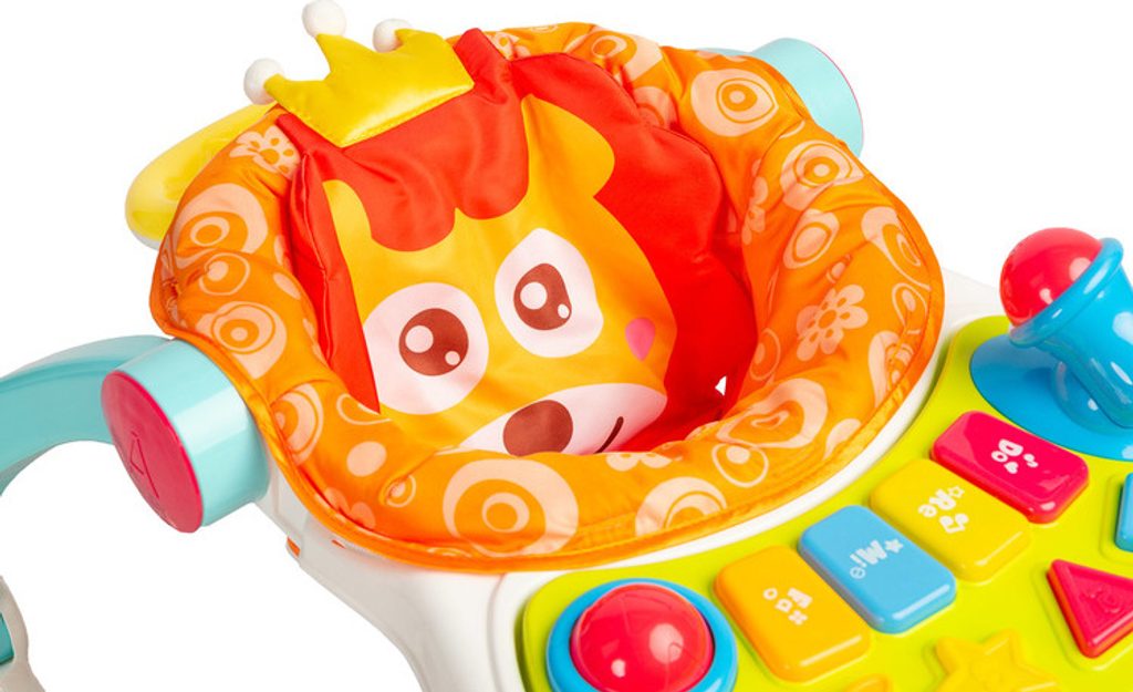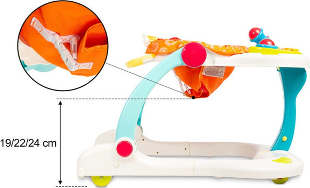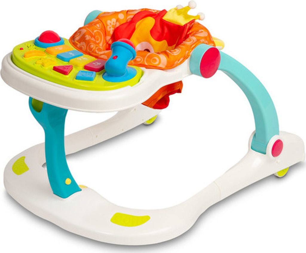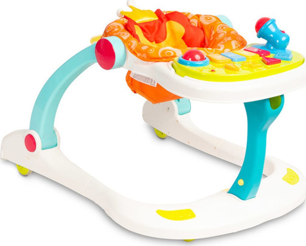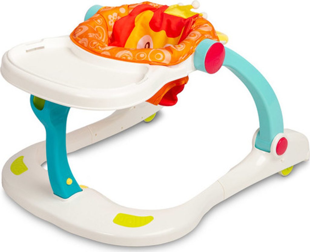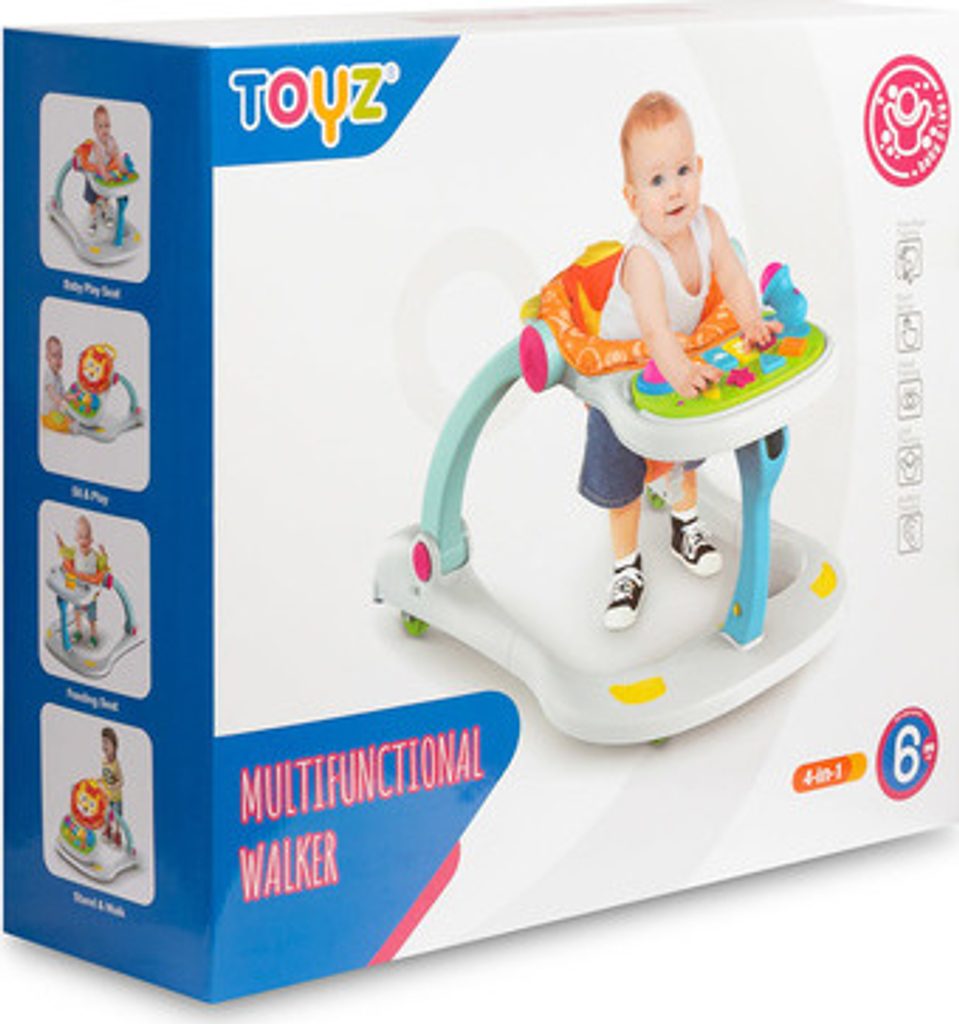Multifunkční chodítko Toyz je všestranné zařízení, které kombinuje až čtyři funkce. Lze jej používat jako chodítko, odrážedlo, nízkou židličku na krmení a hrací centrum, kde může dítě sedět. Chodítko je vybaveno uzamykatelnými gumovými kolečky, která usnadňují pohyb a nepoškrábou podlahu. Výšku sedátka lze nastavit pomocí zapínání na přezky tak, aby vyhovovala potřebám dítěte. Tvarovaná rukojeť připevněná k zadní části usnadňuje držení a nácvik chůze. Na přední straně chodítka je interaktivní panel, který podporuje rozvoj smyslů. Chodítko je napájeno bateriemi (3xAA). Má mikrofon, barevná svítící tlačítka, která vydávají zvuky, a dvoustupňové ovládání hlasitosti. Panel lze snadno odejmout a odhalit tak plochu pro krmení dítěte.