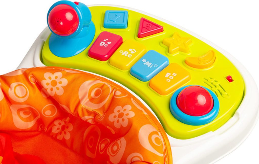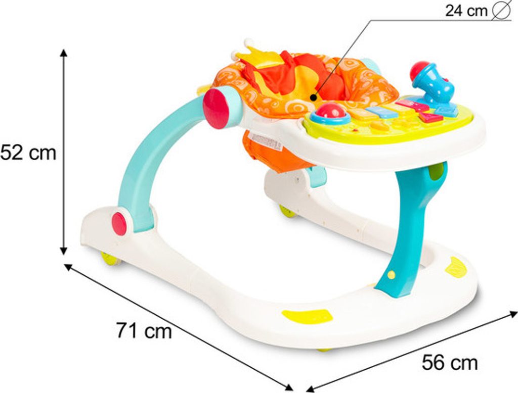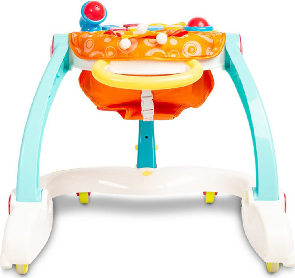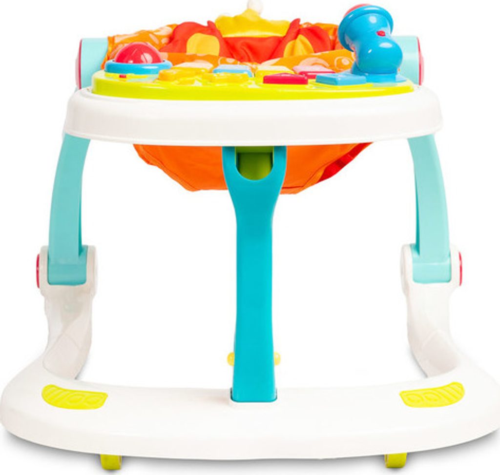4 funkce v 1: chodítko, odrážedlo, židlička na krmení a hrací centrum.