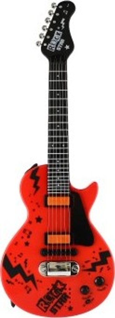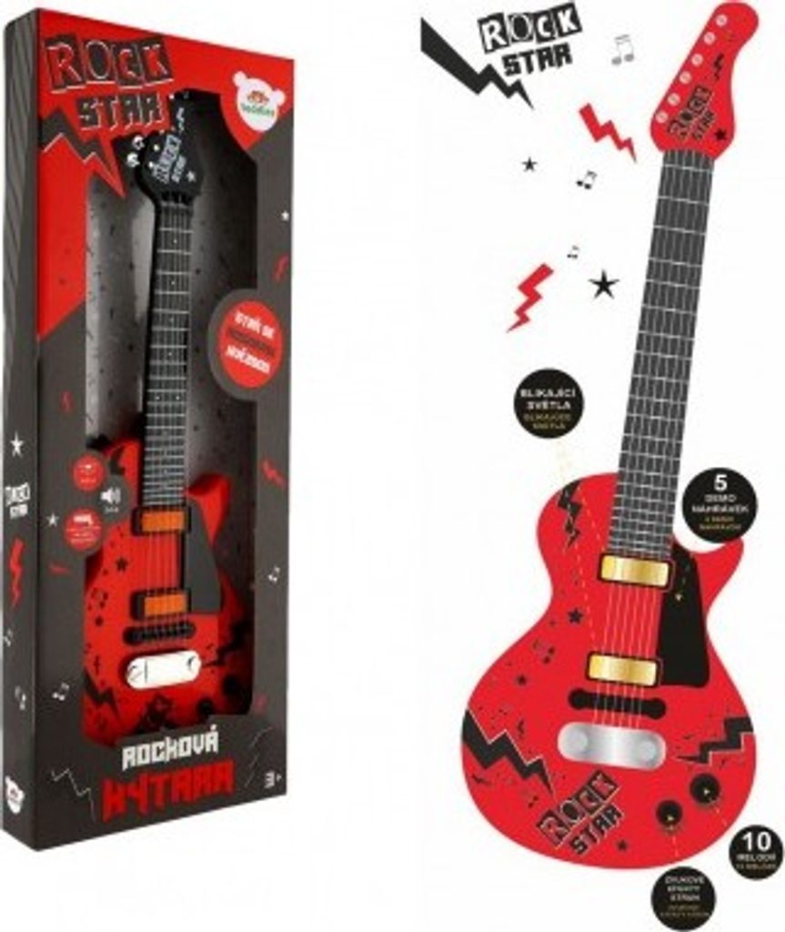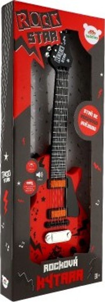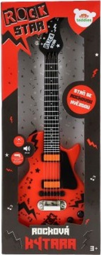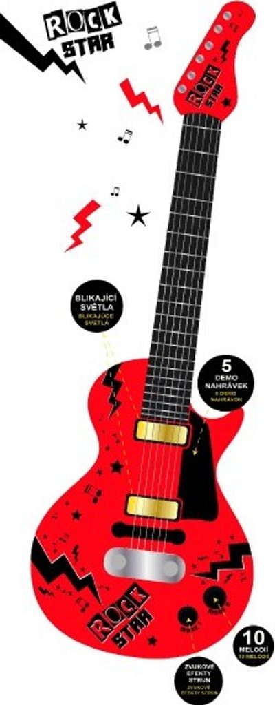 Dětská barevná kytara pro všechny milovníky nejen rockové hudby. Červená kytara s černými plameny a bílými doplňky. Kytara umí nejen hrát, ale hudbu doprovází i světelnými efekty! Funkce kytary: světelné efekty, pět demo nahrávek, 10 melodií a zvukové efekty strun...
