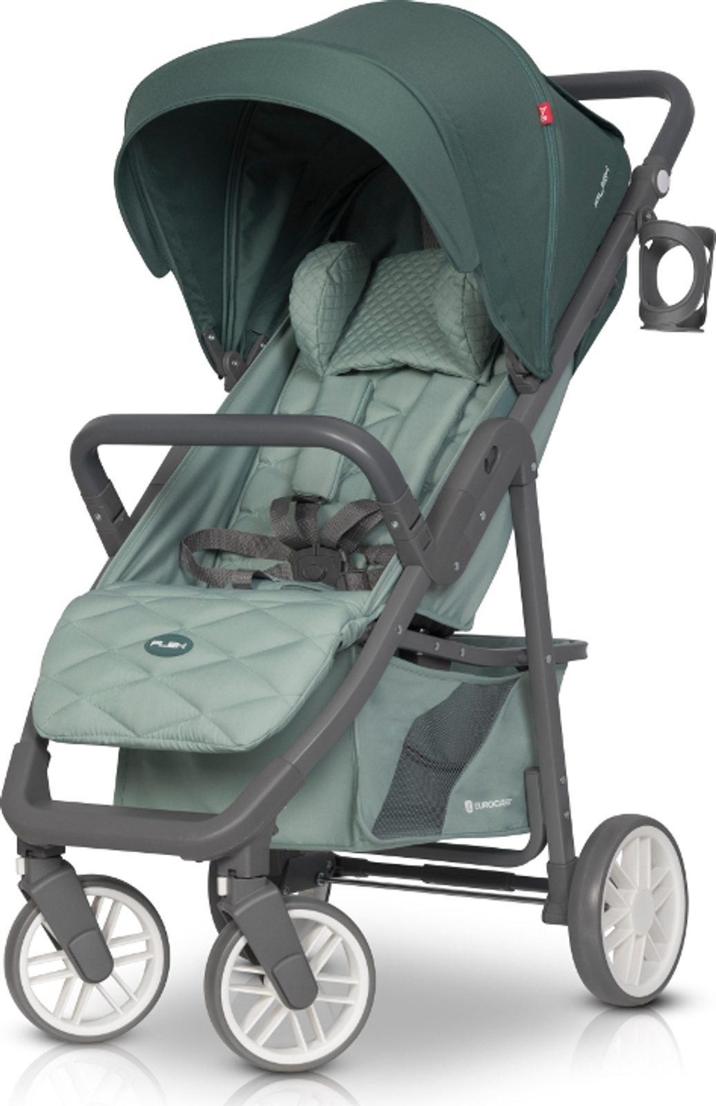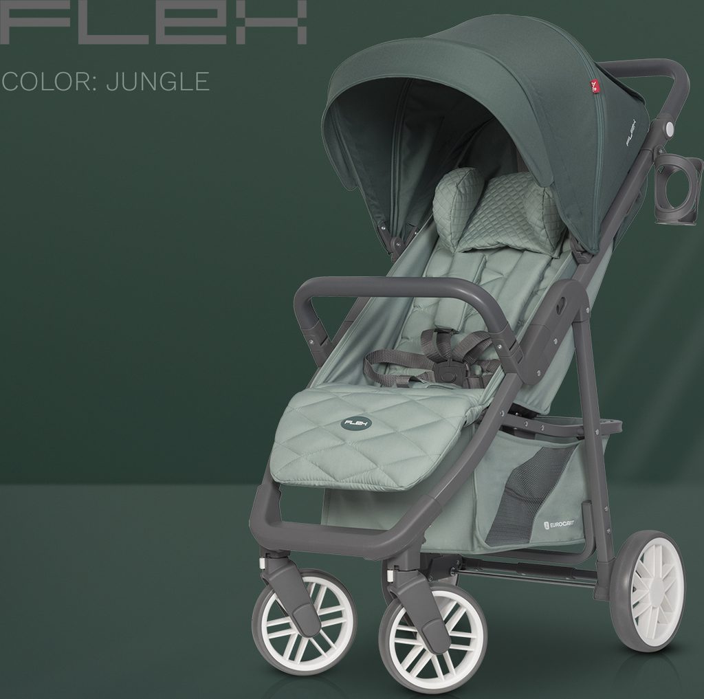 Sportovní kočárek EURO CART FLEX je "velkým bratrem" mimořádně oblíbeného modelu VOLT PRO. FLEX je ale větší kočárek s velkým sedátkem, který bude do konce vození určitě stačit. Maximální nosnost je 26,5 kg! Skládá se z maximální hmotnosti dítěte do 22 kg, zatížení korbičky pod kočárkem do 3 kg a volitelné tašky zavěšené na madle vozíku do 1,5 kg. Kola FLEXu jsou také větší než u jeho „bratříčka“. Pod kočárkem je velký nákupní košík s klopou na zip pro snadný přístup, když je zádová opěrka v leže. Díky výškovému nastavení rukojeti se FLEX pohodlně řídí pro vysoké i nízké rodiče. Snížení rukojeti také pomůže přivést kočárek k obrubníku. Nejnovější kolekce kočárku FLEX byla obohacena o dvě nové barvy: JUNGLE (odstíny zelené) a PEARL (odstíny šedé). Šedý matný rám dokonale ladí s šedými plastovými prvky, díky nimž FLEX dokonale ladí s nejmódnějšími barevnými trendy. Sedačka do kočárku FLEX je již certifikovaná pro děti od narození (0+ sedačka). To znamená, že v kočárku je možné přepravovat i děti, které ještě samy nesedí. Pamatujte však, že opěradlo by mělo být nastaveno v poloze vleže. Speciální 5-ti bodové bezpečnostní pásy jsou výškově nastavitelné, díky čemuž bude sedačka pohodlná pro miminko i velké dítě do hmotnosti 22 kg. Sluneční stříška je zavěšena vysoko na zádové opěrce kočárku, což znamená, že FLEX bez problémů pojme dítě o hmotnosti až 22 kg. Velká přídavná část budky je ukryta pod zipem. Po otevření můžete stříšku naklonit dopředu a dítě tak téměř zcela zakryjete. Nezapomněli jsme ani na vyhlídkové okénko dítěte. Nastavování budky má pohodlný a tichý mechanismus, který zajišťuje její stabilní polohu (vítr budku nesloží). V zadní části kočárku je velký větrací panel na zip a praktická kapsička na drobnosti. FLEX je standardně dodáván s širokou řadou příslušenství. Spolu s vozíkem dostanete návlek na nohy (ohřívač), celopláštěnku s větracími otvory, moskytiéru a držák na láhev.