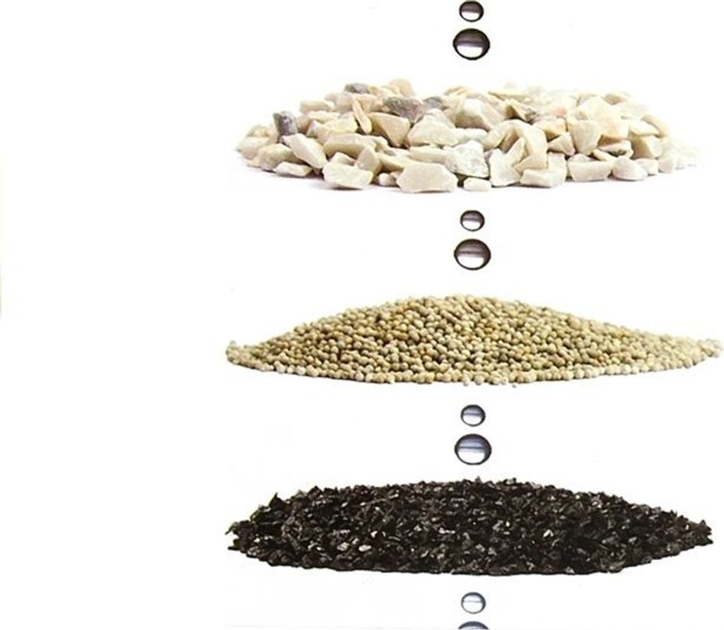 - 6 sáčků s materiálem potřebným k provedení filtračního procesu (granitové kamenivo, pískové granule, aktivní uhlí, křemičitý písek, ledek, hlinitan draselný)