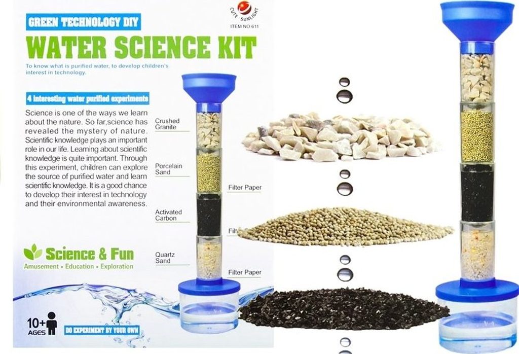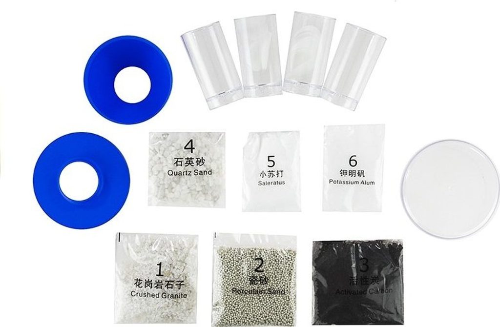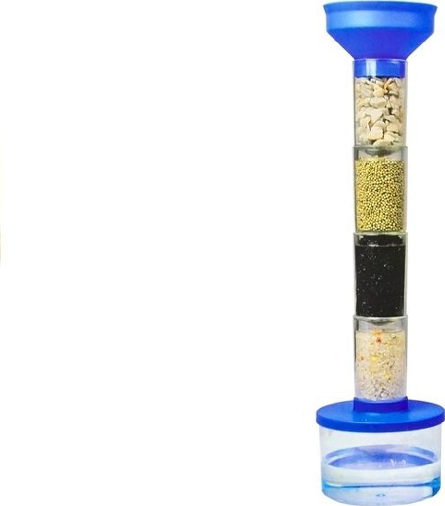 Vědecká sada, díky které se děti mohou naučit proces čištění vody a kapalin metodou pískové filtrace.