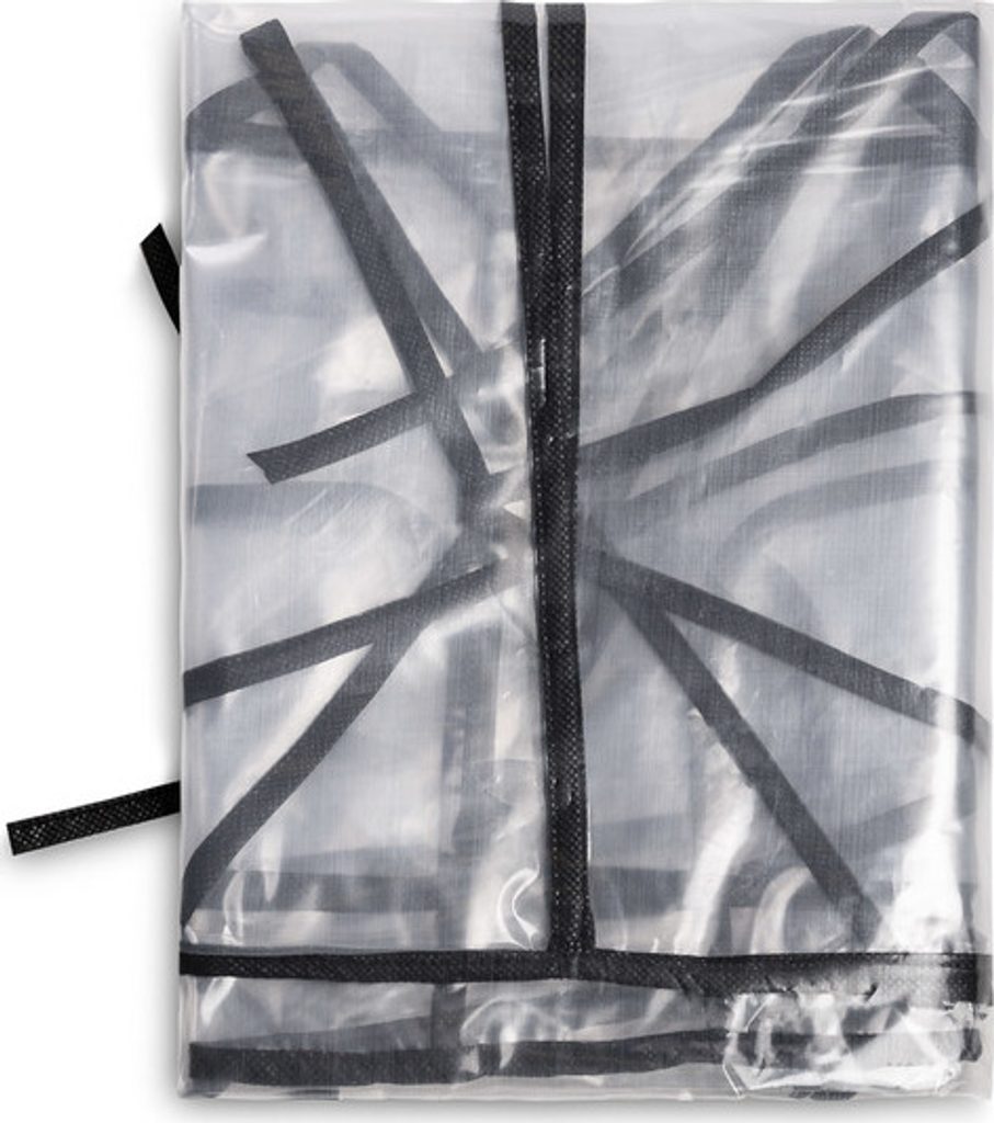 Obal je vzadu rozdělen na dvě části, takže jej lze nasaditi na kočárky, které mají v rukojeti středový sloupek. Má šňůrky pro snadné připevnění.