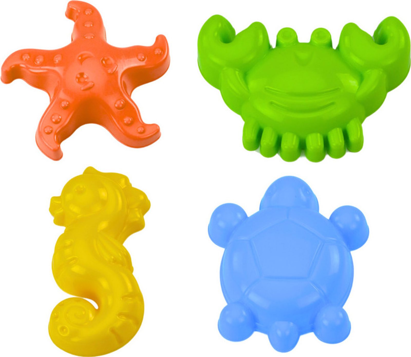 Sada pískových forem je fantastický nápad pro děti, které milují trávení času na pláži, na pískovišti nebo na zahradě. Sada obsahuje čtyři různé barevné formy: zeleného mořského koně, modrou želvu, oranžovou hvězdici a žlutého kraba.