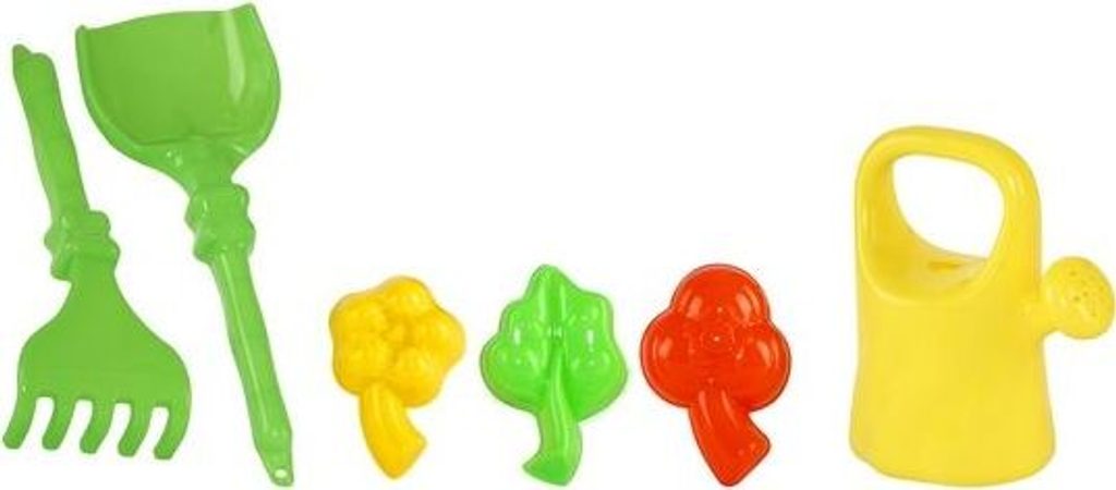 Sada do písku, která se skládá ze 6 doplňků: středních hrábě a lopata, 3 formy ve tvaru listu a mini konve. Výrobek je vyroben z odolných a bezpečných materiálů, takže si s ním může hrát každé dítě. Sada je k dispozici v různých barevných konfiguracích.