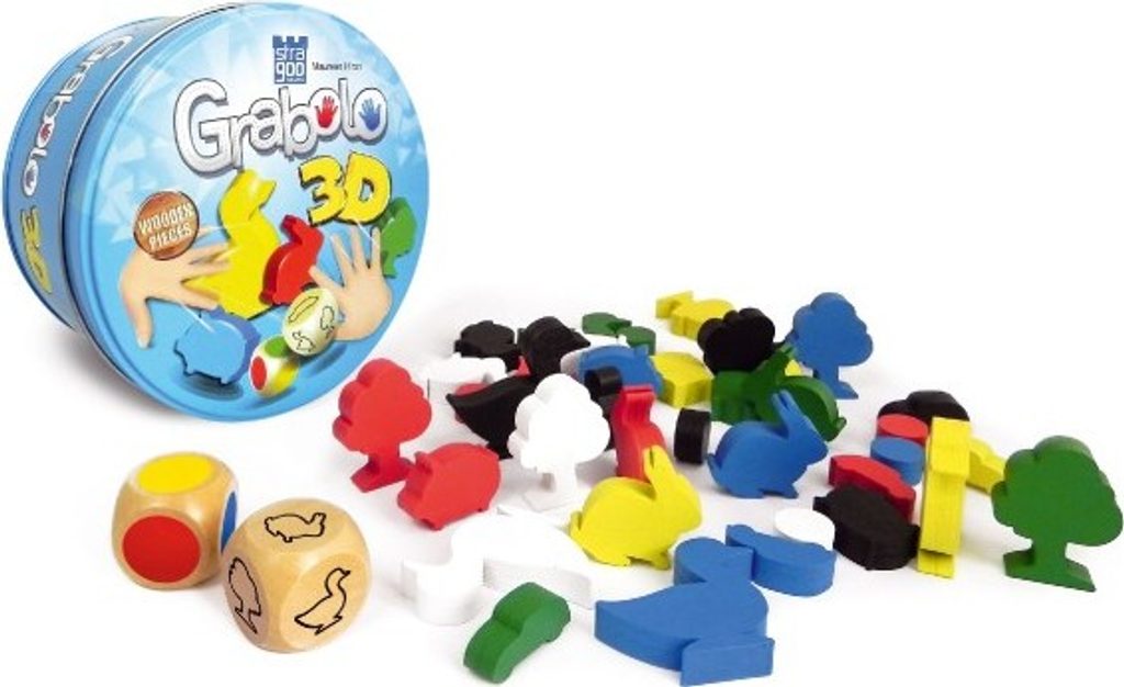 Další varianta oblíbené postřehové hry GRABOLO, tentokrát s dřevěnými figurkami. Dokaž, že máš nejrychlejší ruce, ostří zrak a skvělou paměť. Kostky určí kombinaci barvy a tvaru, ty najdi správnou figurku jako první. Cílem hry je získat předepsaný počet figurek. Plechová krabička obsahuje 36 dřevěných 3D figurek, barevnou a obrázkovou kostku. Hra je určena pro 2 - 4 hráče, trvá 6 - 10 minut, doporučený věk 4 - 99 let.
