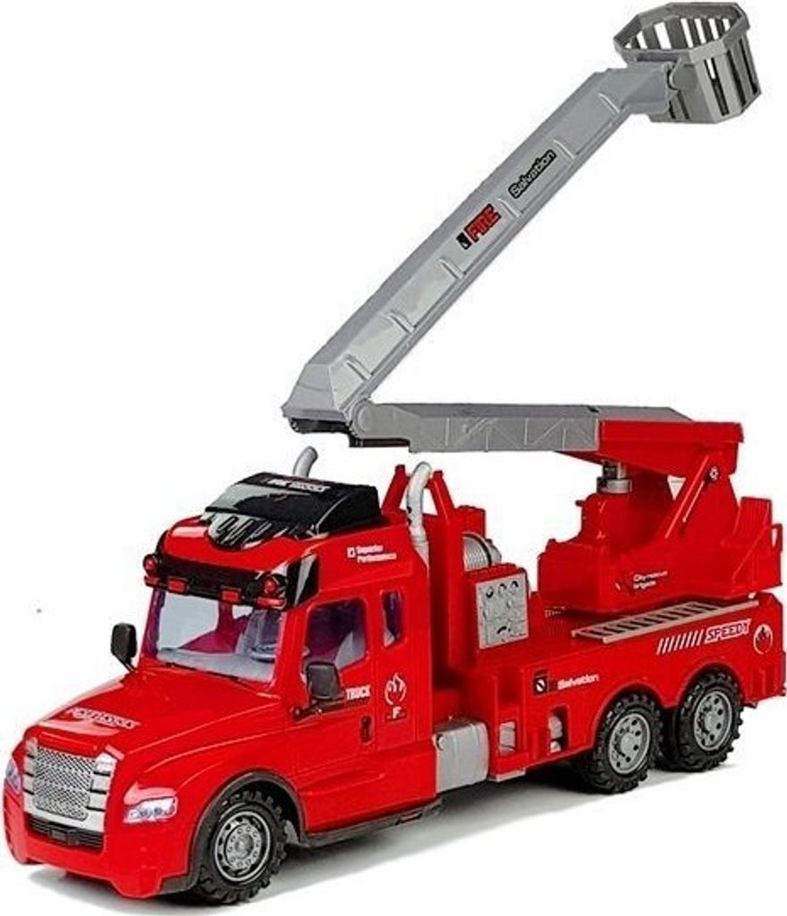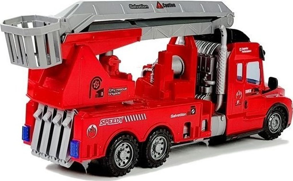 Červené velké hasičské auto je namontováno na plastových kolech. Snadno si poradí s drobnými nerovnostmi v cestě. Ve struktuře vozidla byly zvýrazněny nejdůležitější prvky, díky nimž působí jako plnohodnotný protějšek.