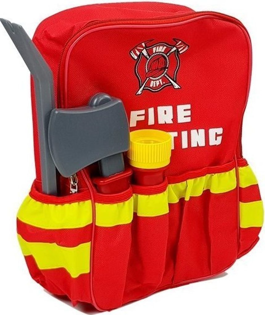 Hasičský batoh má žluté odrazky na červeném podkladu s nápisem naznačujícím hašení. Kolem má malé kapsičky, kam si můžete dát šikovné vybavení. Hasicí přístroj funguje jako sprinkler - stačí do něj nalít vodu a uhasit požáry! Prostřednictvím megafonu můžete oznamovat důležité zprávy a pomocí přiložené baterky osvětlovat temné uličky. Malý hasič bude mít z dárku radost a zábava nikdy neskončí!