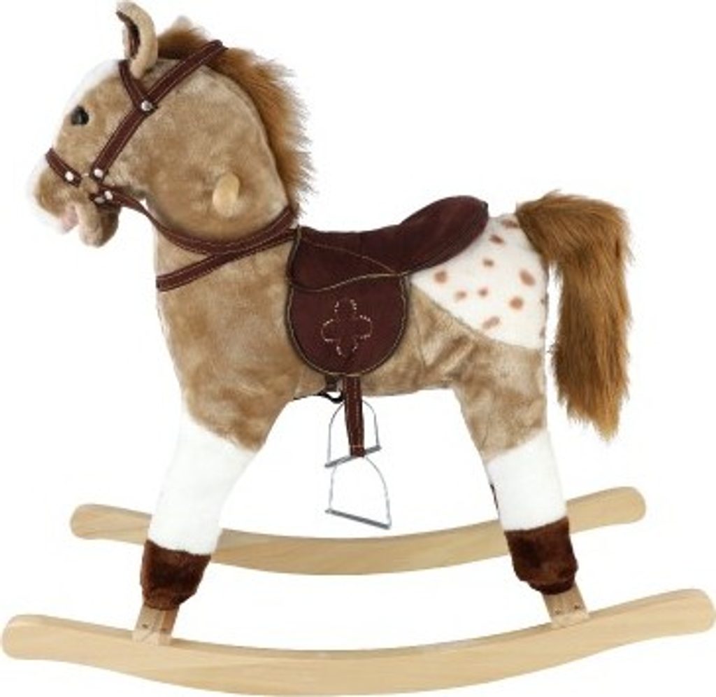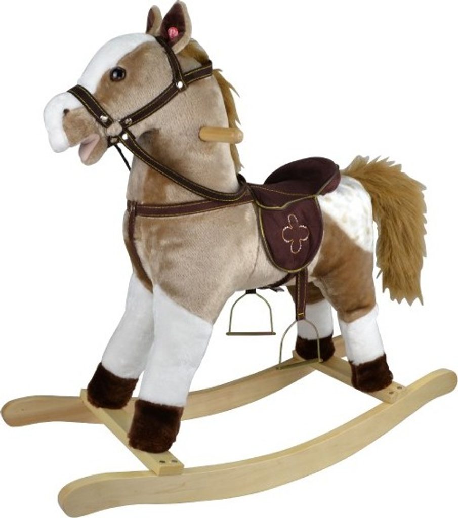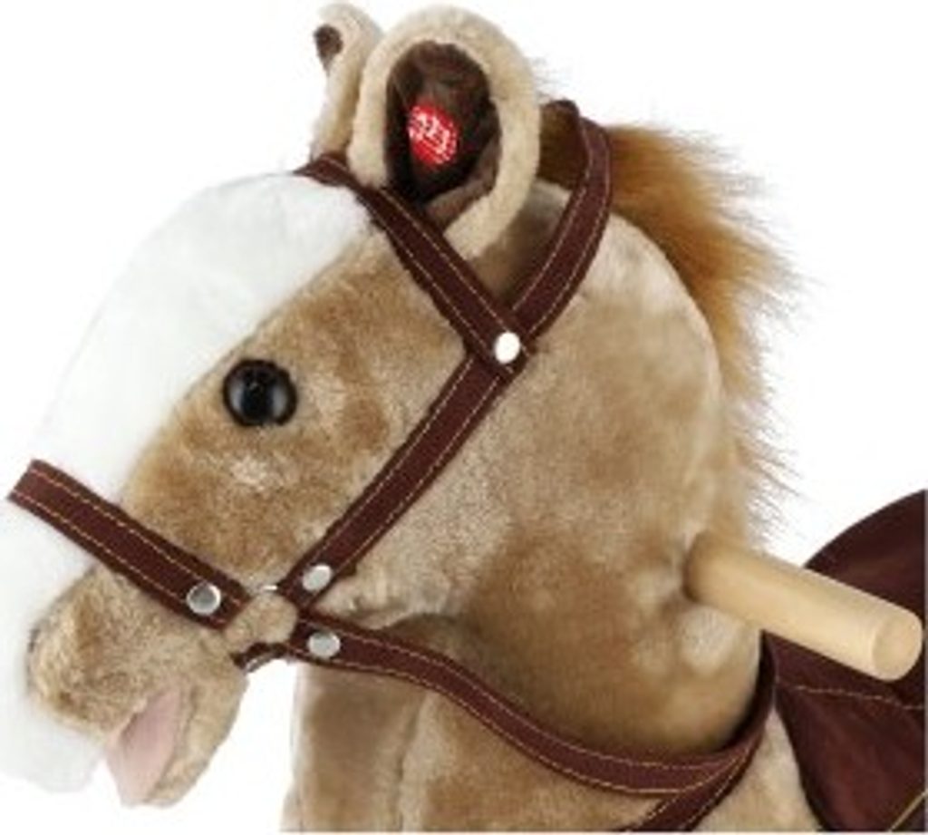 Heboučký houpací kůň po zmáčknutí ouška řehtá a hýbe ocáskem. Po zmáčknutí druhého ouška vydává zvuky klapotu podkov při klusu a hýbe ocáskem. Baterie se vkládají do pouzdra umístěného na bříšku. Hračka pomáhá dítěti rozvíjet koordinaci pohybů a podněcuje jeho představivost. Návod na sestavení a vložení baterií je uvnitř krabice. 3ks baterií AA nejsou součástí balení.