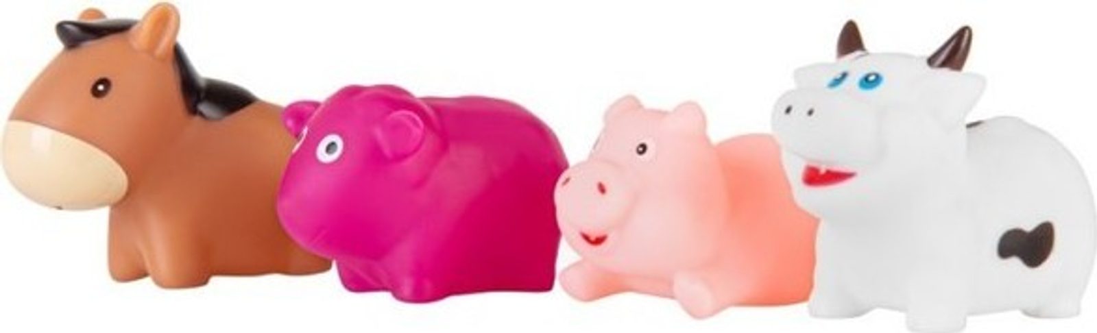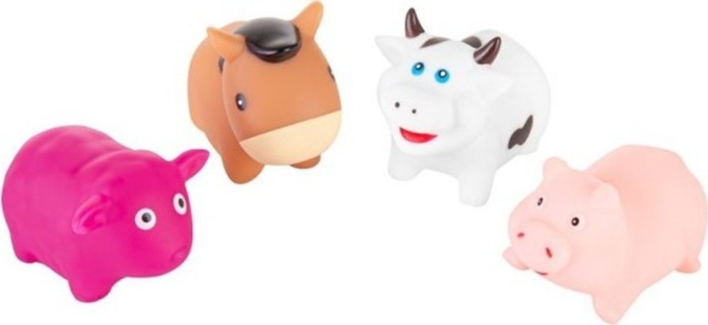 Sada 4 barevných hraček Farma do vany. Jedinečný a jedinečný design. Živé barvy přitahují pozornost dětí.
