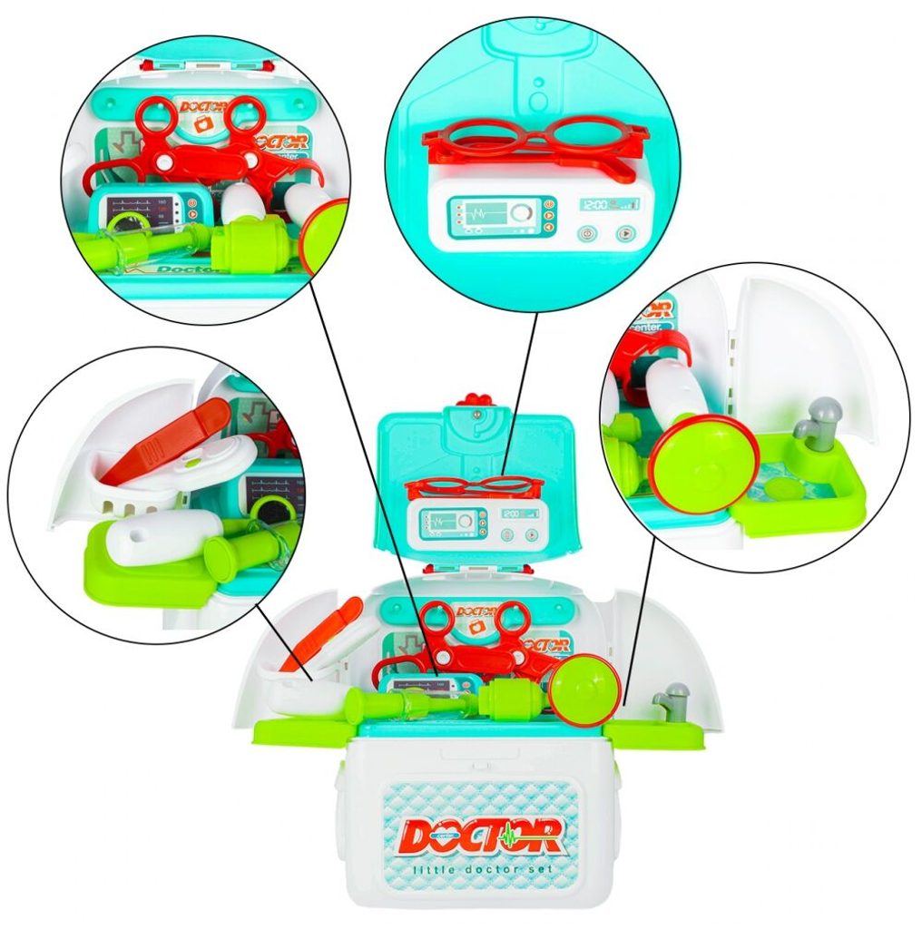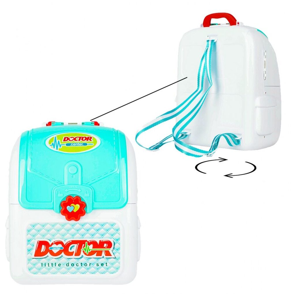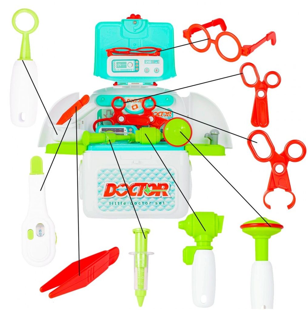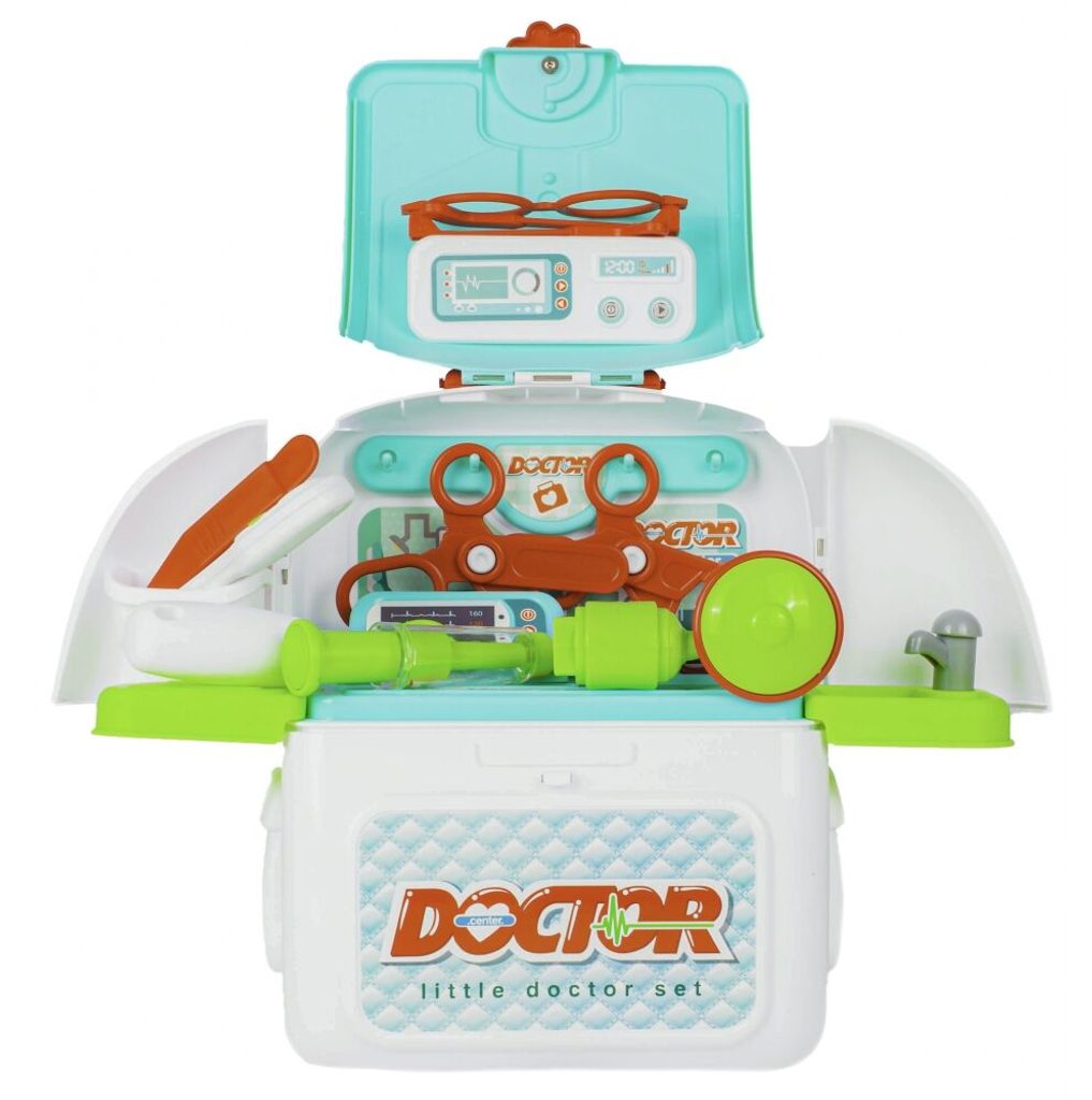 Lékařský batůžek Malý doktor je určen pro děti od 36 měsíců věku. Je vybaven celkem mnoha součástmi. Jako základ slouží praktický rozkládací batůžek ve kterém je vše uloženo. Uvnitř najdete teploměr, zrcátko, stříkačku, kleště, brýle, pinzetu, přístroj na vyšetření uší a nůžky. Batůžek má také dvě boční poličky. Vaše dítě se určitě s touto hračkou nudit nebude a návštěva u skutečného doktora pro něj nebude tolik stresující. Kufřík a vše uvnitř je vyrobeno z plastu v pestrobarevném provedení.