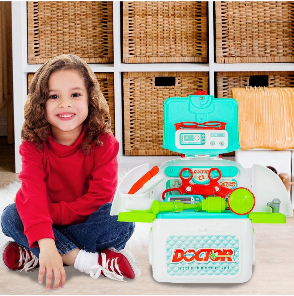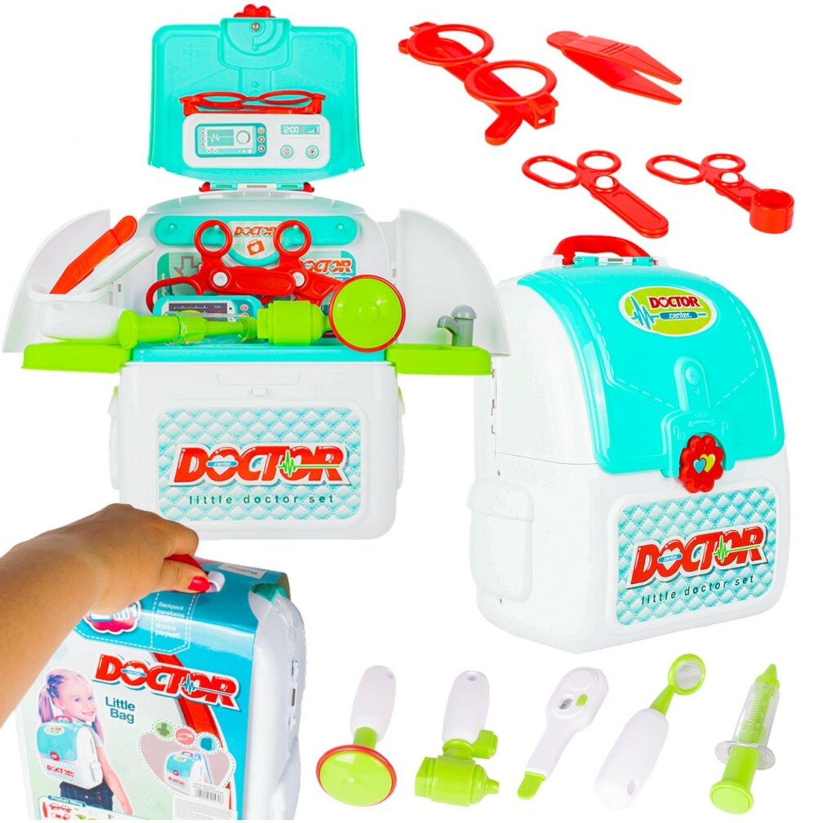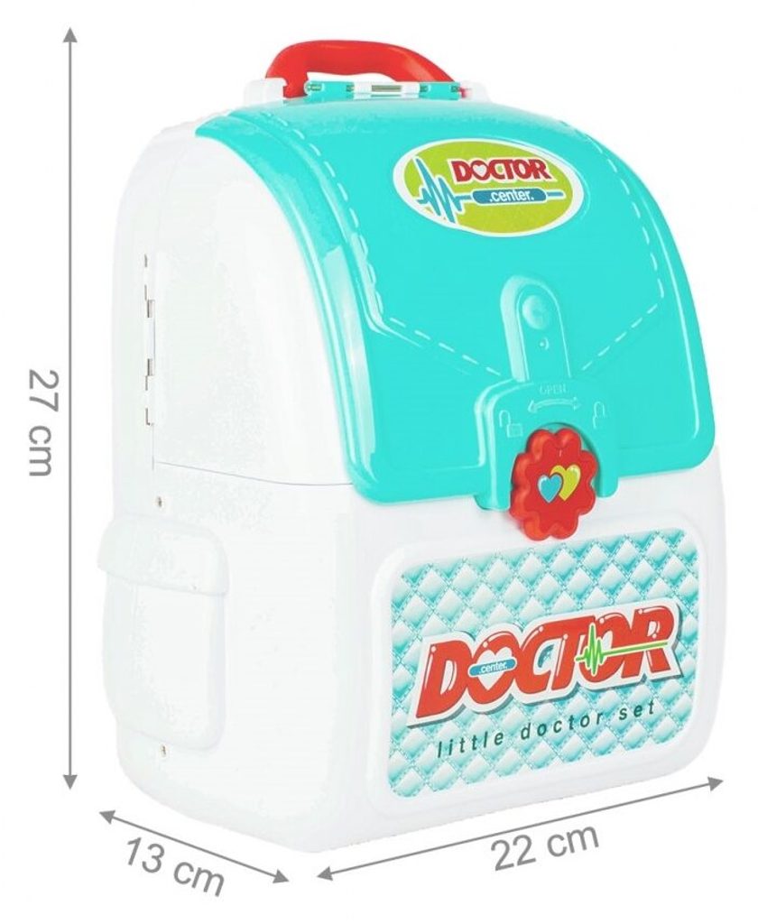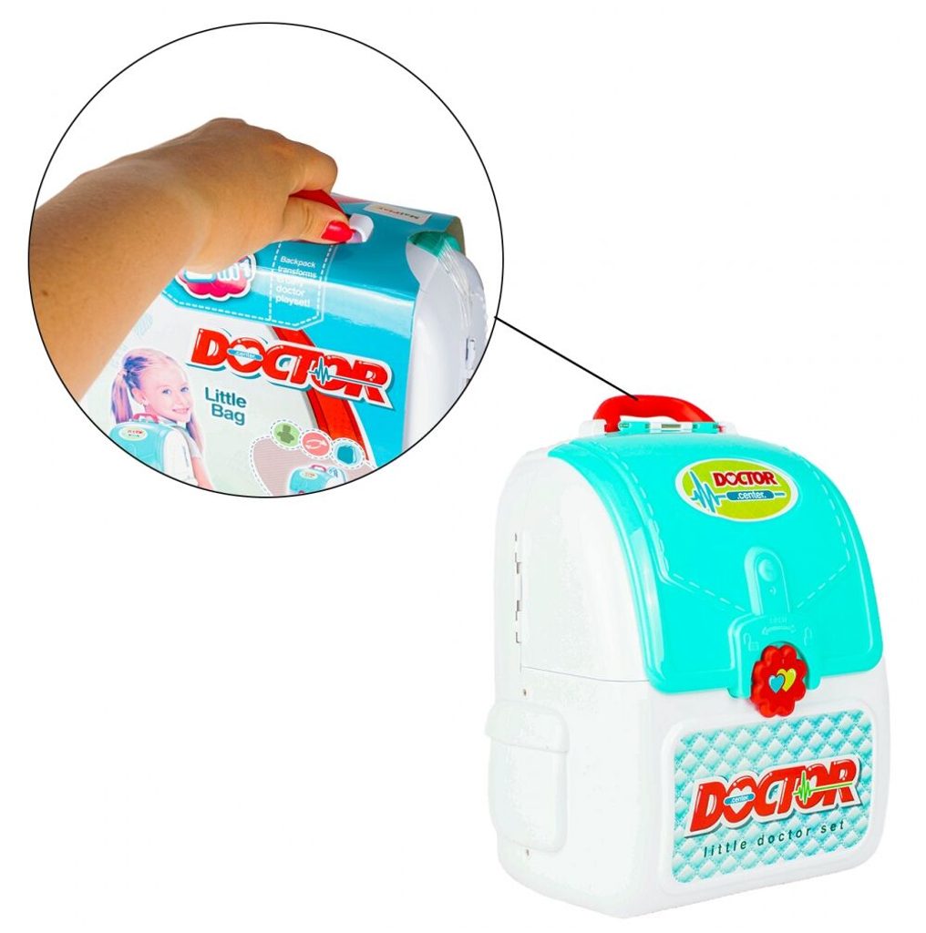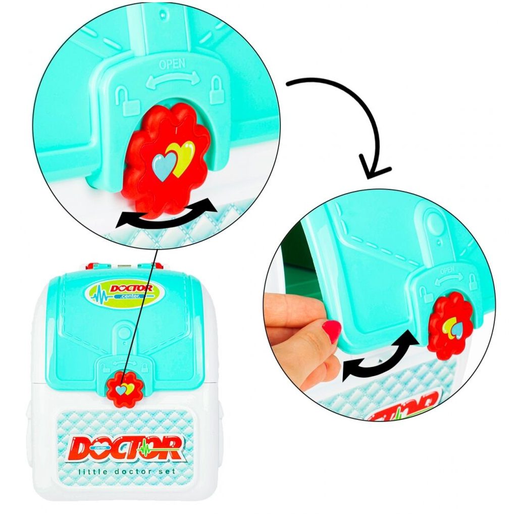 Lékařský batůžek Malý doktor je určen pro děti od 36 měsíců věku. Je vybaven celkem mnoha součástmi. Jako základ slouží praktický rozkládací batůžek ve kterém je vše uloženo. Uvnitř najdete teploměr, zrcátko, stříkačku, kleště, brýle, pinzetu, přístroj na vyšetření uší a nůžky. Batůžek má také dvě boční poličky. Vaše dítě se určitě s touto hračkou nudit nebude a návštěva u skutečného doktora pro něj nebude tolik stresující. Kufřík a vše uvnitř je vyrobeno z plastu v pestrobarevném provedení.