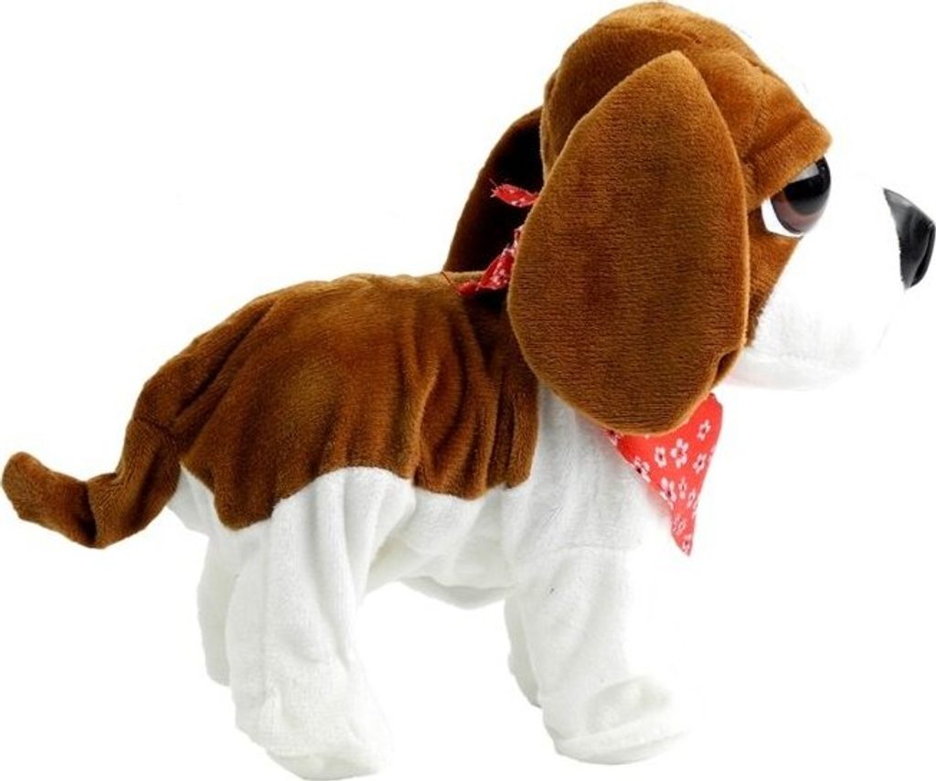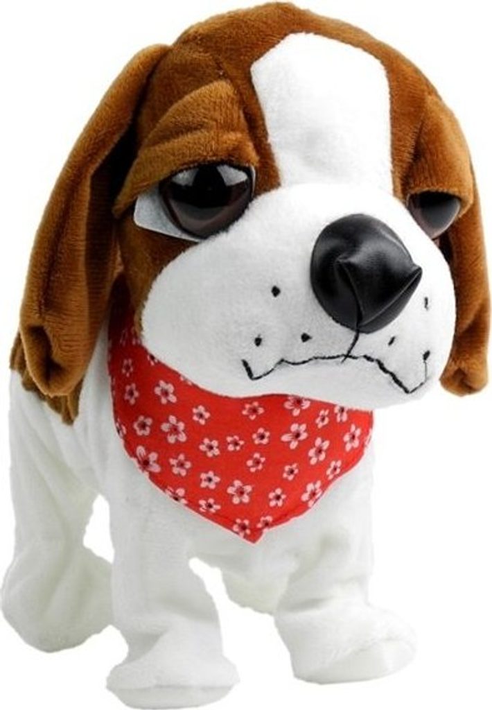 Hnědobílý pes na vodítku je vyrobena z měkkého a netoxického, 100% ekologického materiálu, který je velmi příjemný na dotek. Zvíře má velké tmavé oči, vyčnívající ocas a velký nos, který jemně jiskří. Zdobí ho červený kapesníček, který mu dodává kouzlo.