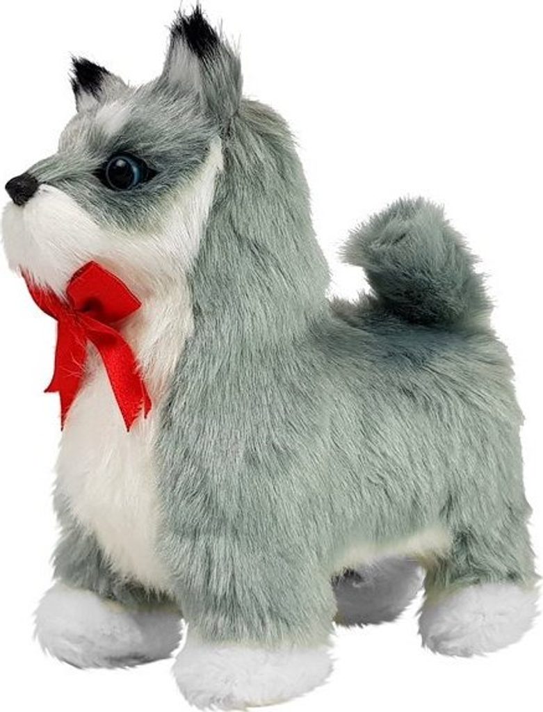 Pes má šedou srst, s prvky bílé na tlapkách, tlamě a trupu, modrá barva očí upoutá. Napodobuje skutečného psa tohoto plemene. Půvab mu navíc dodává krásná červená mašlička kolem krku.