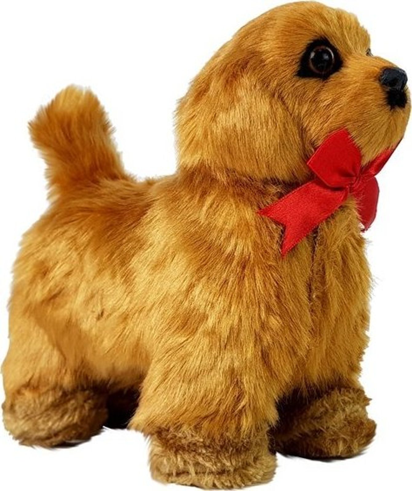 Pes má hnědou srst a tmavě hnědé oči, které přitahují pozornost. Napodobuje skutečného psa. Půvab mu navíc dodává krásná červená mašlička kolem krku.