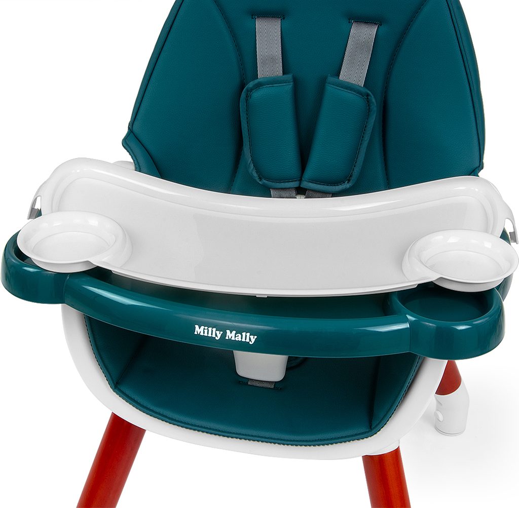 Pětibodové bezpečnostní pásy se širokými a měkkými ramenními vycpávkami chrání dítě před odřeninami. Čalounění židle Malmo z ekokůže je odolné proti znečištění a snadno se čistí. Tác má prohlubeň, která zabraňuje sklouznutí předmětů.