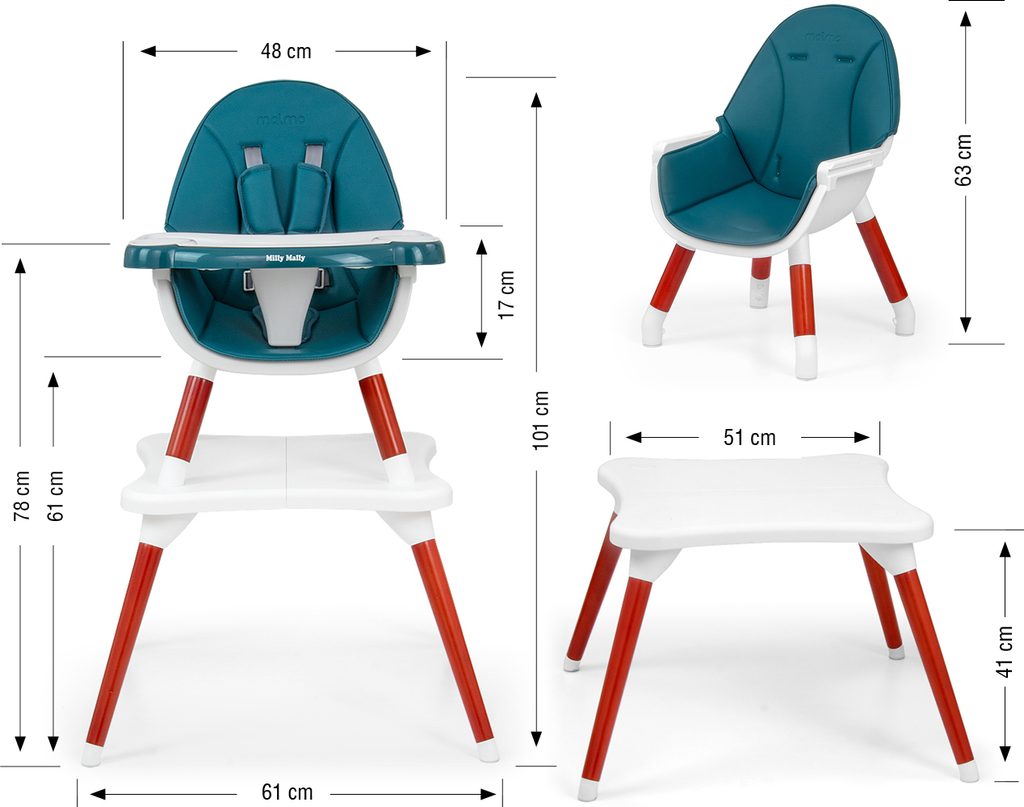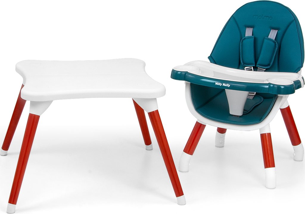 Moderní a stylová dětská jídelní židlička 2v1 Malmo. Je vyrobena z nejkvalitnějších materiálů - kombinuje funkčnost a moderní design. Verze vysoké židle je určena pro děti od 6 měsíců do 36 měsíců nebo při dosažení hmotnosti 15 kg a verze nízké židle plus stůl pro děti od 3 do 6 let nebo při dosažení hmotnosti 25 kg.