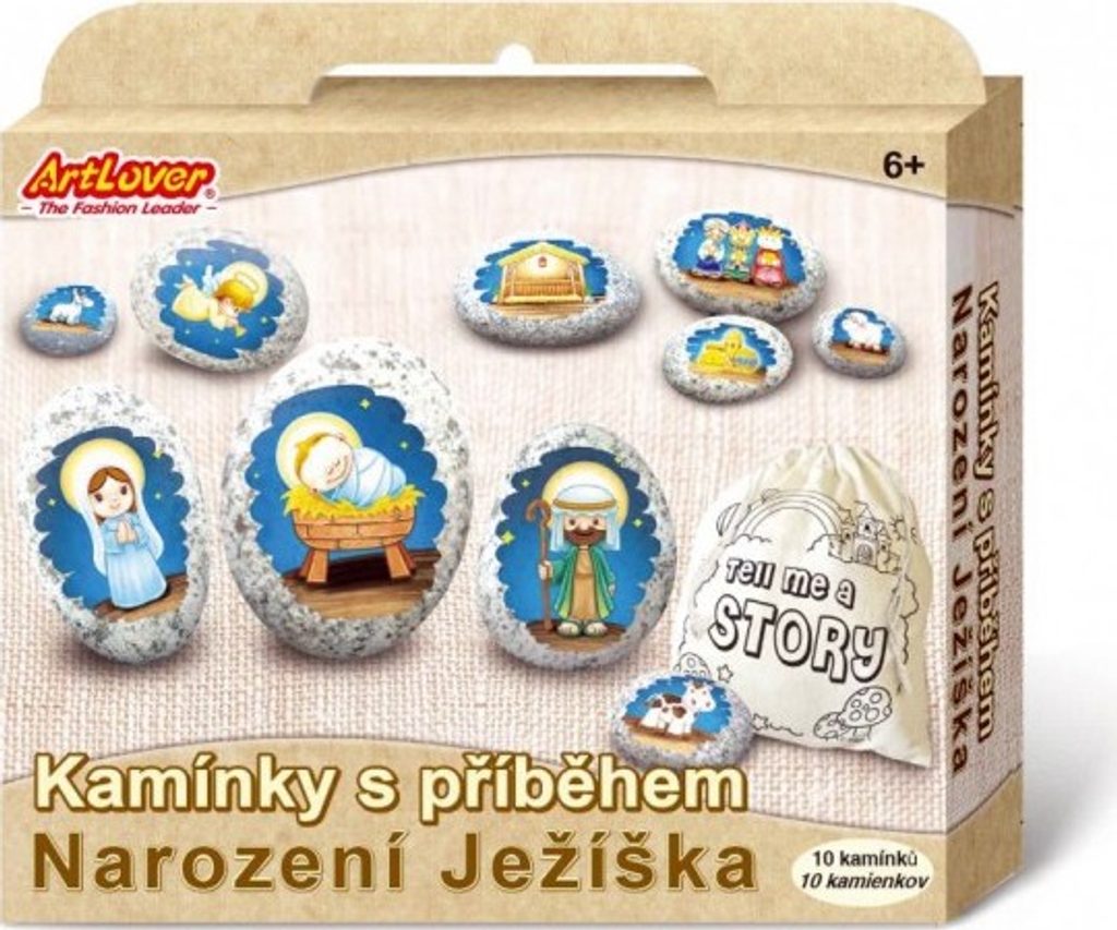 Všechny kamínky nejprve omyj a nech oschnout. Odstraň fólii ze zadní strany přenosové samolepky. Samolepku umísti zadní stranou tam, kde chceš mít obrázek. Pomocí špachtle obrázek přenes na kamínek. Pořádně přitlač a snaž se samolepkou nehýbat. Je-li obrázek přenesen, velmi opatrně snímej již prázdnou část samolepky. Přenesený obrázek ještě jenou opatrně uhlaď. Kamínky jsou hotové! Pokus se podle nich vyprávět příběh o Narození Ježíška.