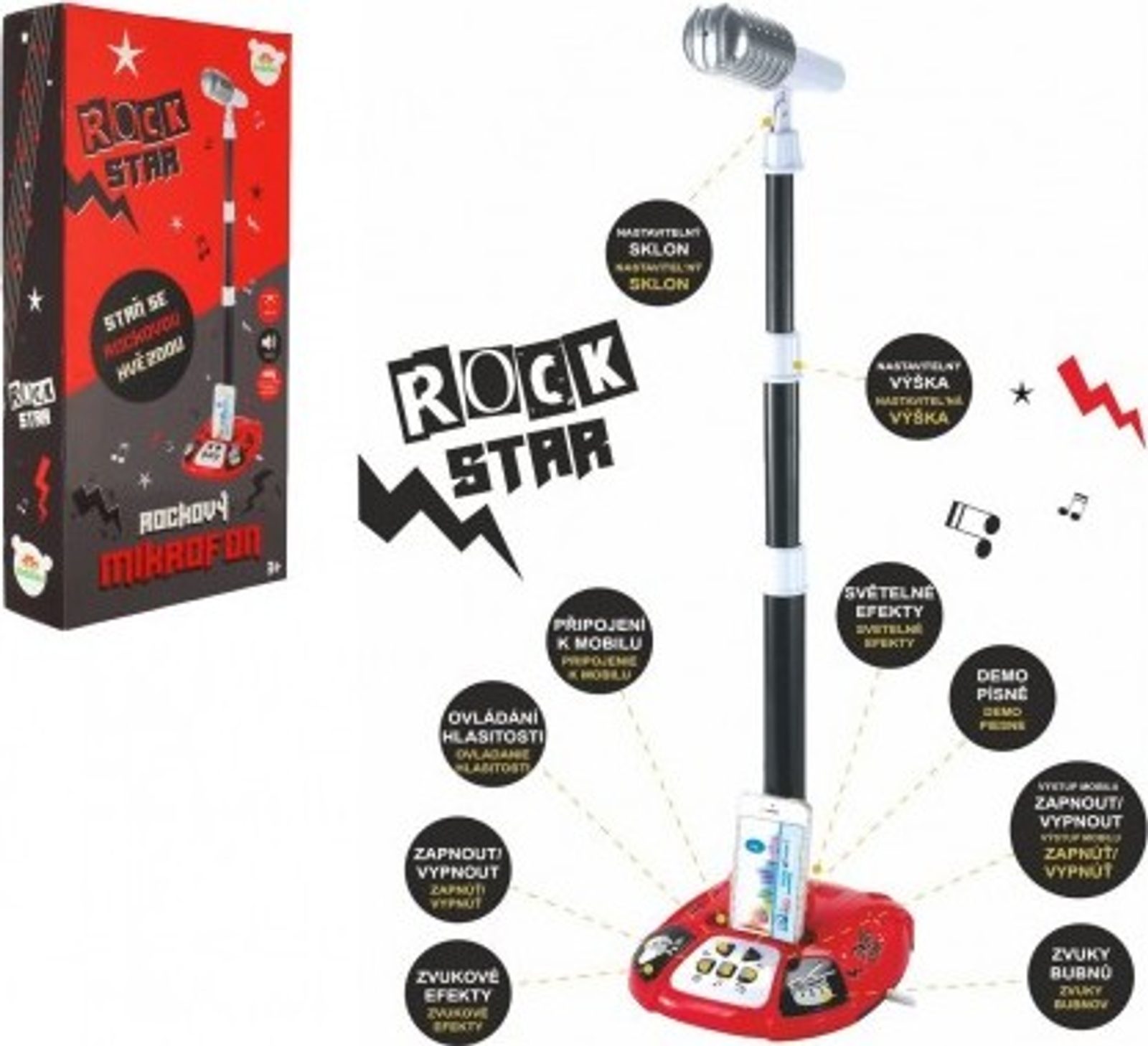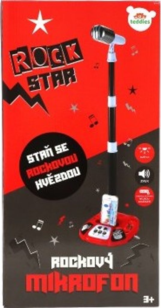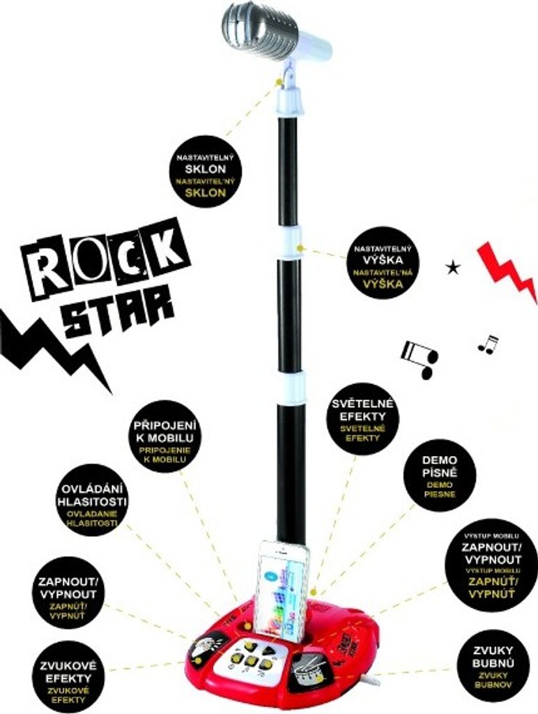 Máte doma rockovou hvězdu a ještě nemá pořádný mikrofon? Tak neváhejte a pořiďte mikrofon se skvělými efekty. Vaše děti se budou cítit jako hudební hvězdy. Překvapí Vás mnoho funkncí: zvukové efekty, ovládání hlasitosti, možnost připojení k mobilu, nastavitelný sklon a výška mikrofonu, světelné efekty, demopísně, zvuky bubnů... Minimální výška mikrofonu je 55 cm.