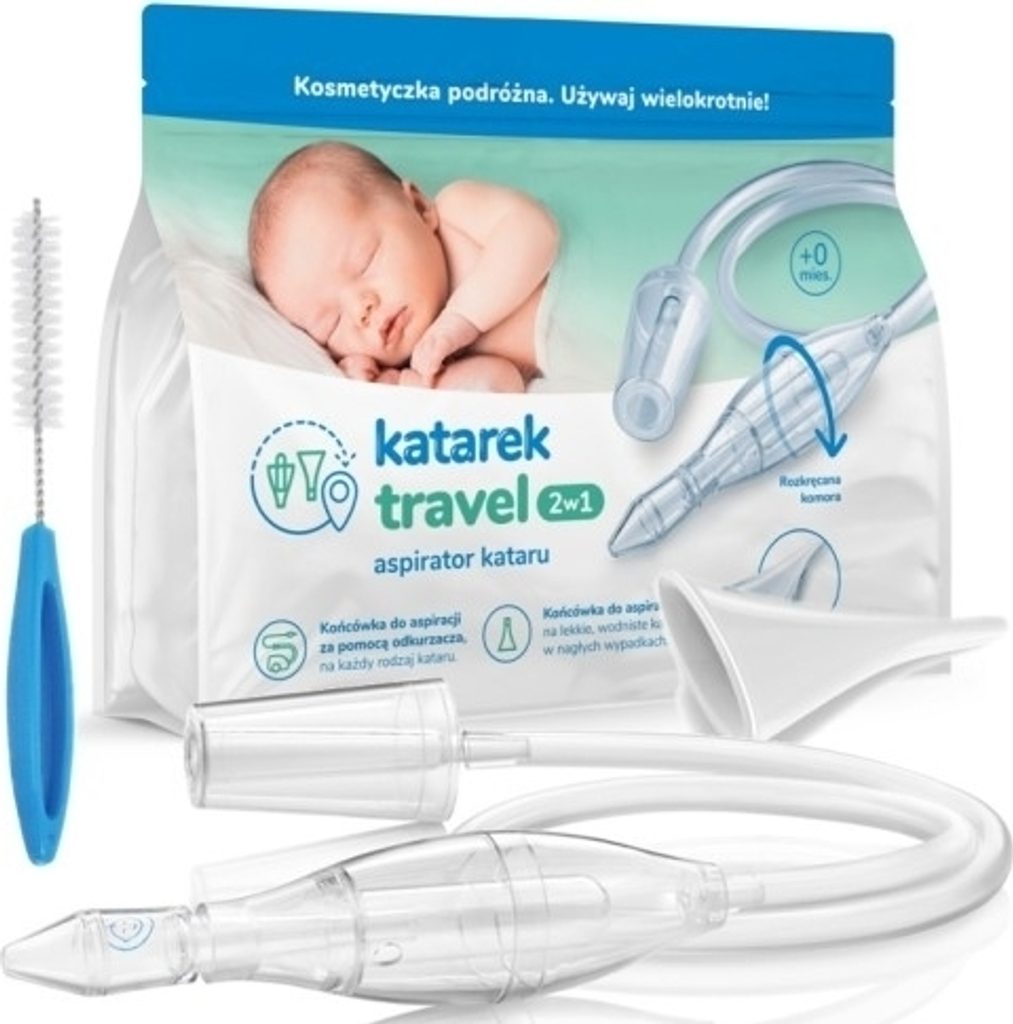 Katarek Travel je odsávačka, která kombinuje dvě řešení v jednom zařízení. Po připojení k zařízení (800 / 1800W) během několika sekund odstraní zbývající sekret z nosu dítěte a umožní mu volně dýchat. Sada obsahuje také koncovku pro ústní odsávání, dále kartáček a přídavnou koncovku.