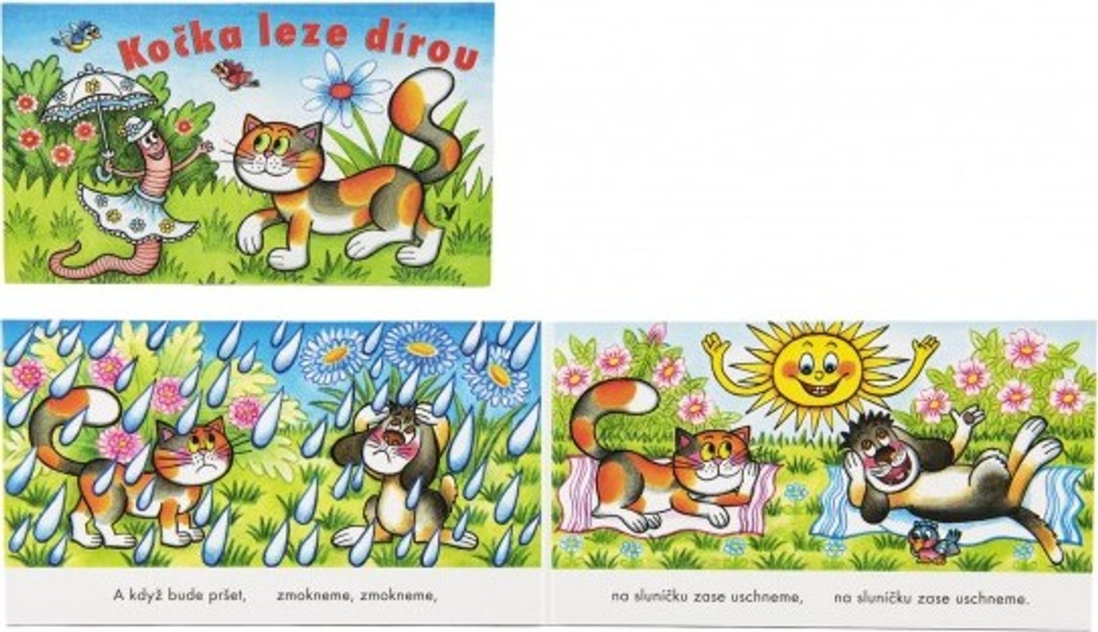Kočka leze dírou, pes oknem! Malé rozkládací leporelo přináší lidovou písničku Kočka leze dírou a dětské verše Václava Bláhy Tancovala žížala, které se děti snadno naučí zpaměti. Výrazné rytmické verše doprovázejí líbivé a názorné ilustrace a dítě si bude při jejich prohlížení rozvíjet paměť i slovní zásobu. Leporelo tak svým charakterem navazuje na velmi úspěšný titul Polámal se mraveneček. Pro čtenáře od 6 let.