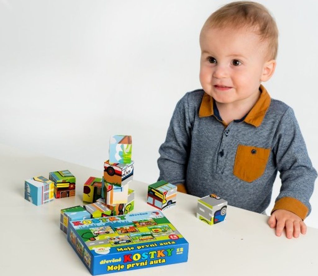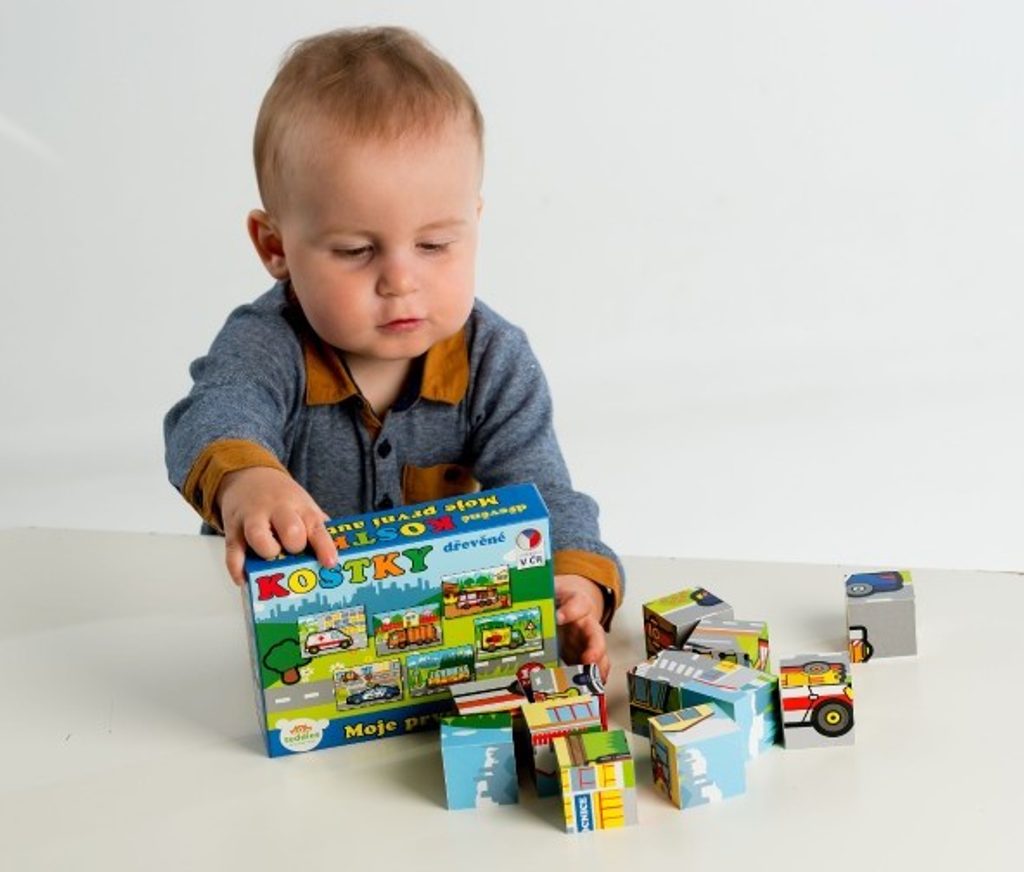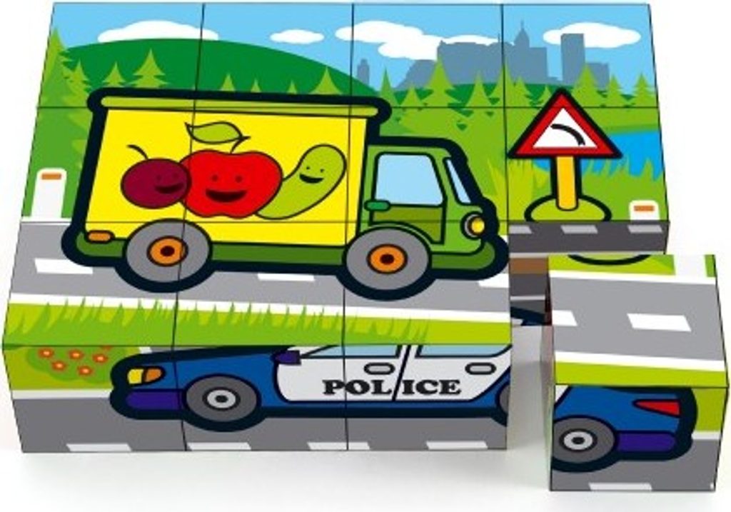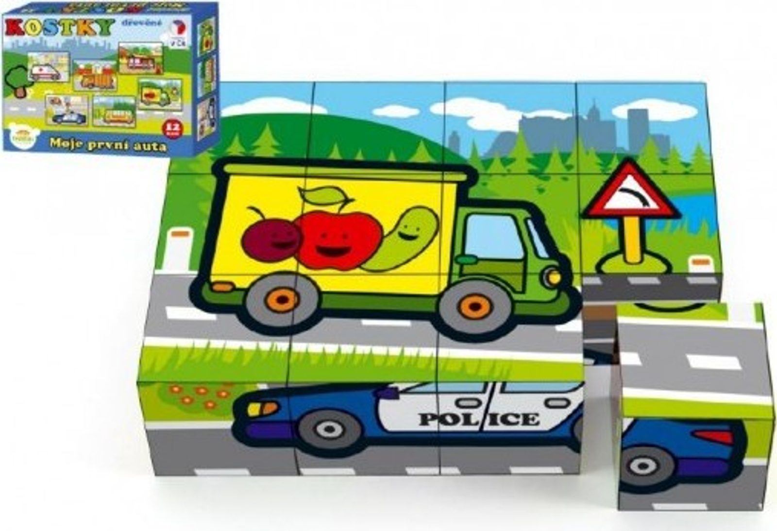 Dřevěné kostky s obrázky dopravních prostředků. Kostky s motivy aut jsou uloženy v praktické papírové krabičce. Balení obsahuje předlohy pro snadnější skládání.