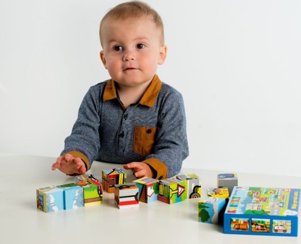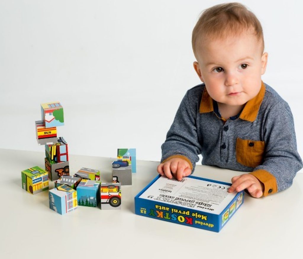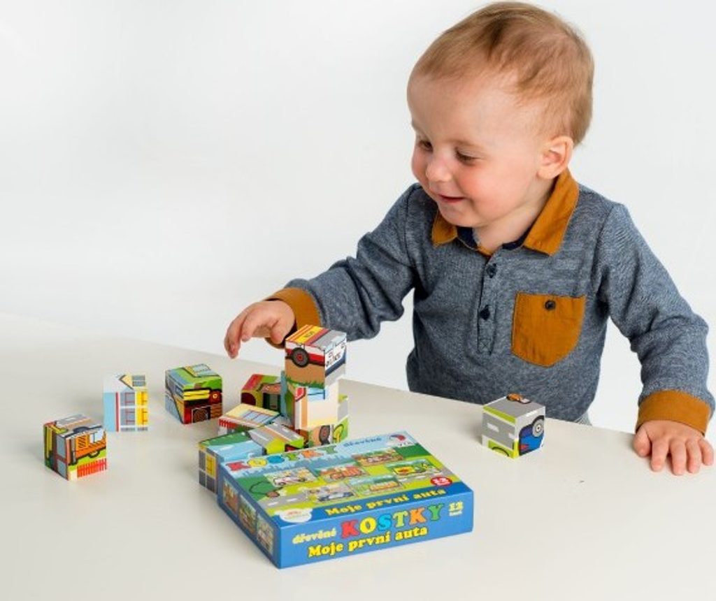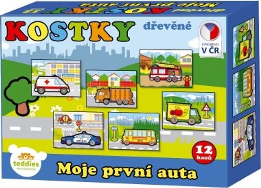 Dřevěné kostky s obrázky dopravních prostředků. Kostky s motivy aut jsou uloženy v praktické papírové krabičce. Balení obsahuje předlohy pro snadnější skládání.