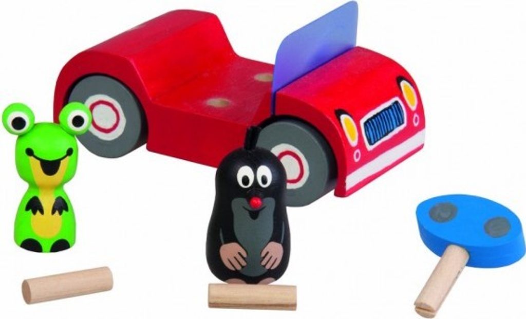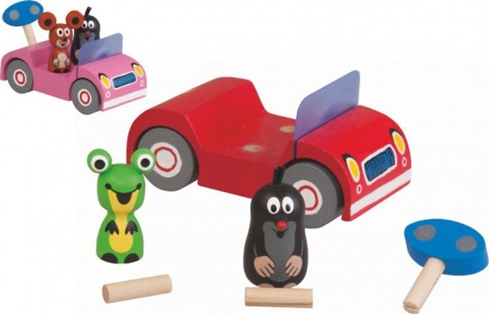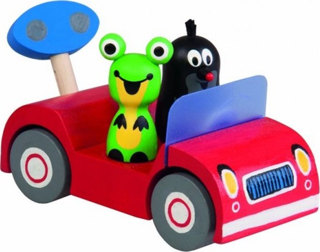 Dřevěný pískající krtek v autíčku. Velikost 7 cm. Vhodné od 12 měsíců.