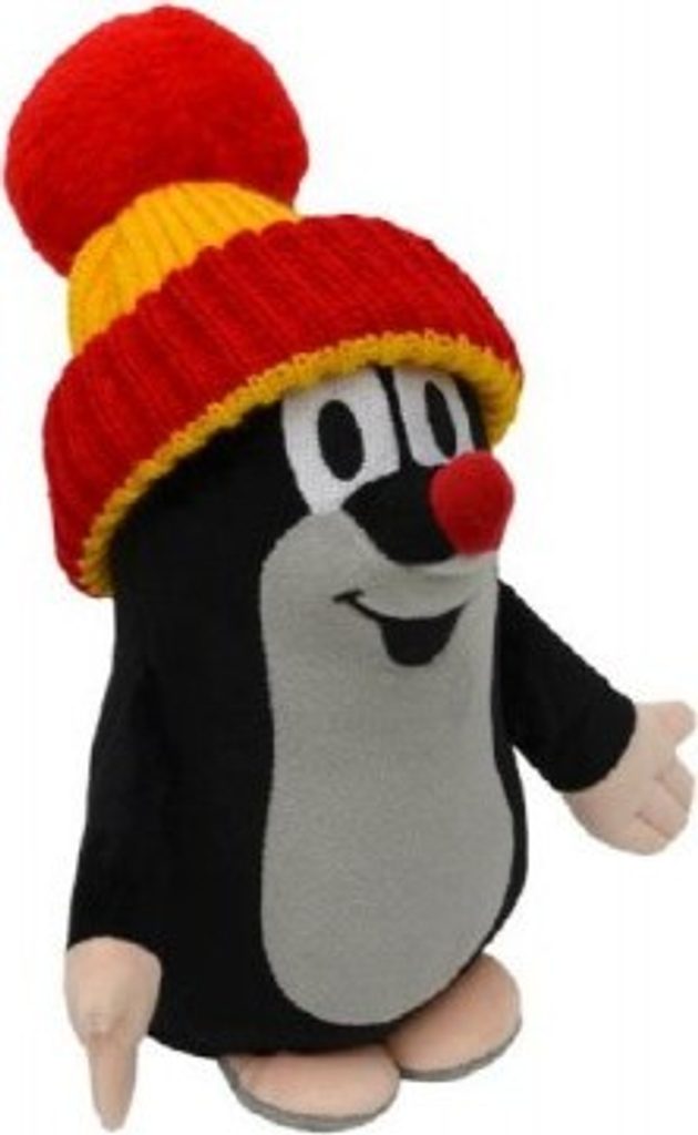 Plyšový Krteček s pletenou sundavací čepicí. Hračka je ve spodní části naplněna "antistresovými fazolkami" pro stabilizaci polohy a rozvoj citu a hmatu dětí.