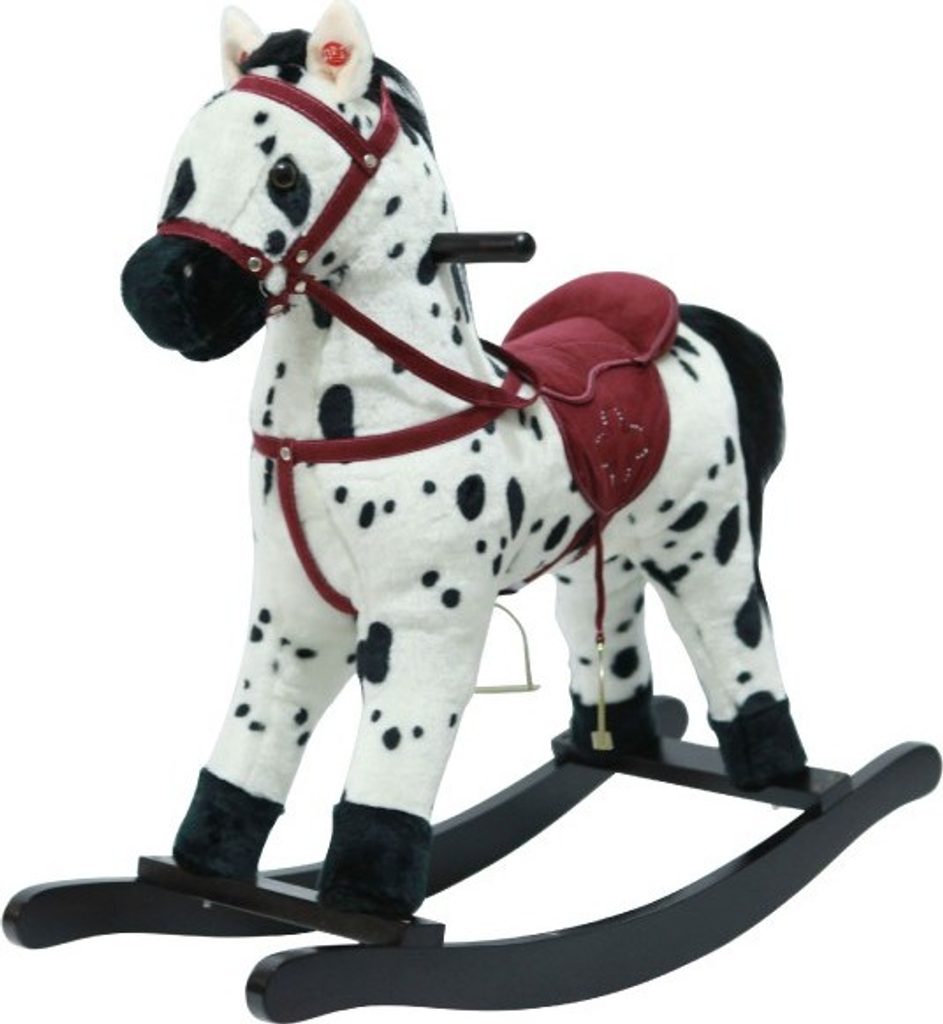 Heboučký houpací kůň po zmáčknutí ouška řehtá a hýbe ocáskem. Po zmáčknutí druhého ouška vydává zvuky klapotu podkov při klusu a hýbe ocáskem. Baterie se vkládají do pouzdra umístěného na bříšku. Hračka pomáhá dítěti rozvíjet koordinaci pohybů a podněcuje jeho představivost. Návod na sestavení a vložení baterií je uvnitř krabice. 3ks baterií AA nejsou součástí balení. Nosnost 50 kg. Výška koně: 71 cm Výška sedla: 47 cm